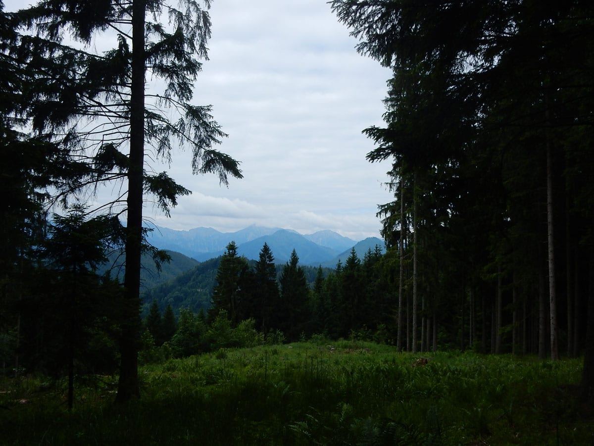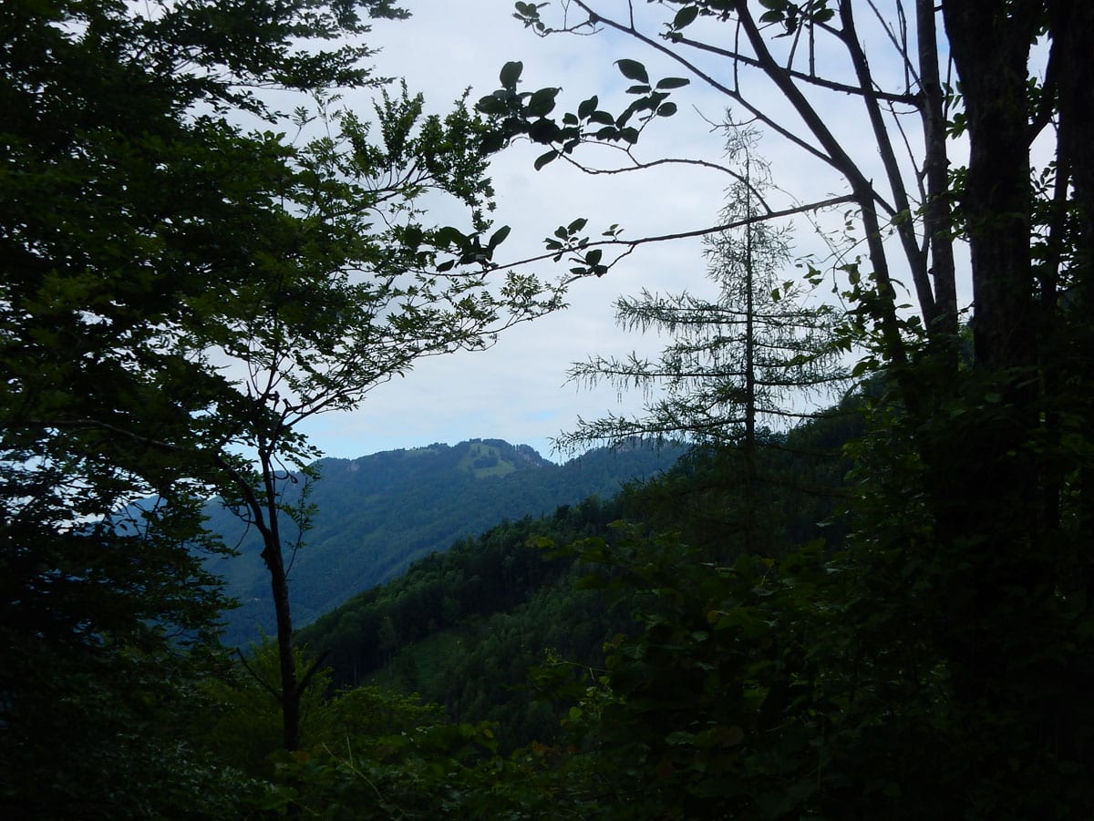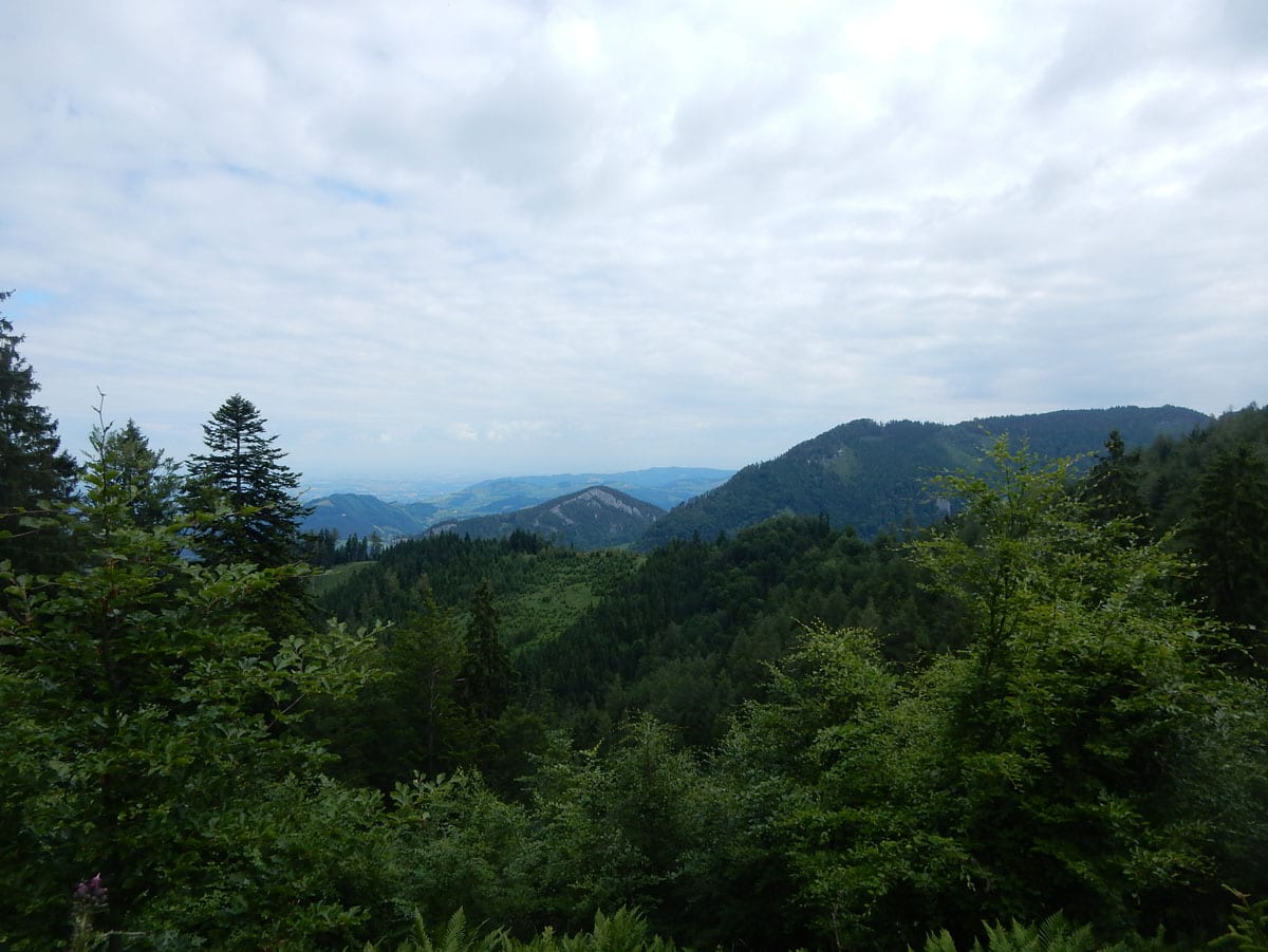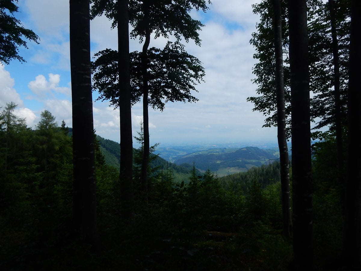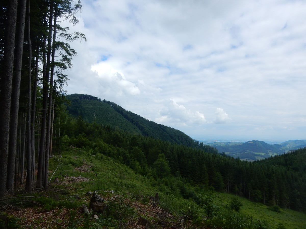 Dann zum Gipfel mit Namen, dafür aber ohne Aussicht (1,079m) und steil über den Nordabhang hinunter. Auf einem schönen Aussichtsplatz (Blick bis ins Mühlviertel) gibt es Jause und dann folgt das letzte weglose Stück hinunter bis zu einer Forststraße (Höhe jetzt: 807m). Die müdet später in eine andere Forststraße über die wir in die Mösern und somit in bekanntes Gebiet kommen.