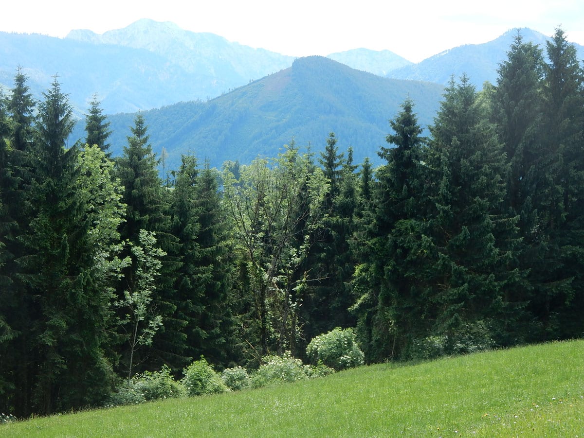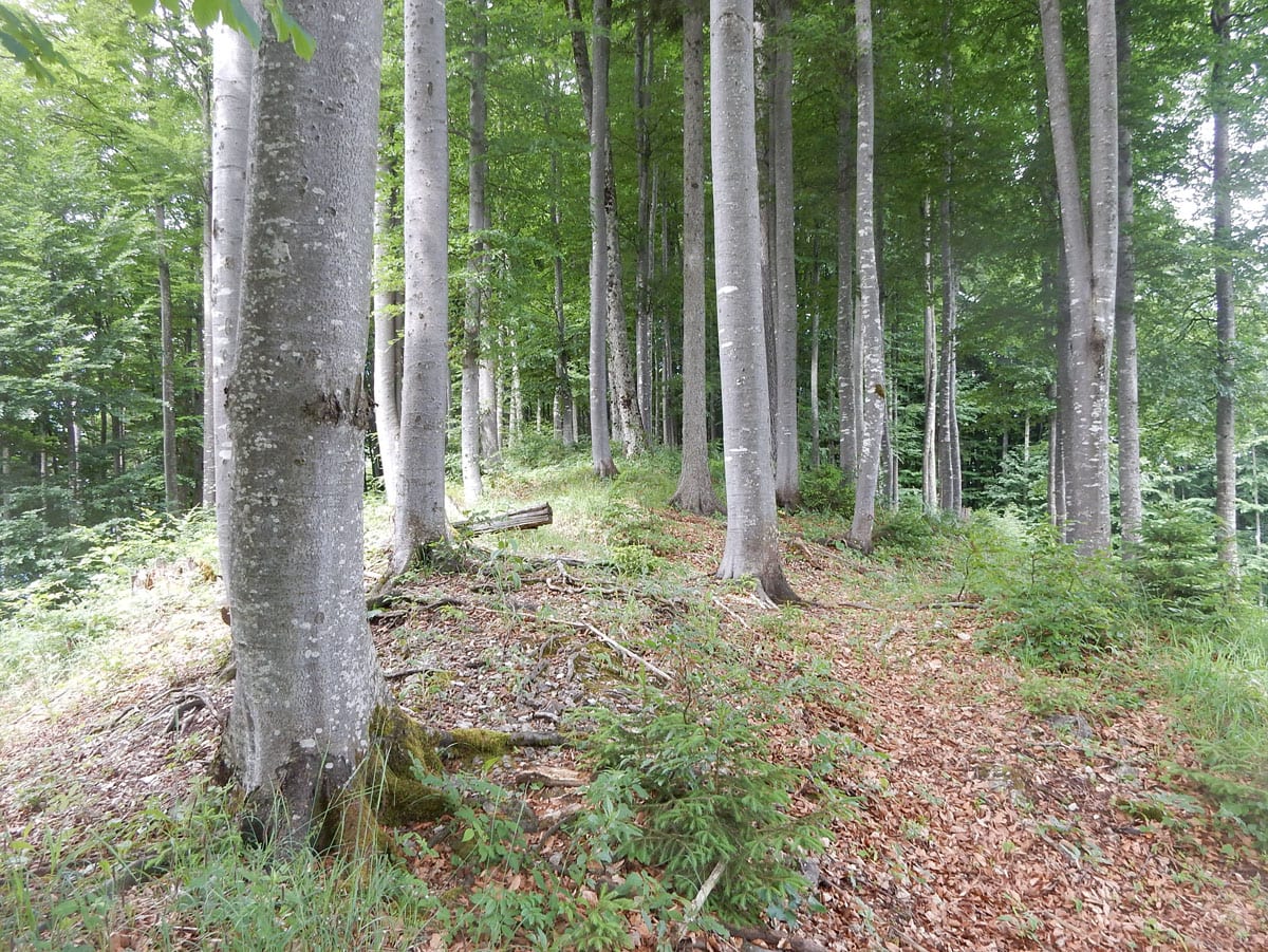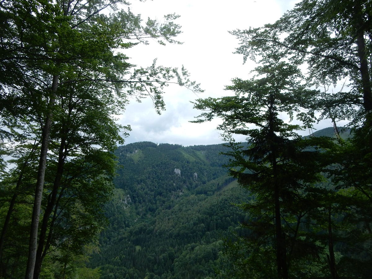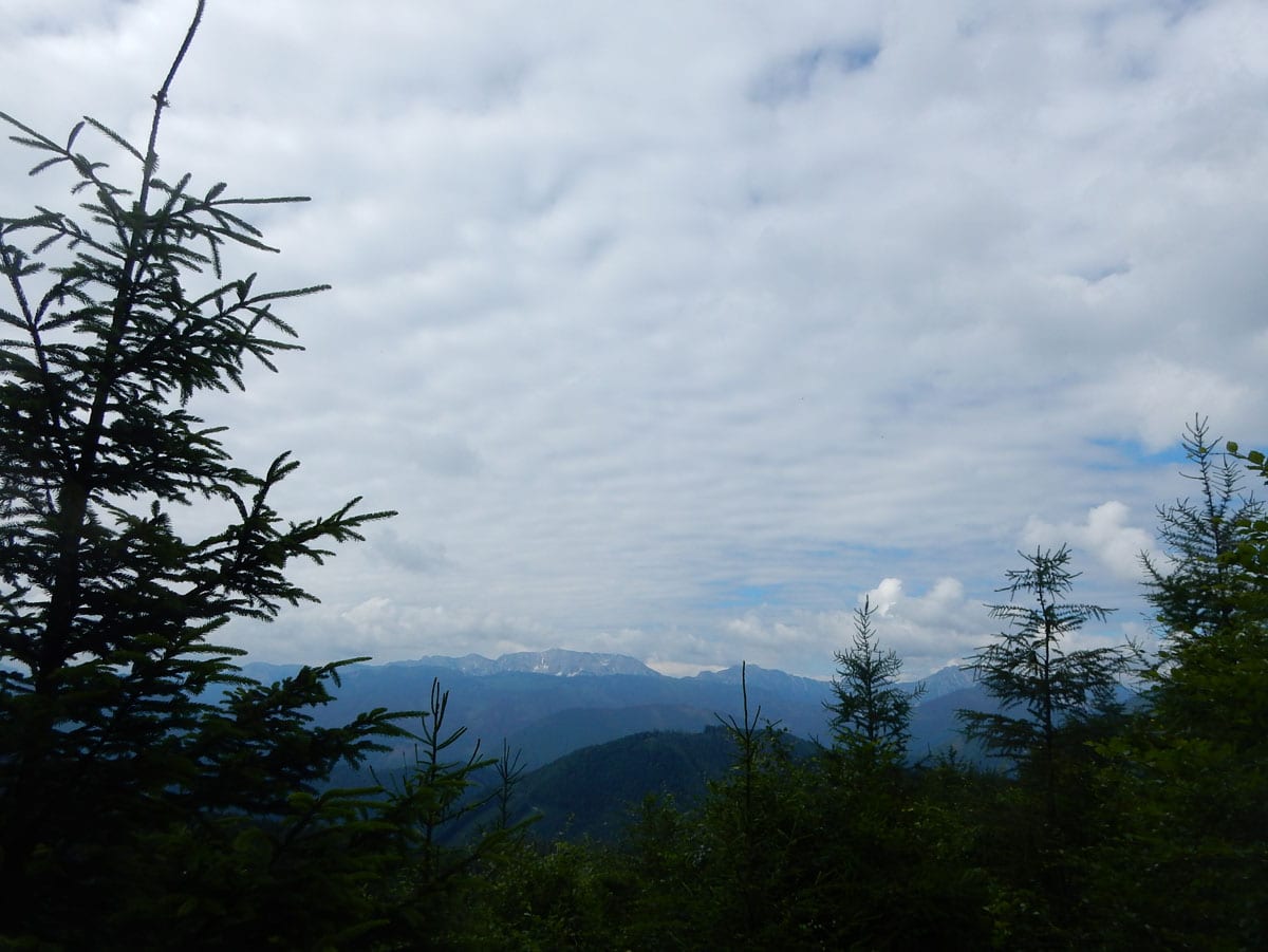Dann zum Gipfel mit Namen, dafür aber ohne Aussicht (1,079m) und steil über den Nordabhang hinunter. Auf einem schönen Aussichtsplatz (Blick bis ins Mühlviertel) gibt es Jause und dann folgt das letzte weglose Stück hinunter bis zu einer Forststraße (Höhe jetzt: 807m). Die müdet später in eine andere Forststraße über die wir in die Mösern und somit in bekanntes Gebiet kommen.