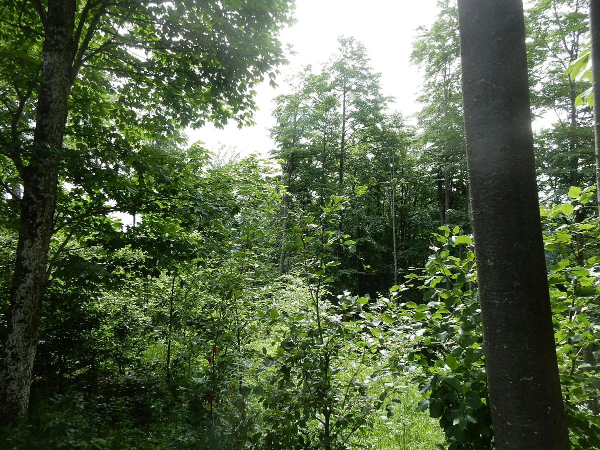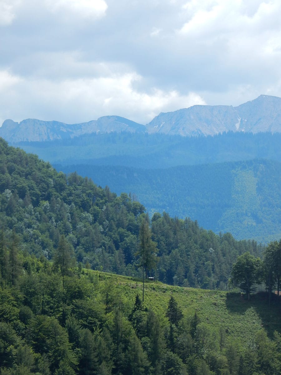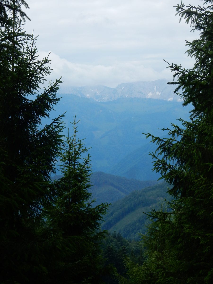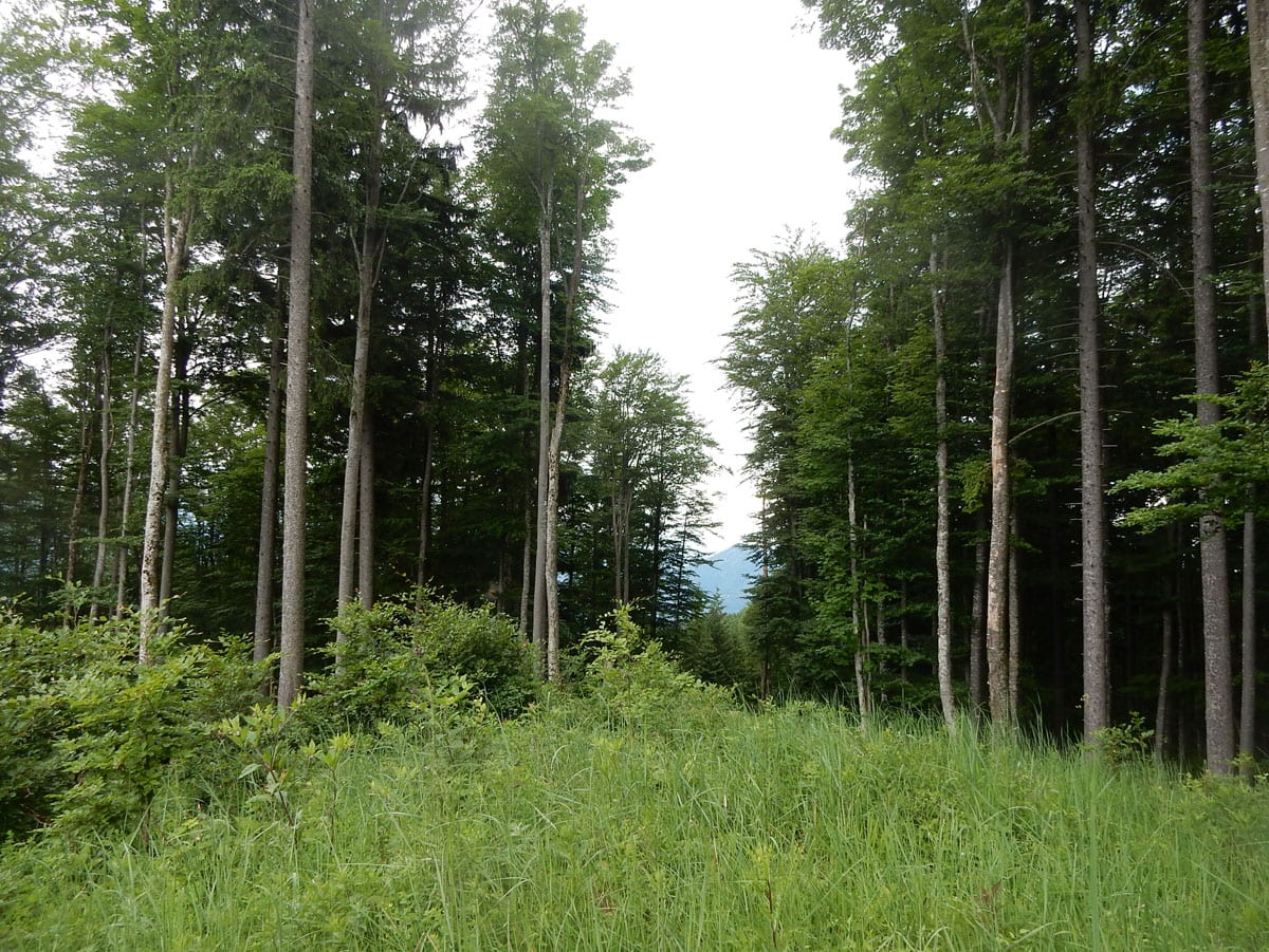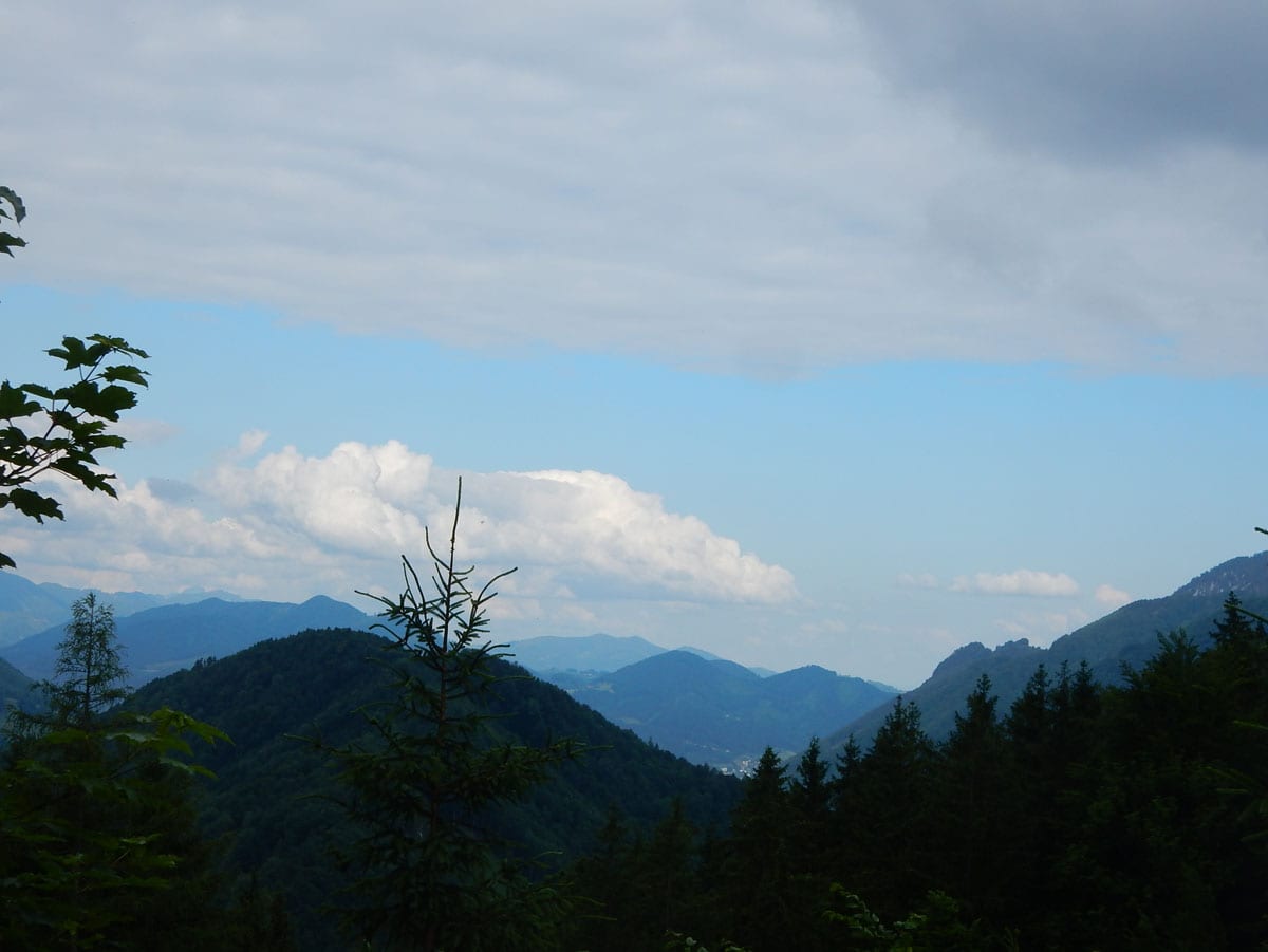 Dann zum Gipfel mit Namen, dafür aber ohne Aussicht (1,079m) und steil über den Nordabhang hinunter. Auf einem schönen Aussichtsplatz (Blick bis ins Mühlviertel) gibt es Jause und dann folgt das letzte weglose Stück hinunter bis zu einer Forststraße (Höhe jetzt: 807m). Die müdet später in eine andere Forststraße über die wir in die Mösern und somit in bekanntes Gebiet kommen.