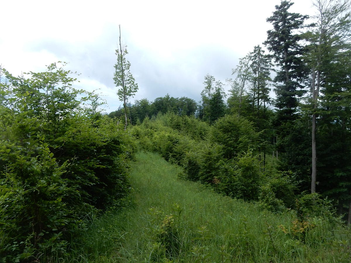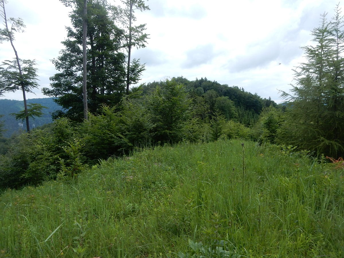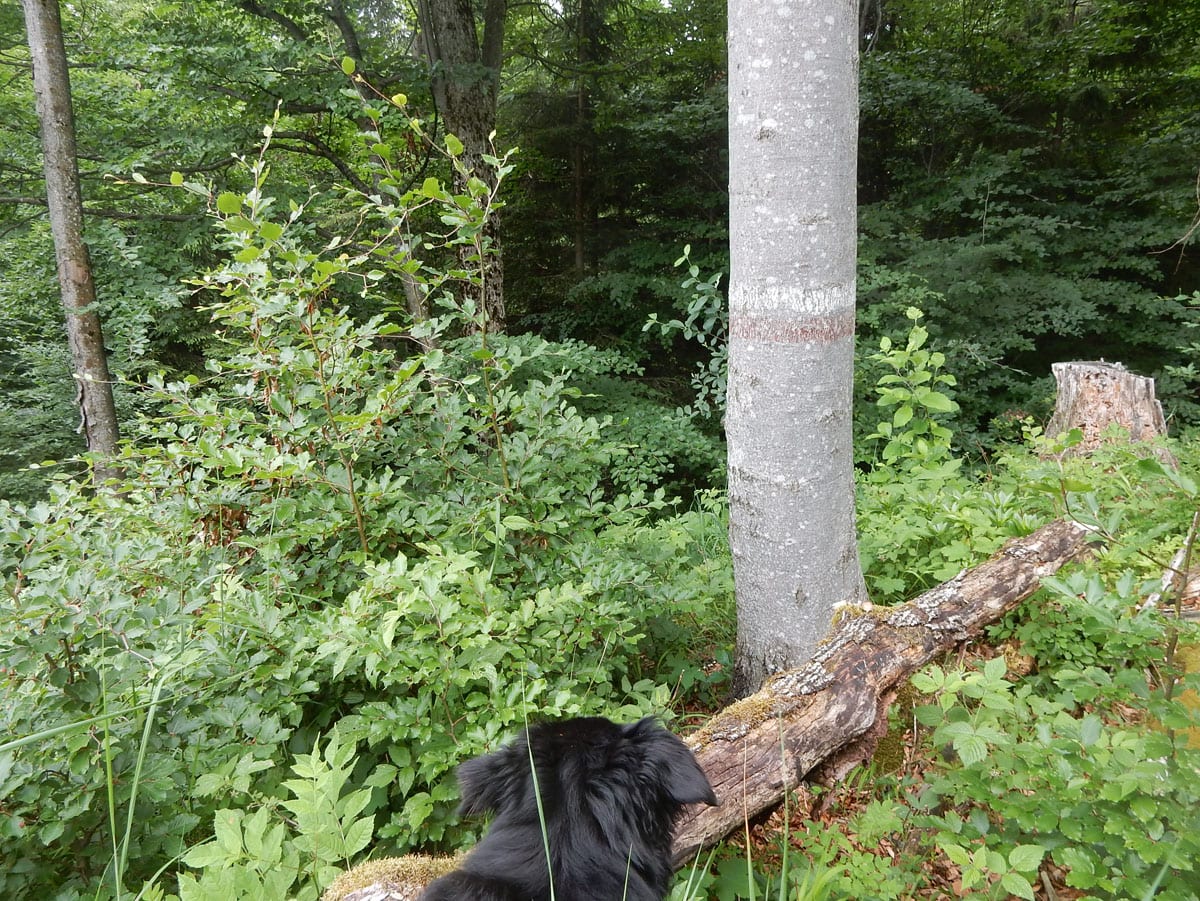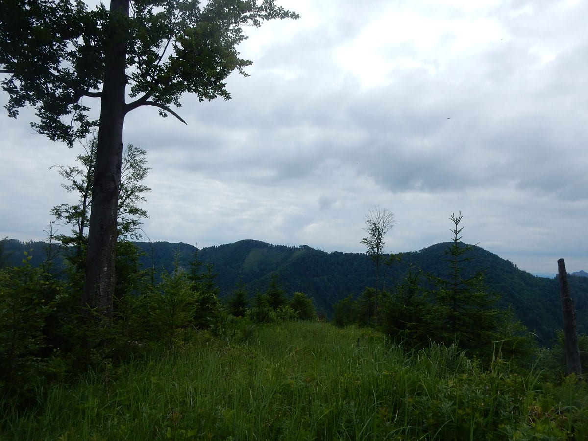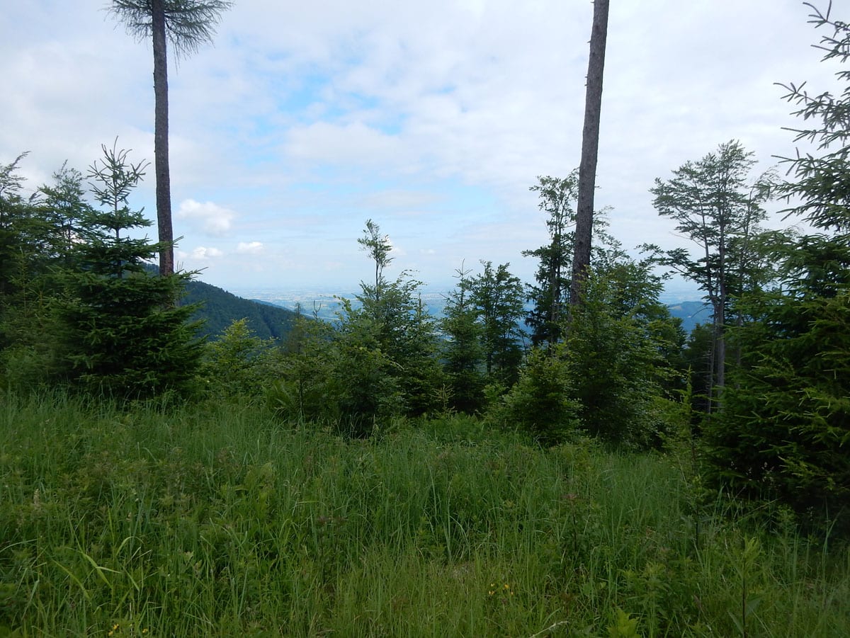 Den Weg müssen wir uns aber selbst aber, denn der, den es hier einmal gab, der ist längst komplett verwachsen und nicht zu finden. Hin und wieder treffen wir auf ein paar vergilbte Markierungen, aber die helfen auch nicht weiter. Bevor wir zum Gipfel kommen, biegen wir oben nach rechts ab, denn dort gibt es einen zweiten, namenlosen Gipfel, der fast genauso hoch ist (1.076m) ist. Keine Name, aber dafür mit viel Aussicht.