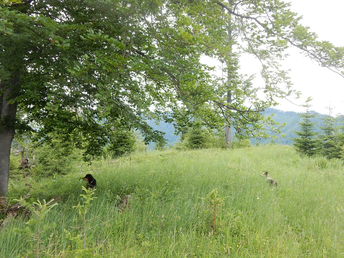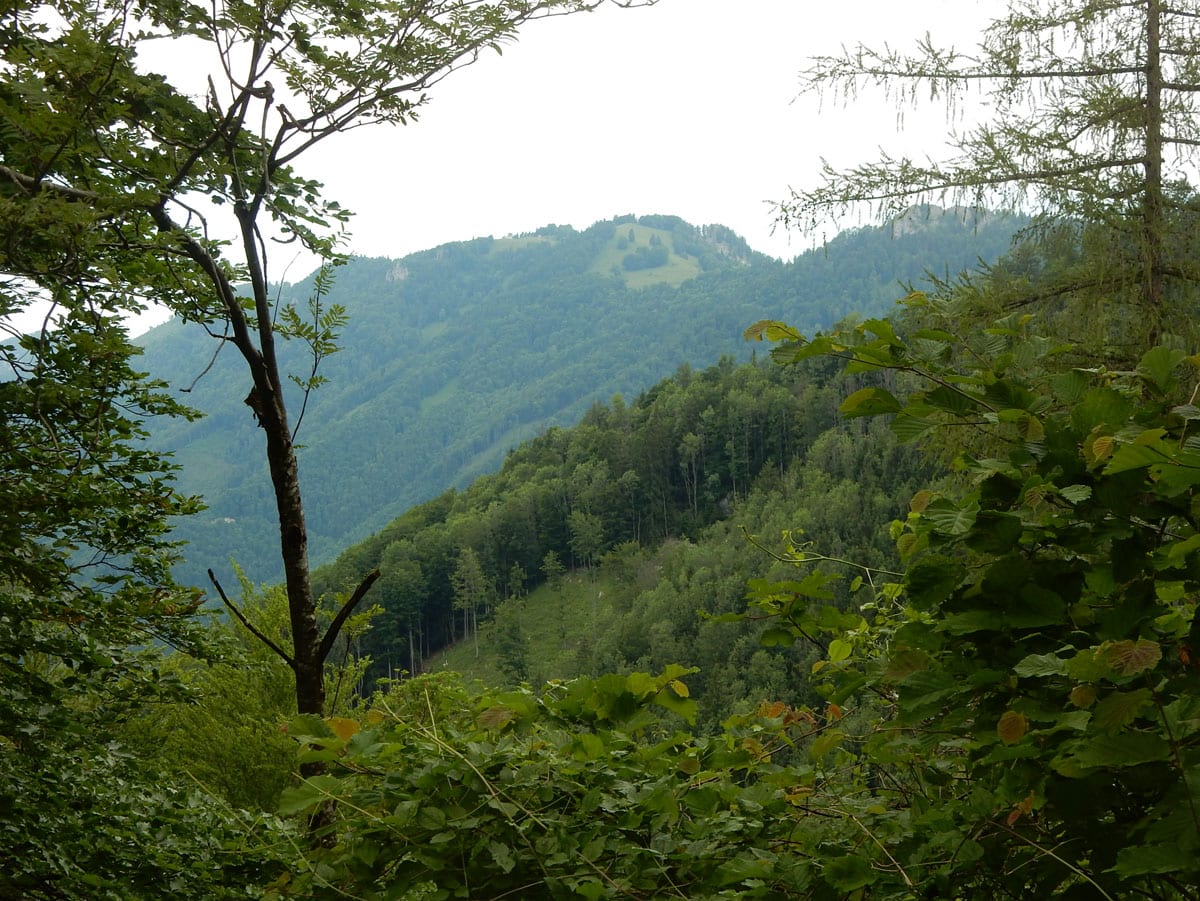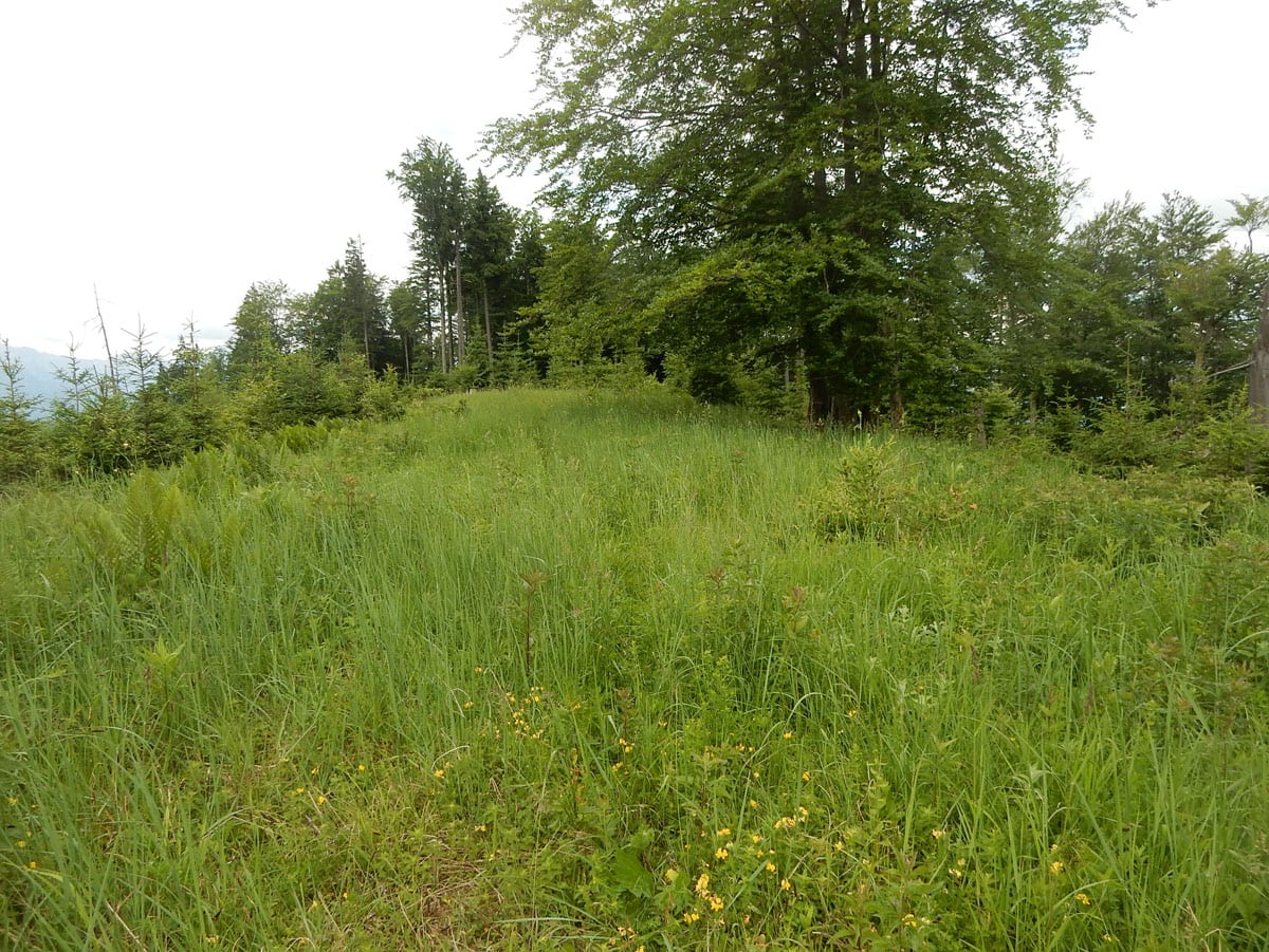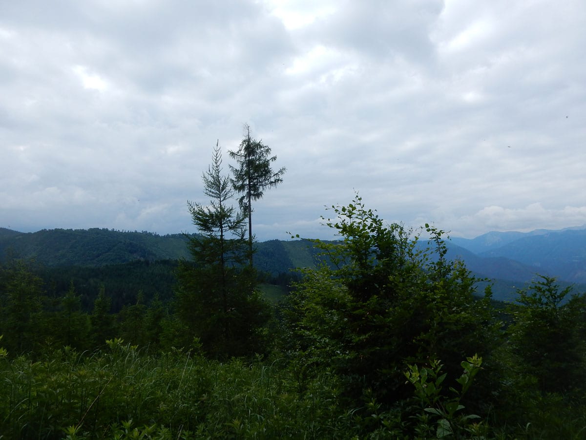 Den Weg müssen wir uns aber selbst aber, denn der, den es hier einmal gab, der ist längst komplett verwachsen und nicht zu finden. Hin und wieder treffen wir auf ein paar vergilbte Markierungen, aber die helfen auch nicht weiter. Bevor wir zum Gipfel kommen, biegen wir oben nach rechts ab, denn dort gibt es einen zweiten, namenlosen Gipfel, der fast genauso hoch ist (1.076m) ist. Keine Name, aber dafür mit viel Aussicht.