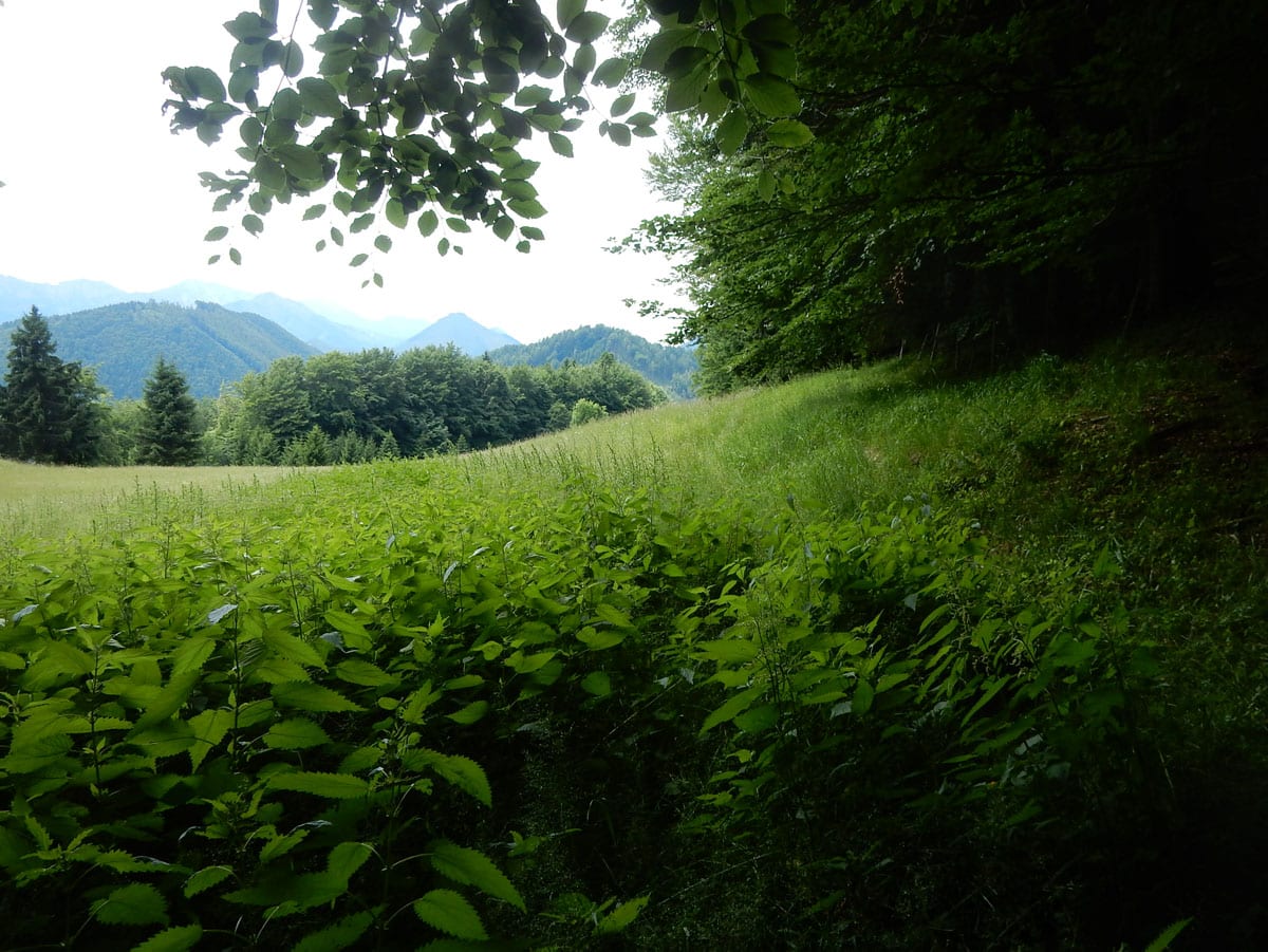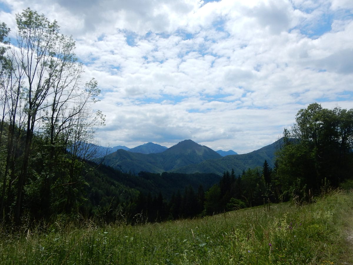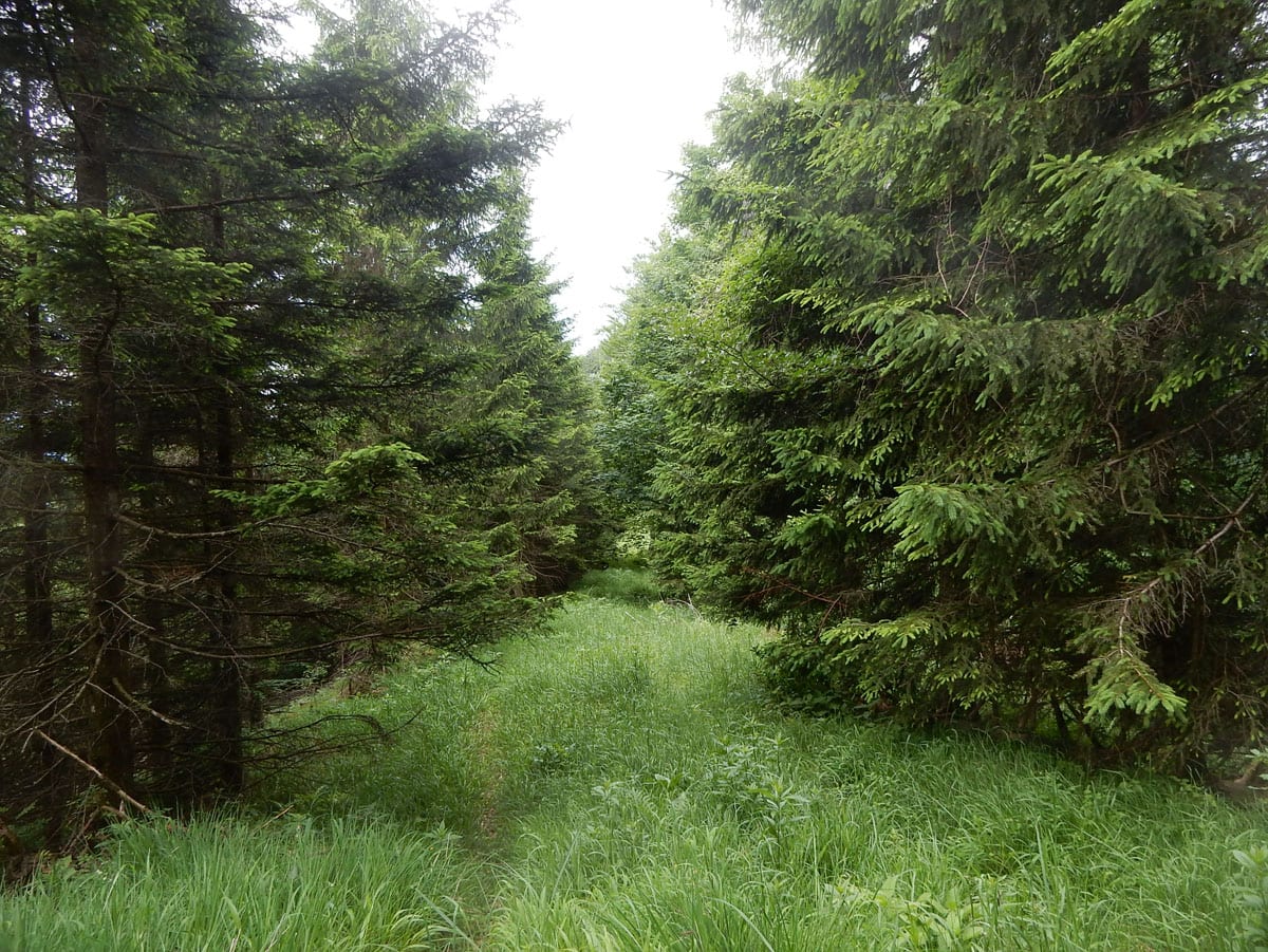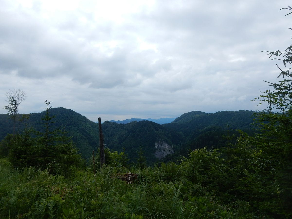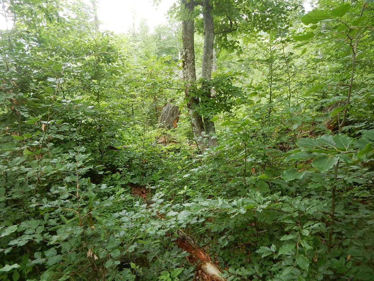 Den Weg müssen wir uns aber selbst aber, denn der, den es hier einmal gab, der ist längst komplett verwachsen und nicht zu finden. Hin und wieder treffen wir auf ein paar vergilbte Markierungen, aber die helfen auch nicht weiter. Bevor wir zum Gipfel kommen, biegen wir oben nach rechts ab, denn dort gibt es einen zweiten, namenlosen Gipfel, der fast genauso hoch ist (1.076m) ist. Keine Name, aber dafür mit viel Aussicht.