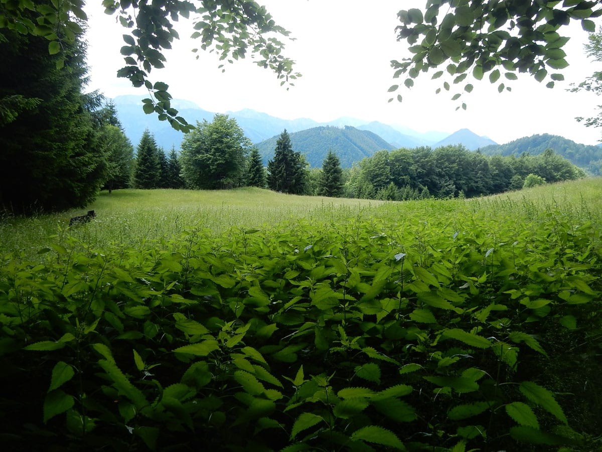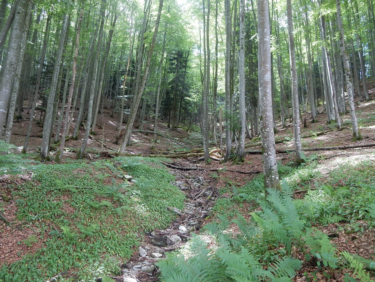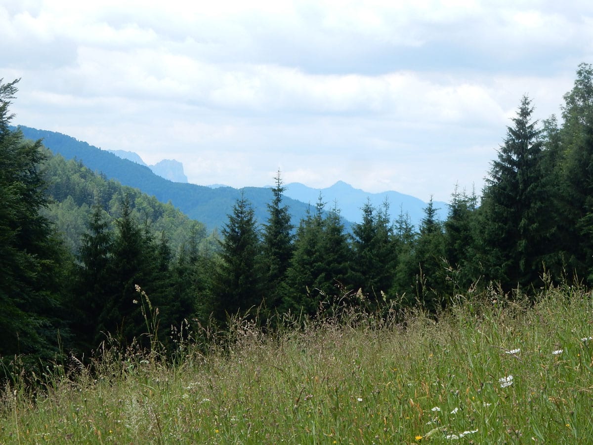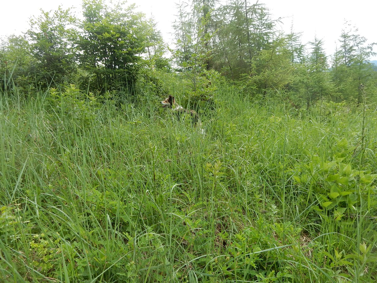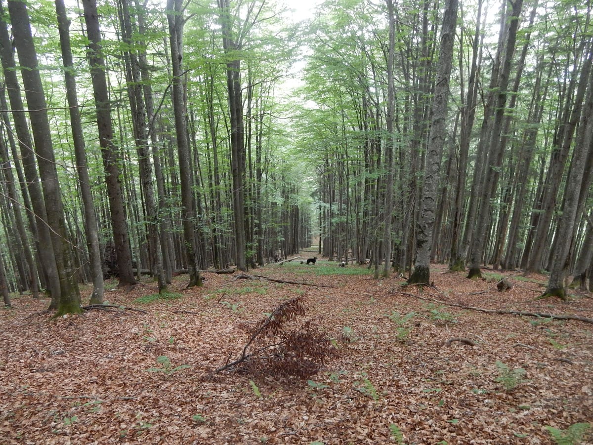 Den Weg müssen wir uns aber selbst aber, denn der, den es hier einmal gab, der ist längst komplett verwachsen und nicht zu finden. Hin und wieder treffen wir auf ein paar vergilbte Markierungen, aber die helfen auch nicht weiter. Bevor wir zum Gipfel kommen, biegen wir oben nach rechts ab, denn dort gibt es einen zweiten, namenlosen Gipfel, der fast genauso hoch ist (1.076m) ist. Keine Name, aber dafür mit viel Aussicht.