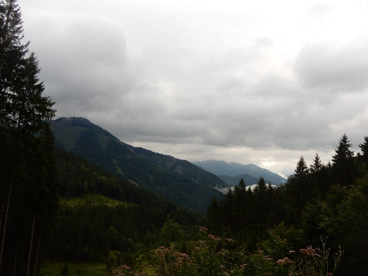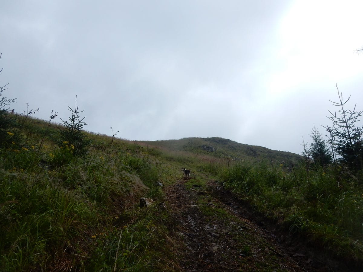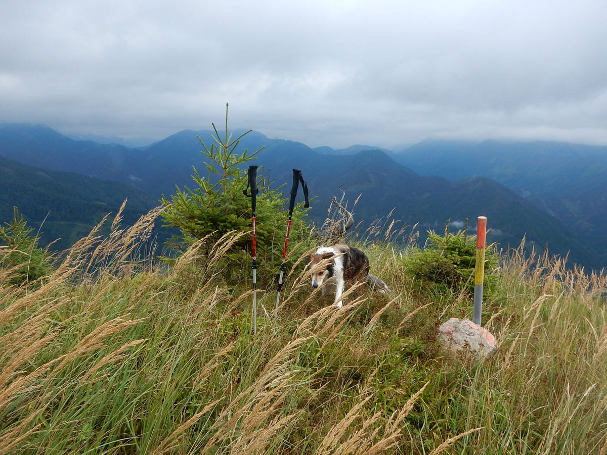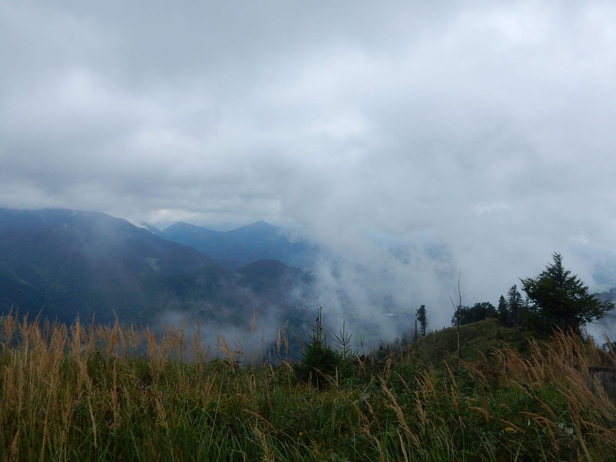 Nieselregen beim Start: das bedeutet angenehme Temperaturen und wenig Leute unterwegs. Auf der Niglalm bedeutet das aber auch, dass wir die ersten paar hundert Meter bergauf über den von den Kühen zertrampelten und gatschigen Weg gehen müssen … na ja, man kann nicht alles haben (und die Ronja freut sich eh über so was).