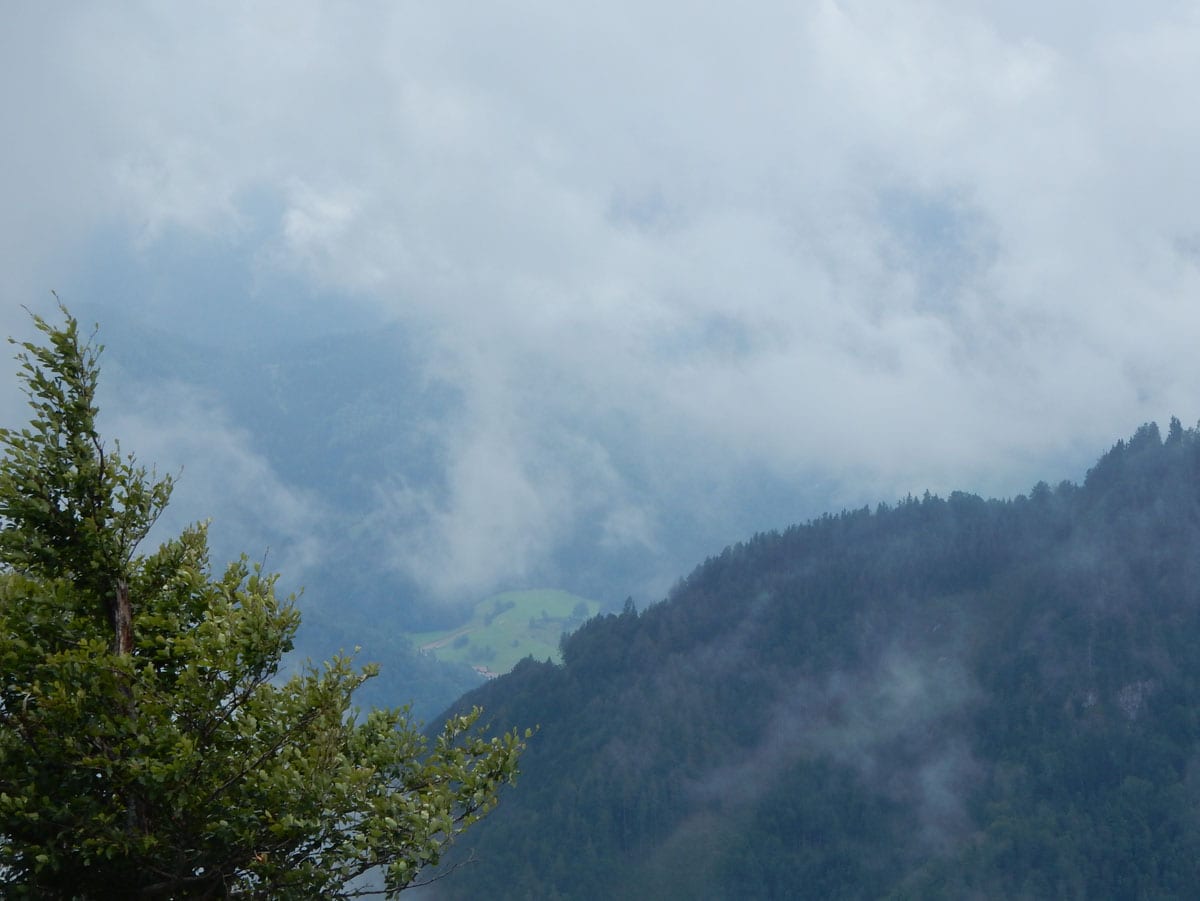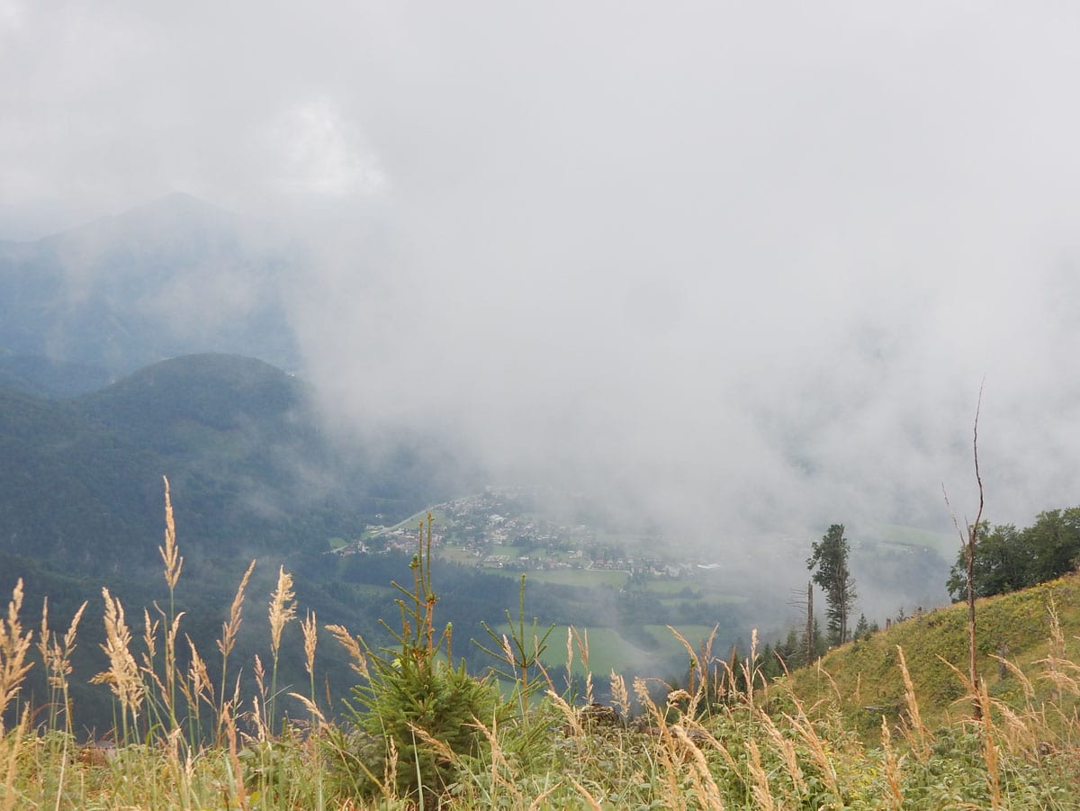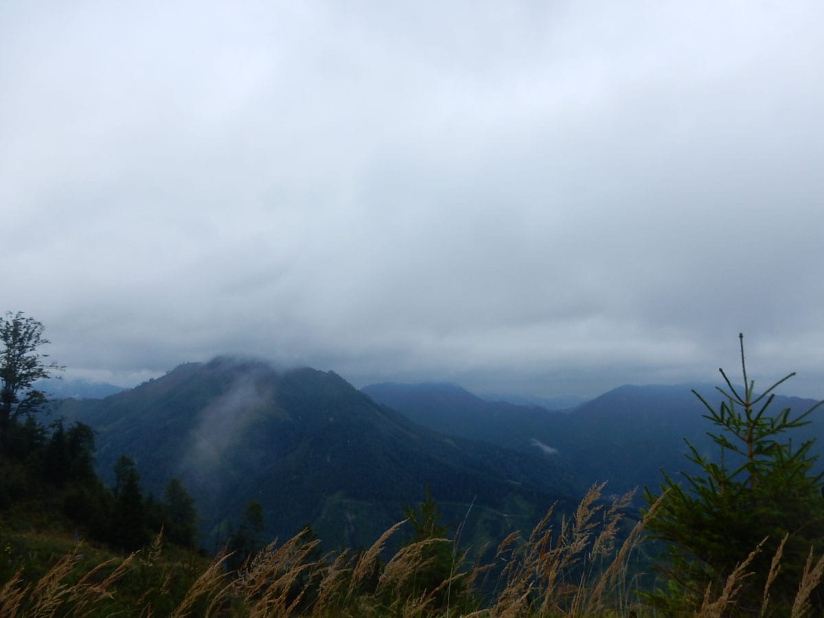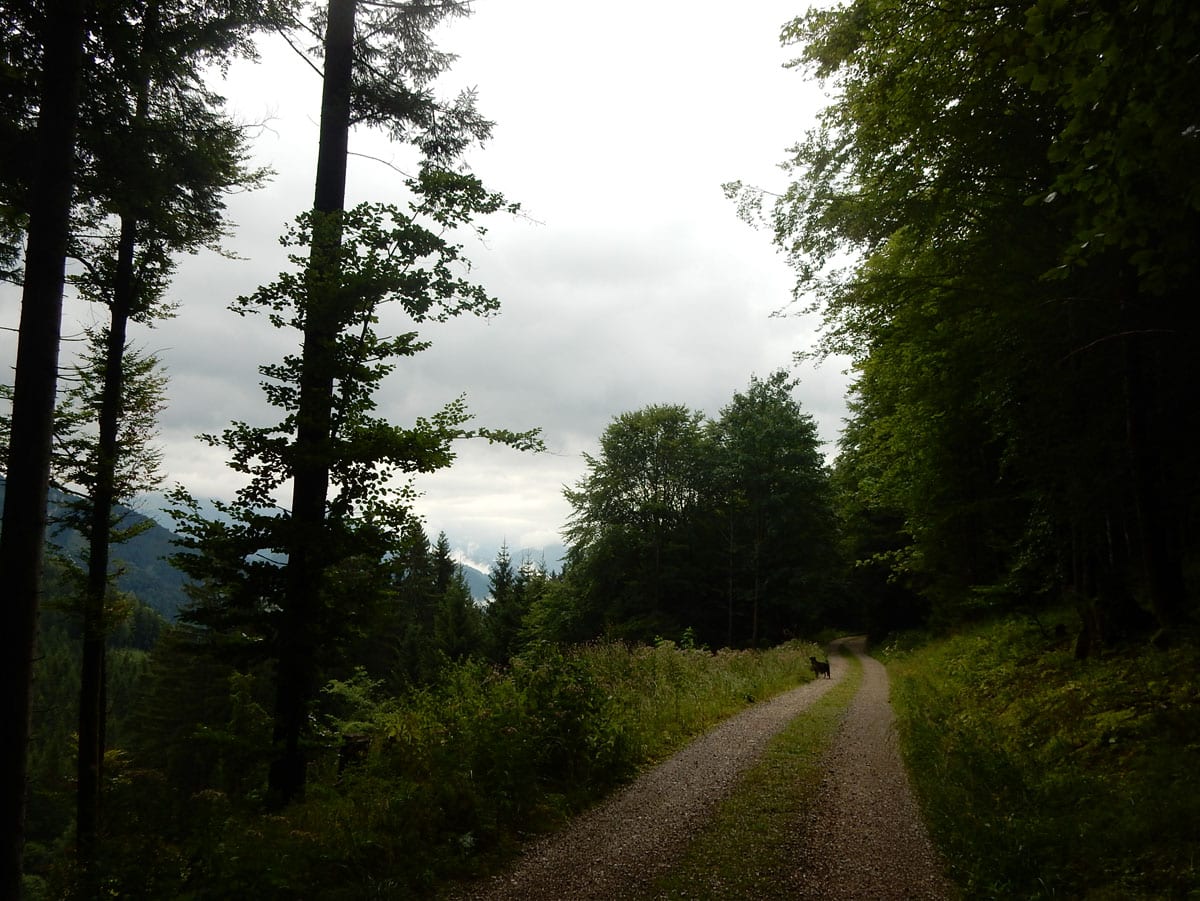 Nieselregen beim Start: das bedeutet angenehme Temperaturen und wenig Leute unterwegs. Auf der Niglalm bedeutet das aber auch, dass wir die ersten paar hundert Meter bergauf über den von den Kühen zertrampelten und gatschigen Weg gehen müssen … na ja, man kann nicht alles haben (und die Ronja freut sich eh über so was).