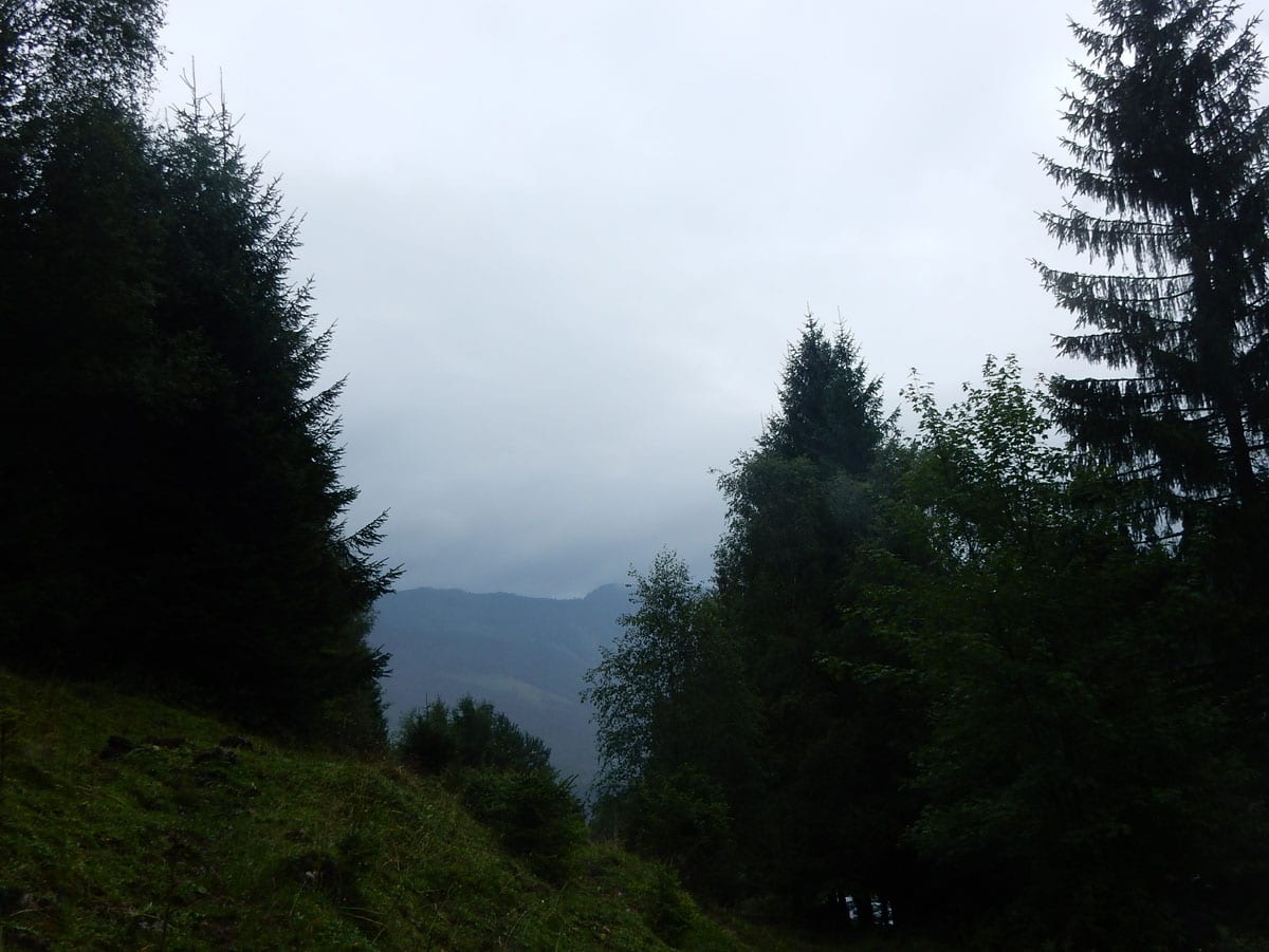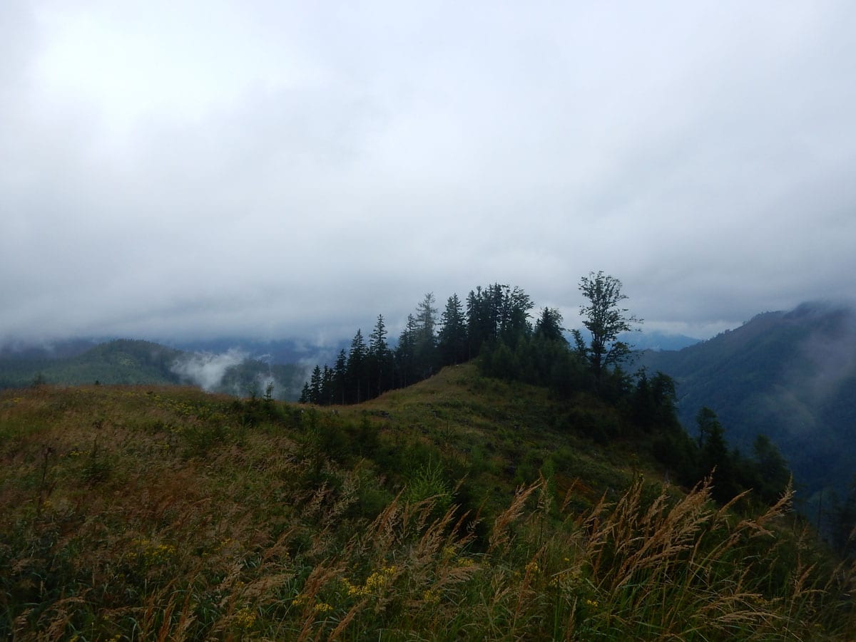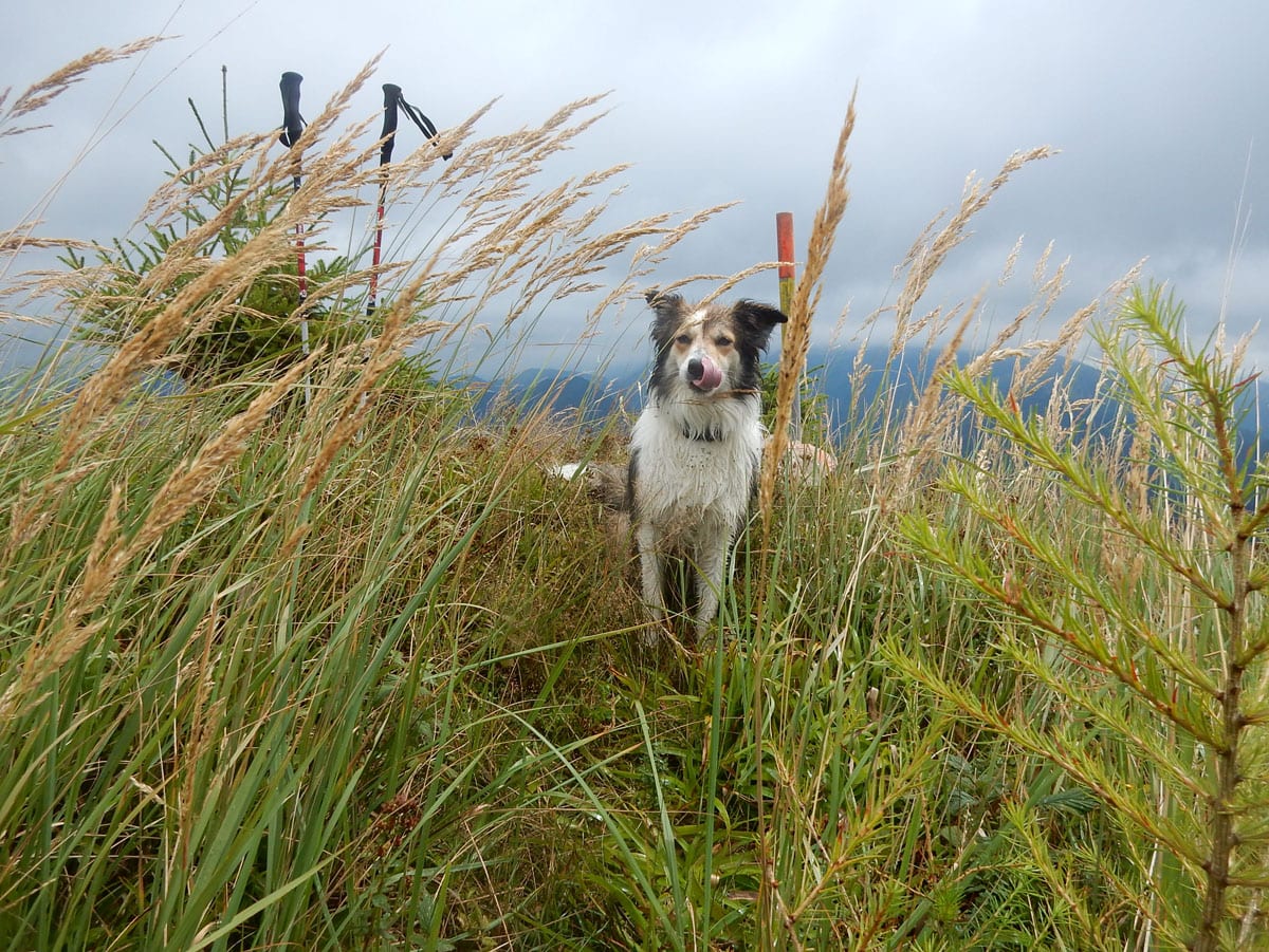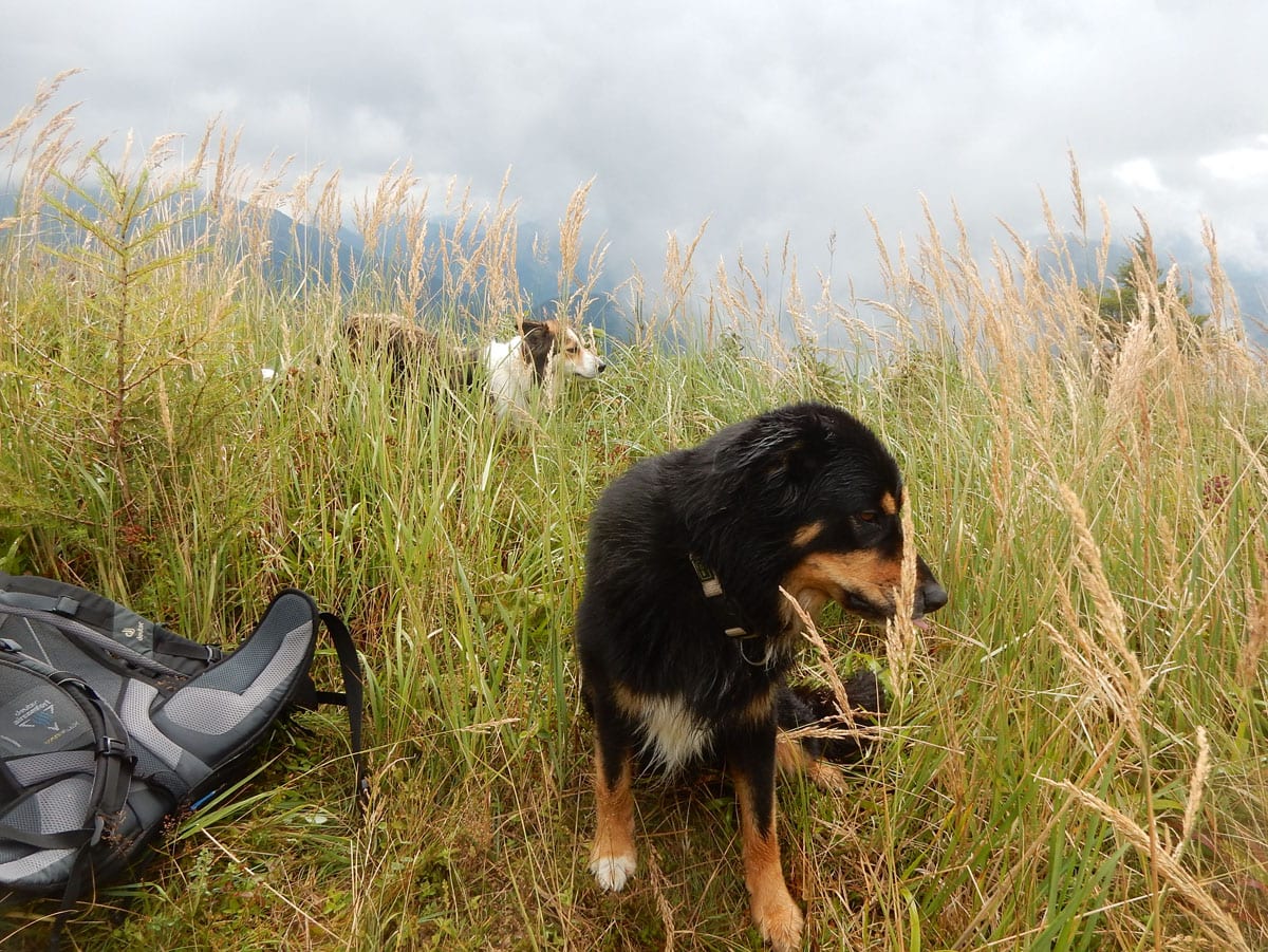 Nieselregen beim Start: das bedeutet angenehme Temperaturen und wenig Leute unterwegs. Auf der Niglalm bedeutet das aber auch, dass wir die ersten paar hundert Meter bergauf über den von den Kühen zertrampelten und gatschigen Weg gehen müssen … na ja, man kann nicht alles haben (und die Ronja freut sich eh über so was).