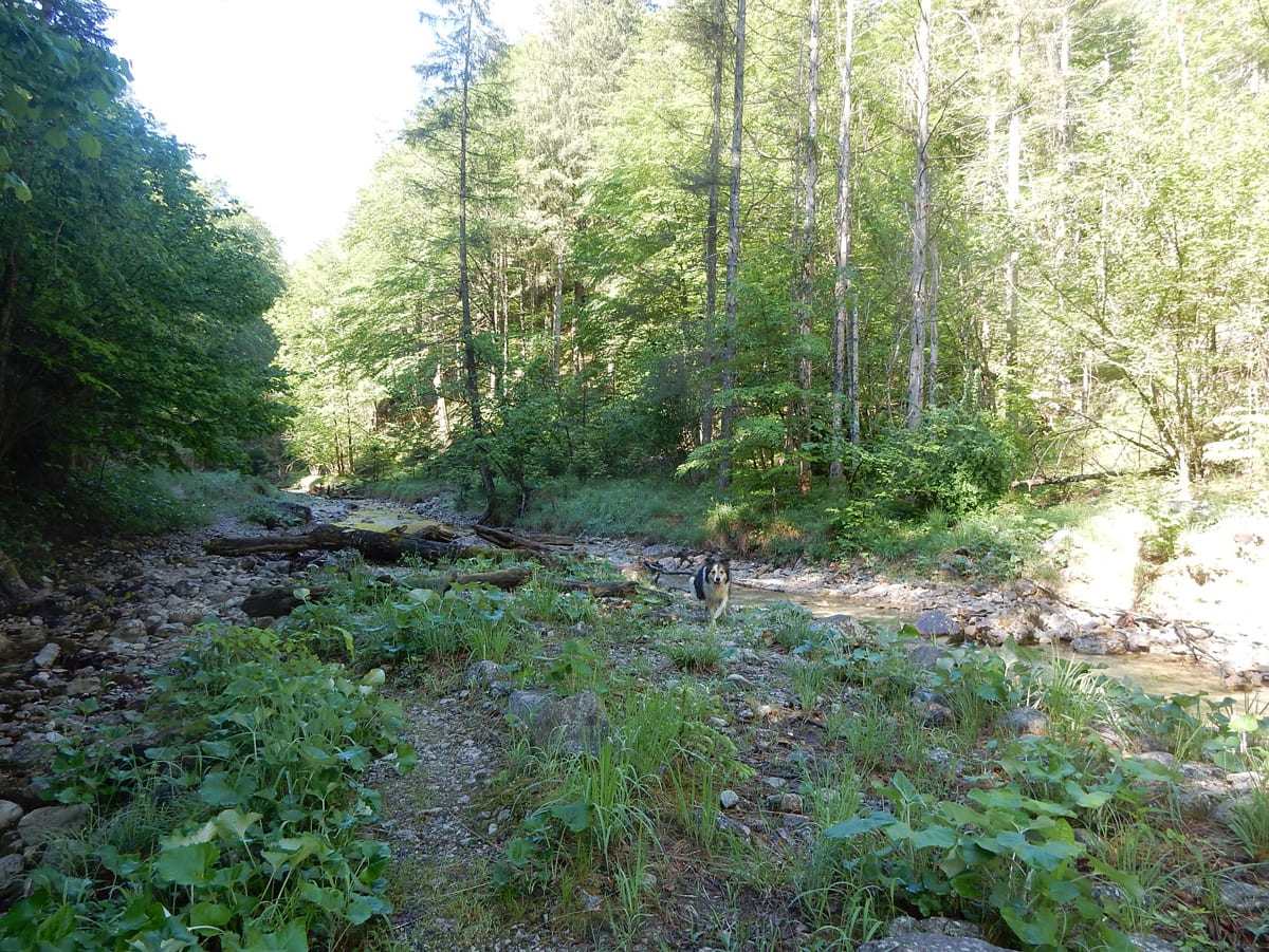 Gegen die Wärme hilft uns der Weissenbach und die Gewitter verschonen uns; nur auf den letzten Metern schaffen es ein paar Tropfen bis zu uns. Dazwischen treffen wir, nach langer Zeit wieder einmal, auf eine Familie Gemsen.