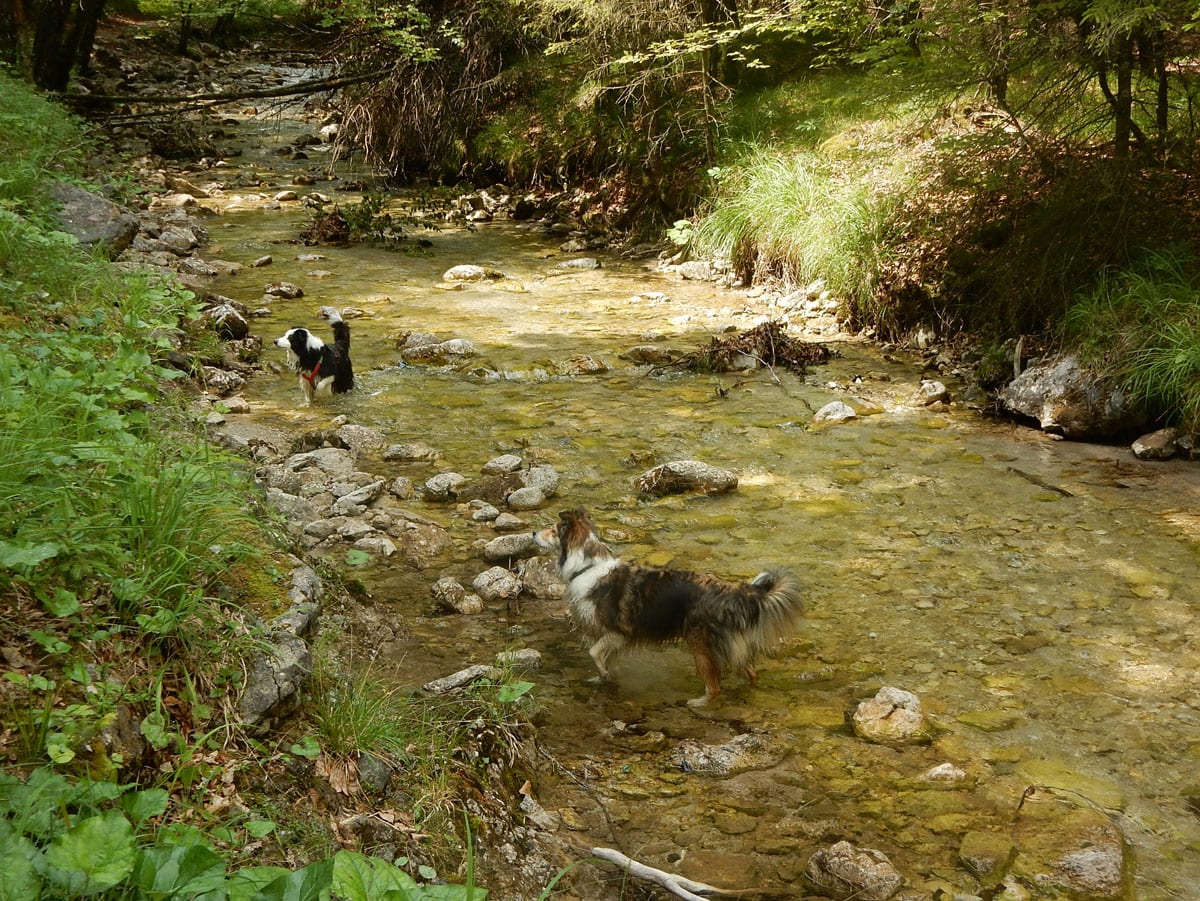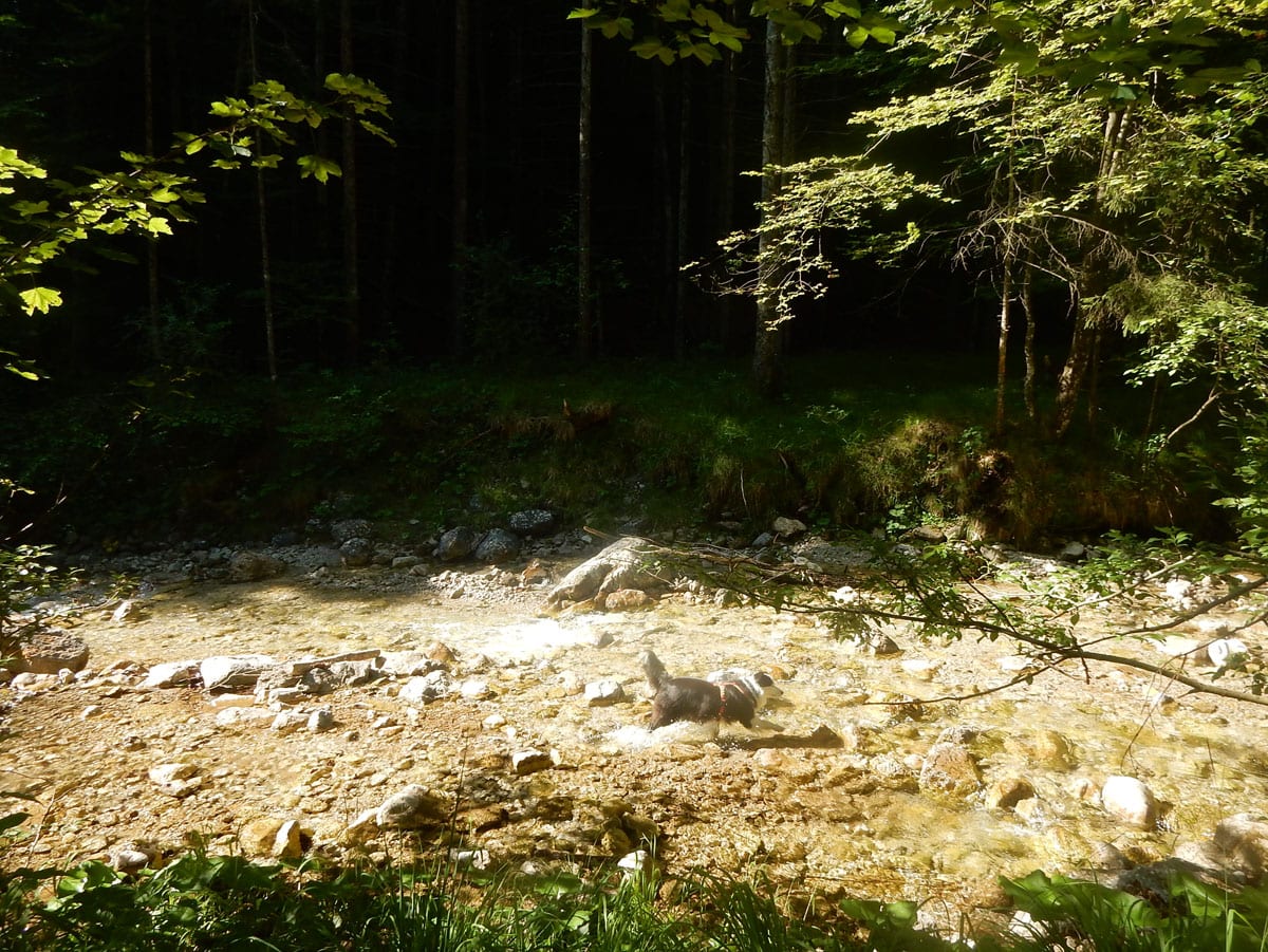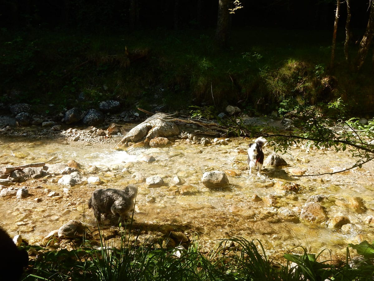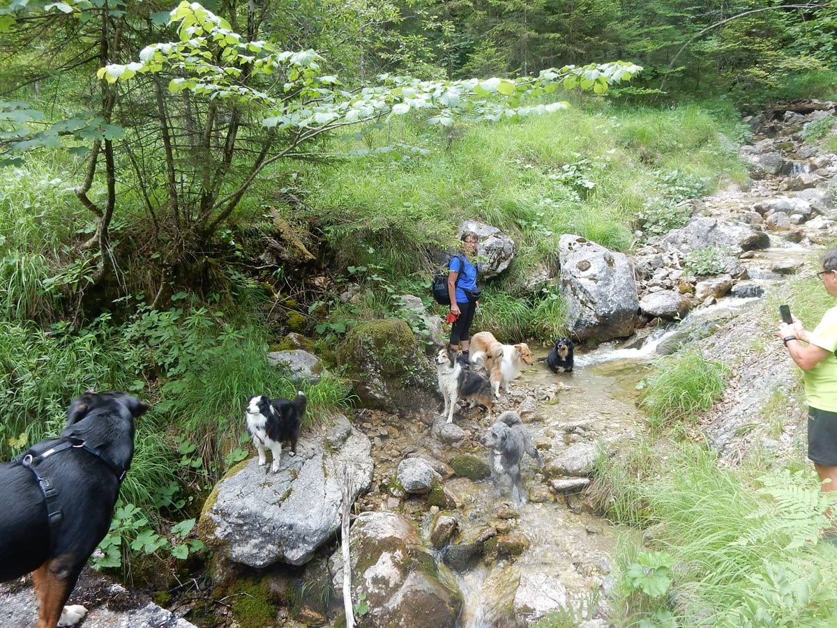 Mina springt bei jeder Gelegenheit in den Bach, nur die Ninja ist etwas zurückhaltend, wenn Wasser unter dem Füßen ist. Aber ganz zum Schluss geht sie schon sehr tapfer durch die Strömung von einem Ufer zum anderen. Und der Mato? Der ist wie immer gleichzeitig vorne, hinten, links, rechts, oben udn unten. Naja, die Buam halt.