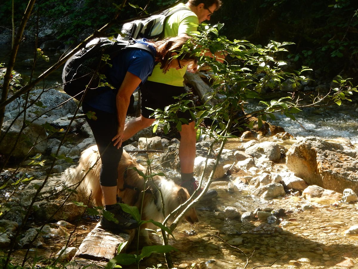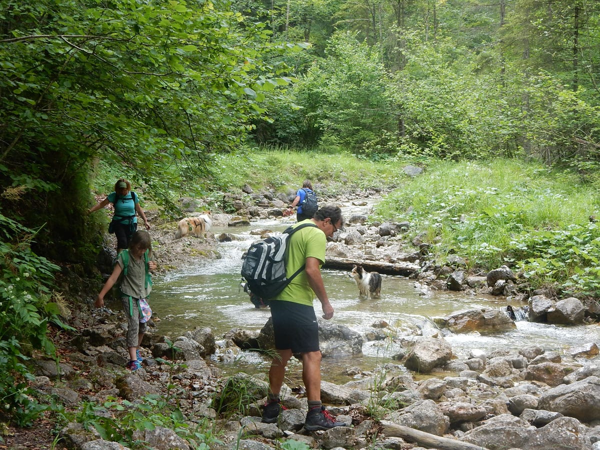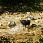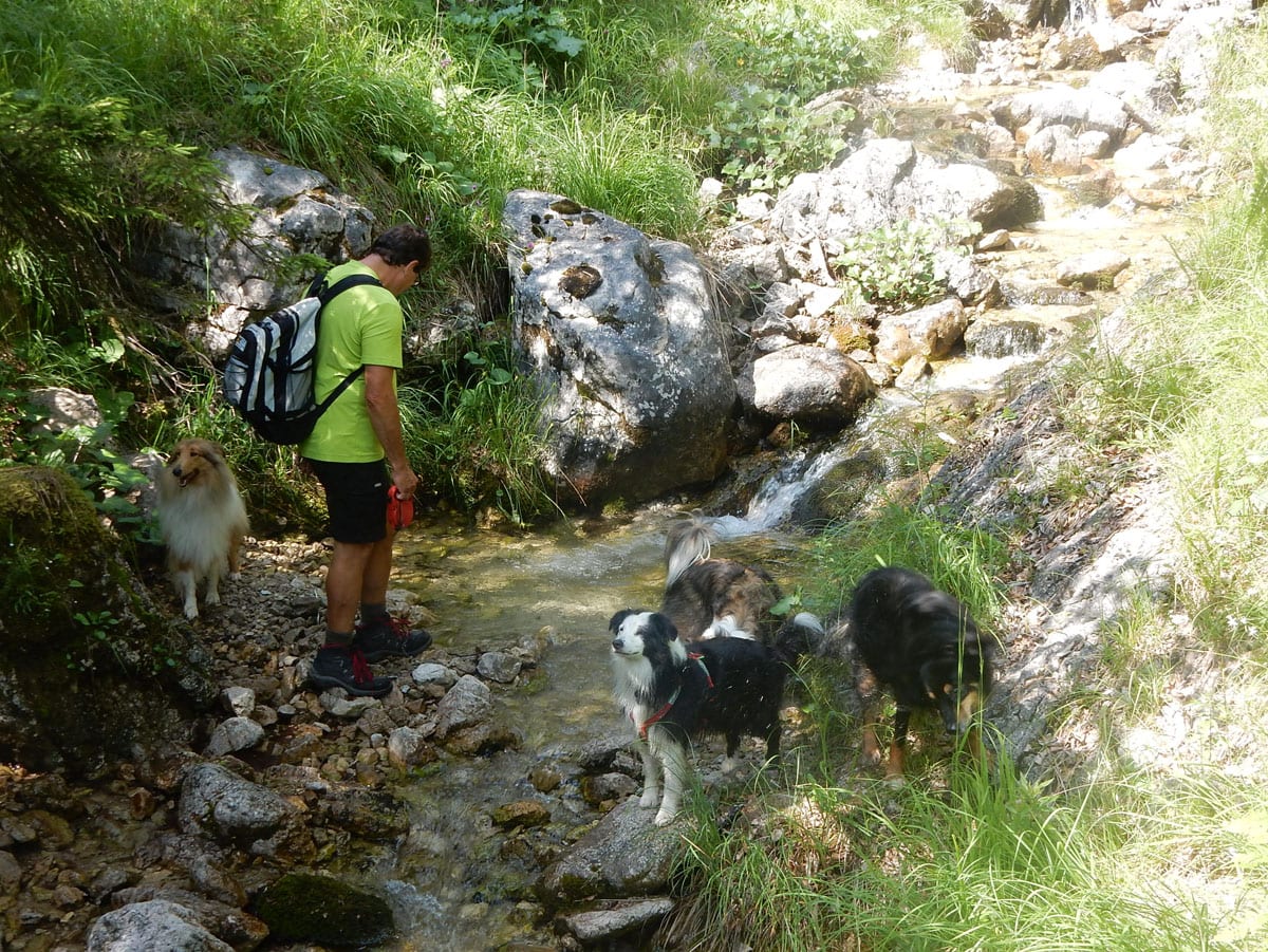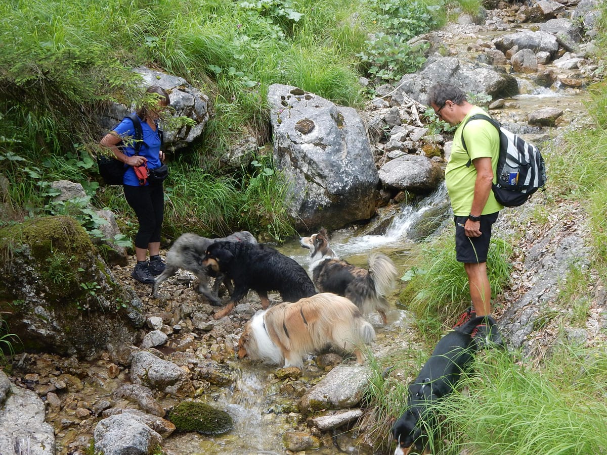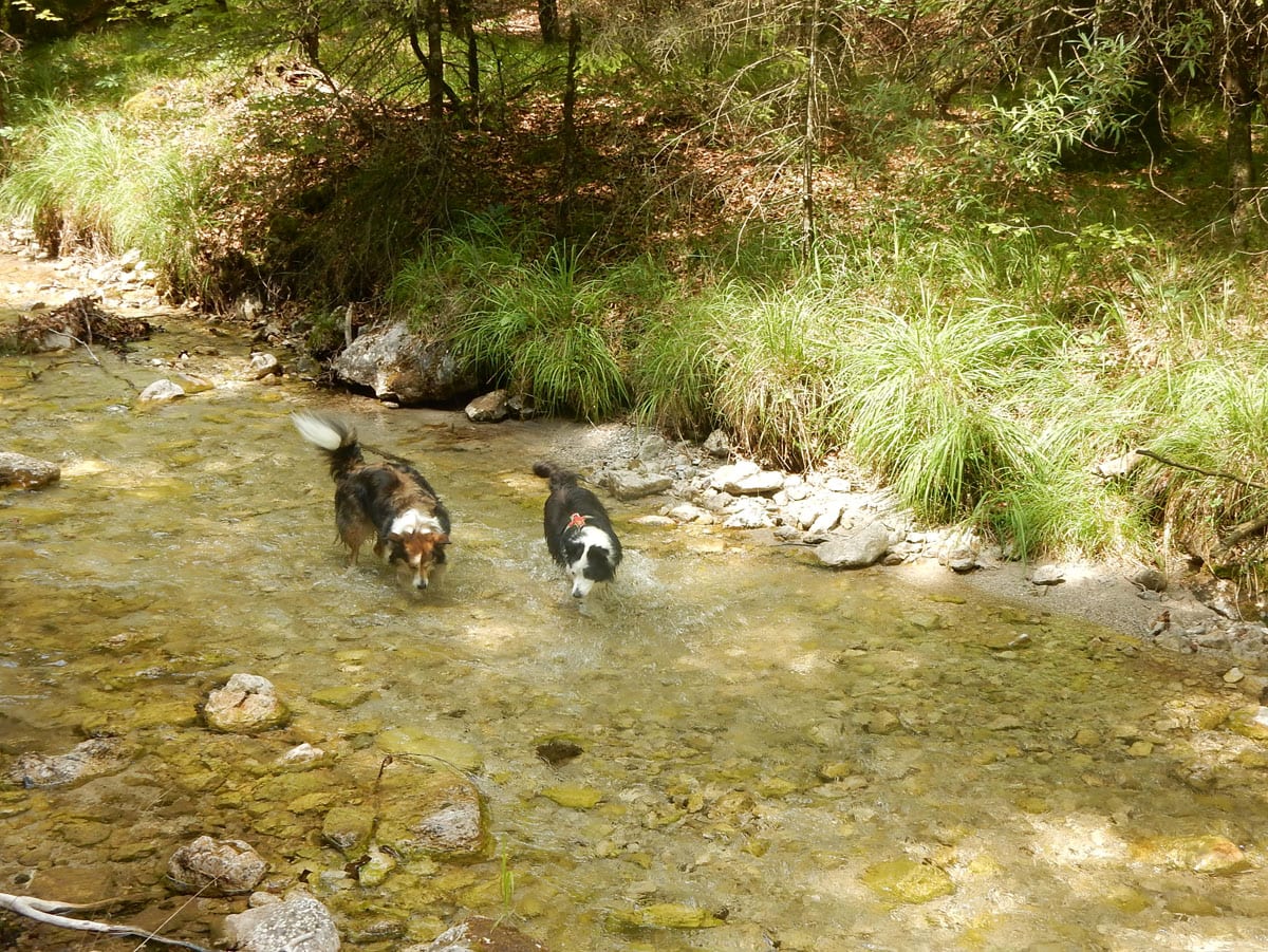 Mina springt bei jeder Gelegenheit in den Bach, nur die Ninja ist etwas zurückhaltend, wenn Wasser unter dem Füßen ist. Aber ganz zum Schluss geht sie schon sehr tapfer durch die Strömung von einem Ufer zum anderen. Und der Mato? Der ist wie immer gleichzeitig vorne, hinten, links, rechts, oben udn unten. Naja, die Buam halt.