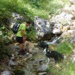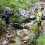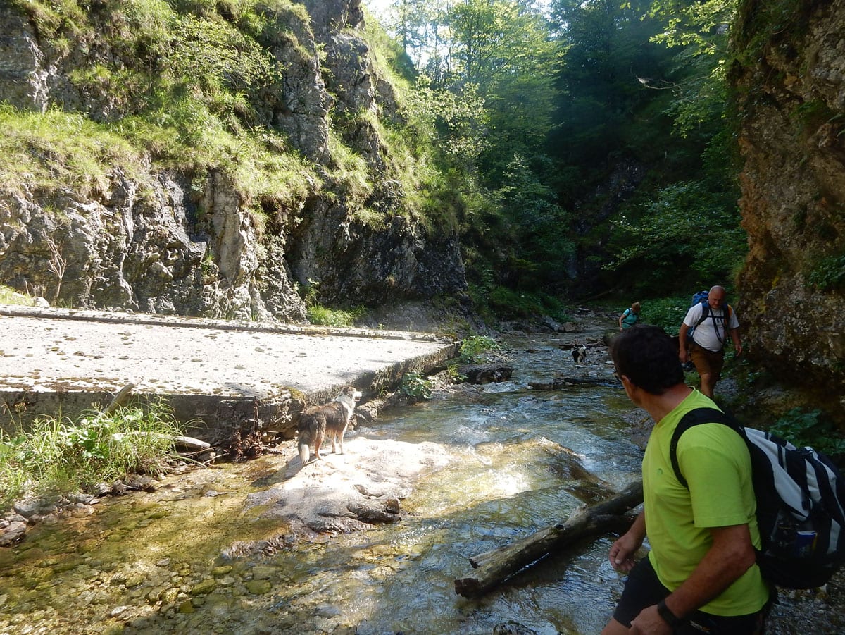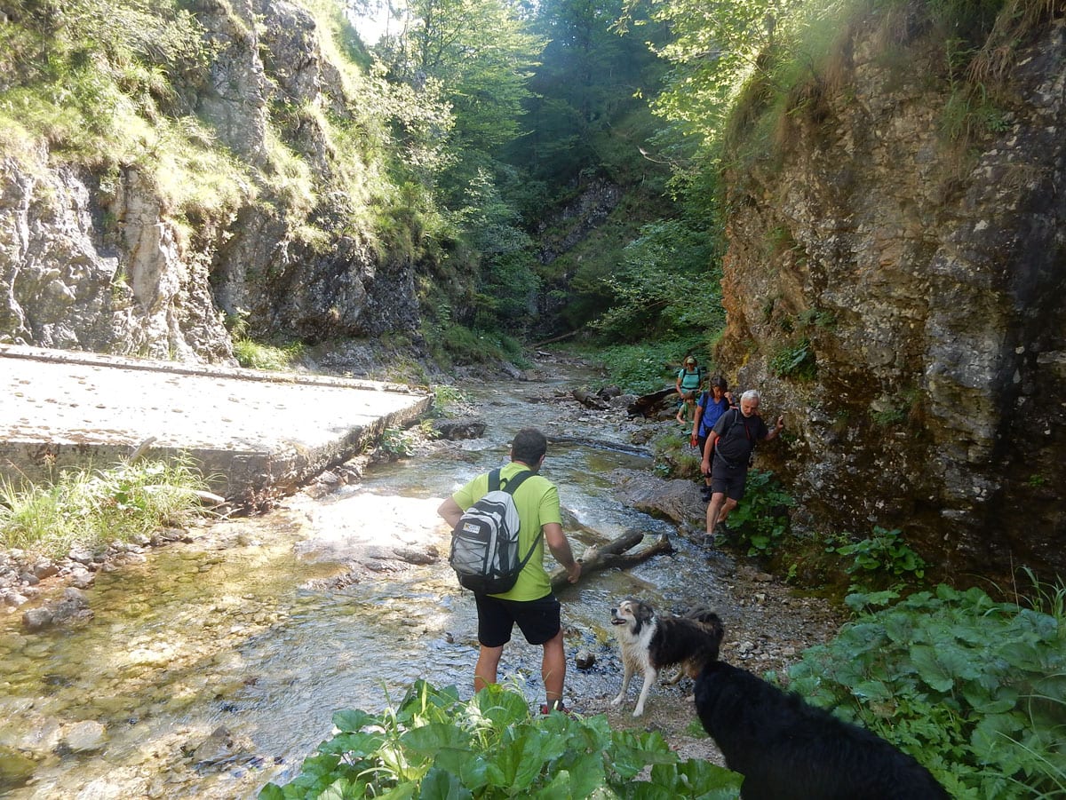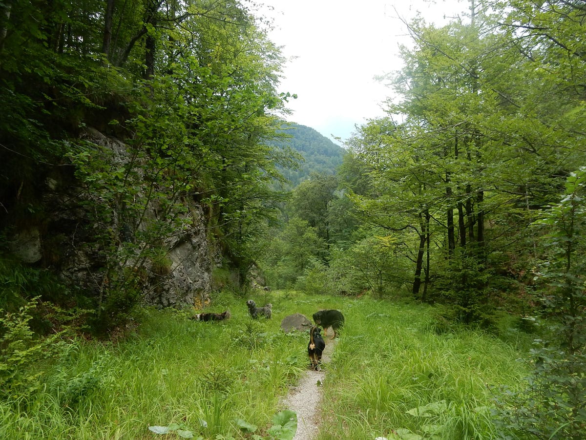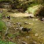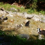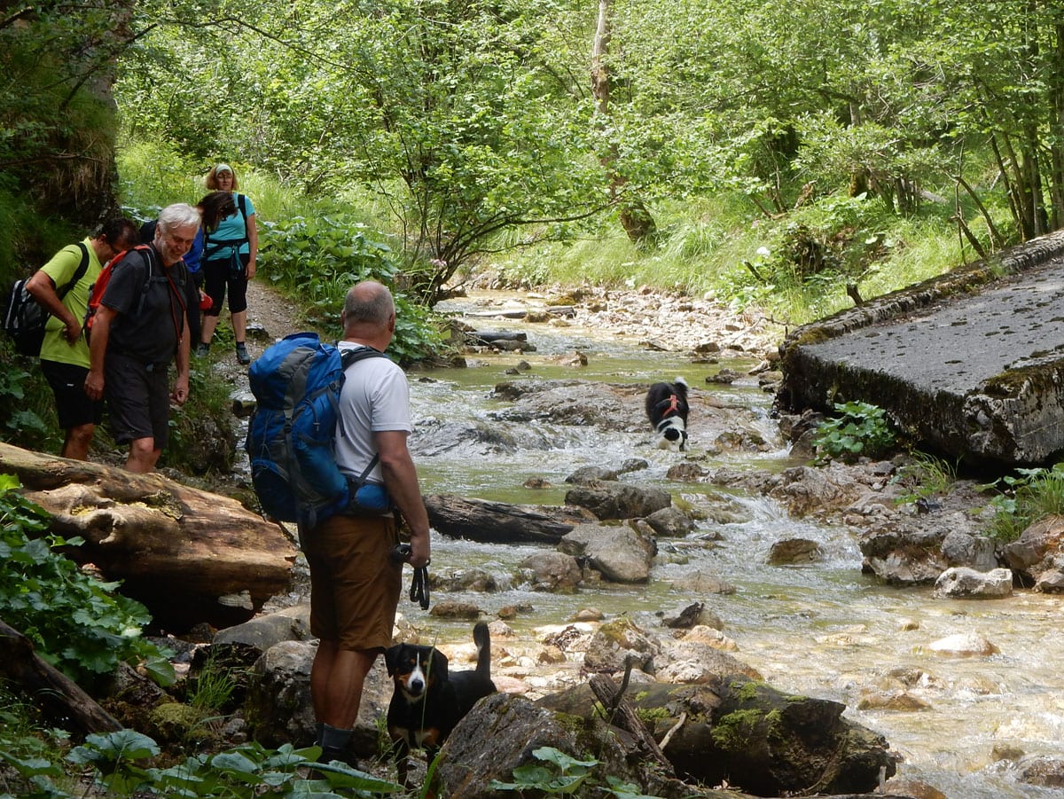 Mina springt bei jeder Gelegenheit in den Bach, nur die Ninja ist etwas zurückhaltend, wenn Wasser unter dem Füßen ist. Aber ganz zum Schluss geht sie schon sehr tapfer durch die Strömung von einem Ufer zum anderen. Und der Mato? Der ist wie immer gleichzeitig vorne, hinten, links, rechts, oben udn unten. Naja, die Buam halt.