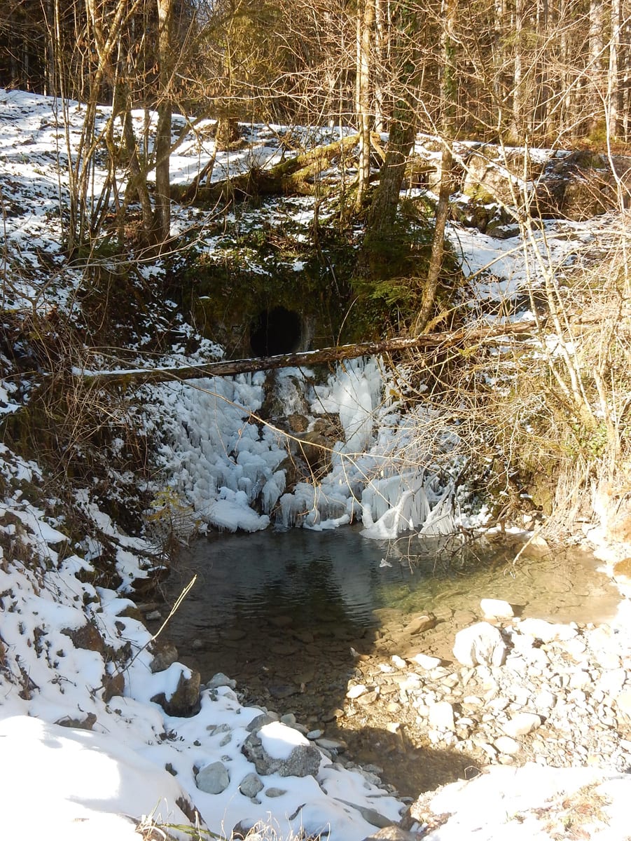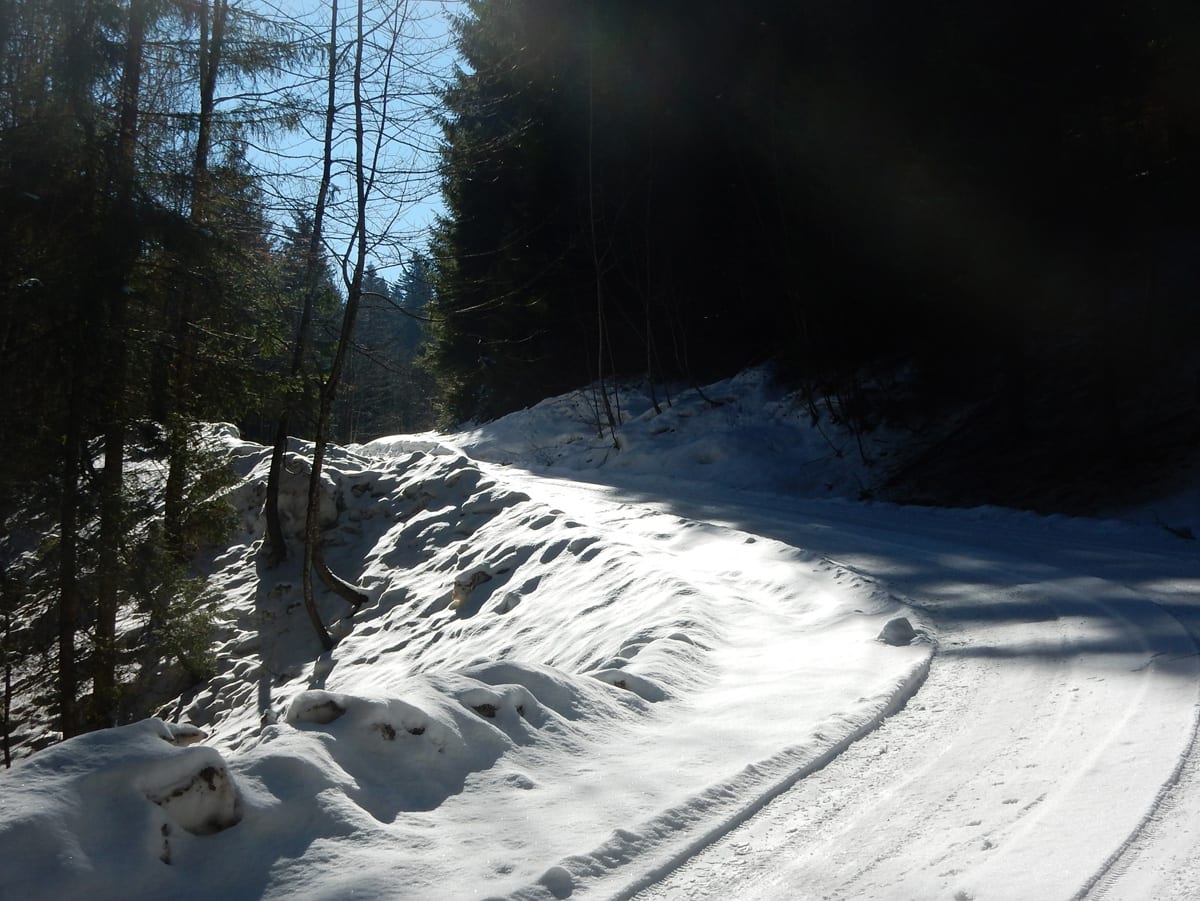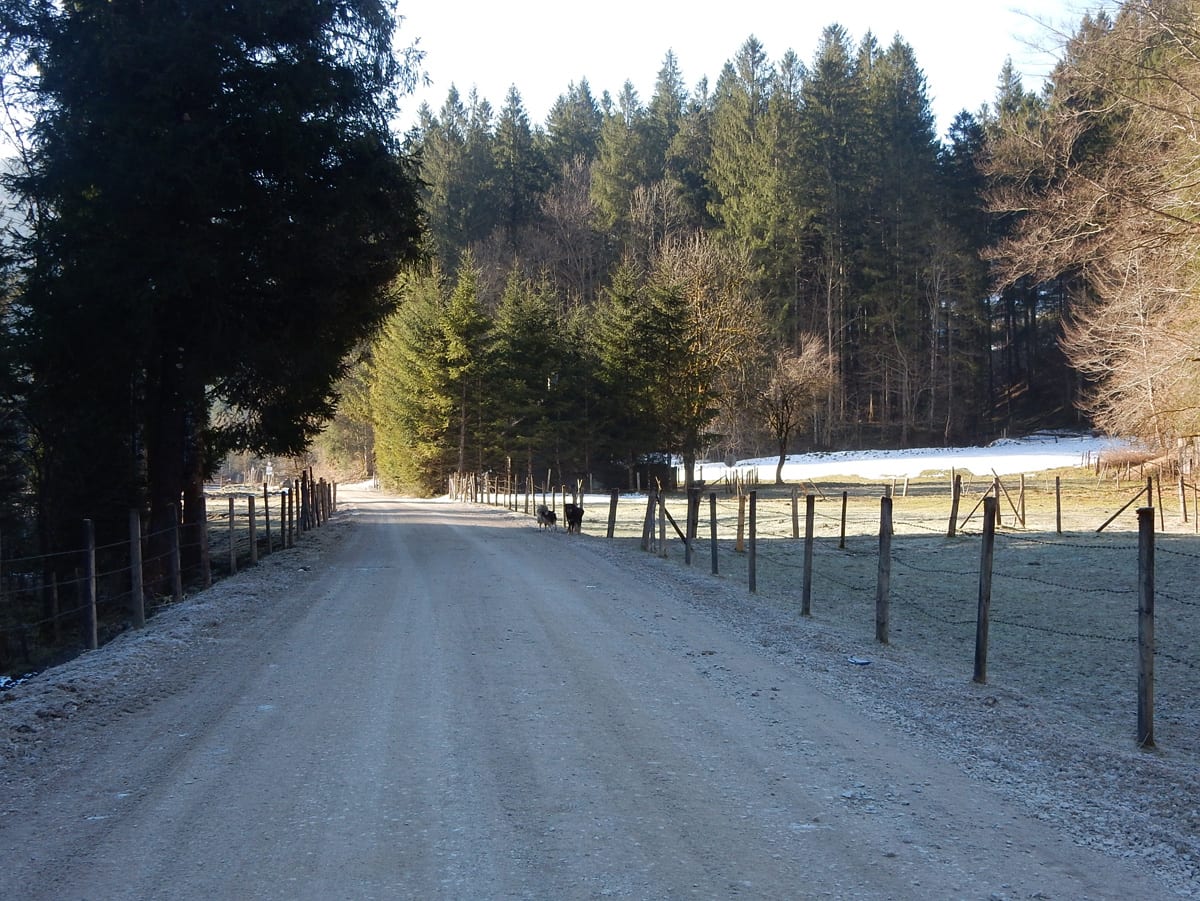 Der letzte Teil ist dann eine unaufregende Strecke über teilweise schneebedeckte Forststraßen. Ach ja: dabei treffen wir auf zwei Rudel Hirsche; aber s’Herrl sagt, wir dürfen nicht mit denen spielen. Langweilig ..