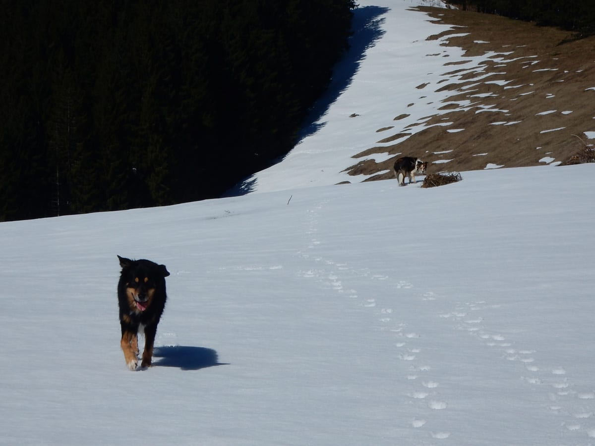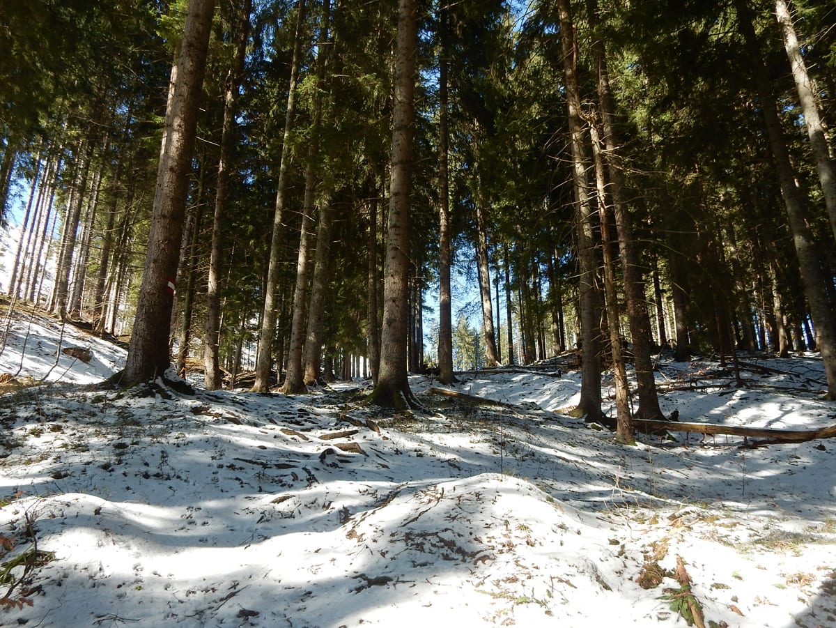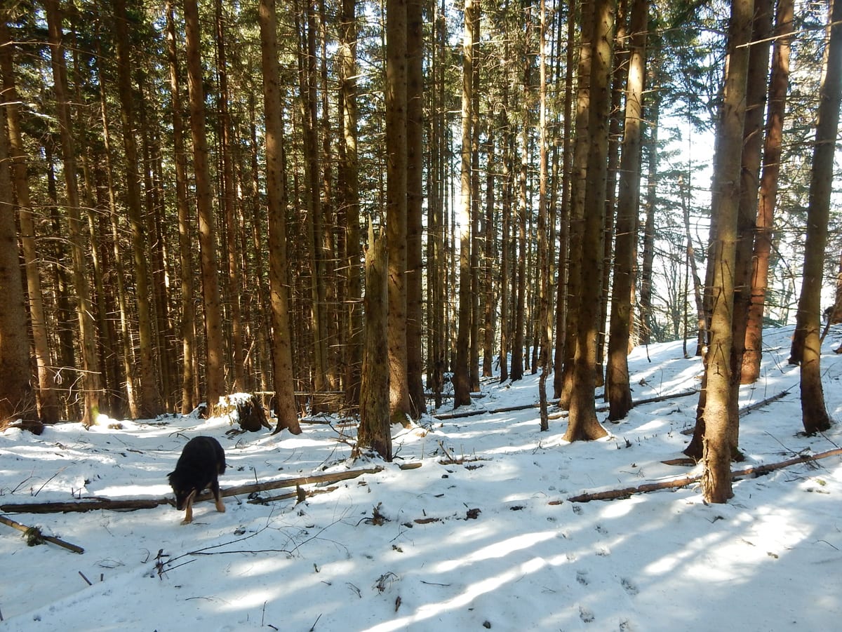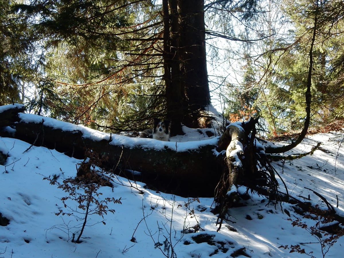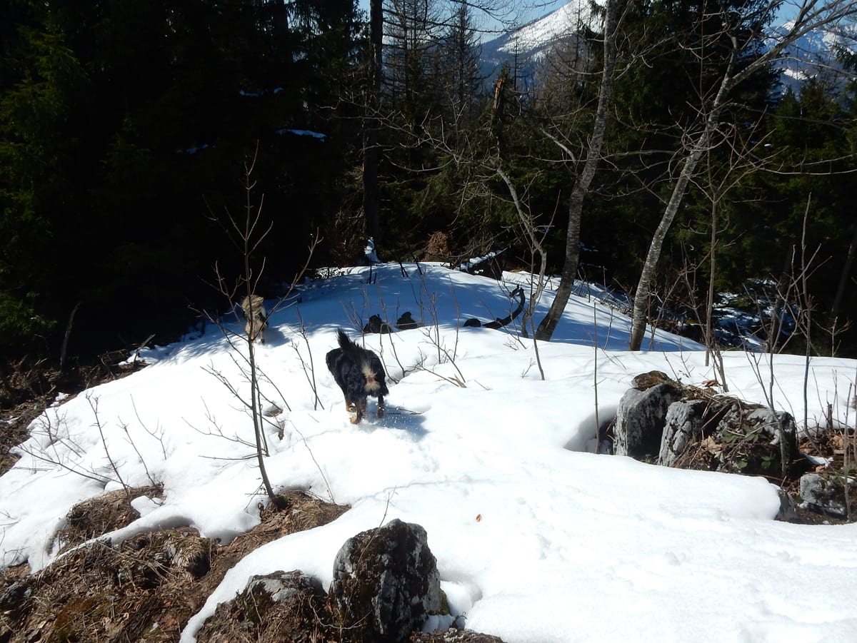 Runter von Hochkogel geht es über die Nordseite. Das bedeutet, wie man sich vorstellen kann, durchgehend Schnee. Nicht allzu tief, aber genug, um den Weg zu verdecken. Und weil nach den diversen Holzmassakern im letzten Herbst auch viele Markierungen fehlen und die Wege oft mit Ästen und Baumstämmen verlegt sind , liegt es an mir, den Weg zu finden. Wenn die mich nicht hätten. Hinter mir rutscht s’Herrl und tastet sich vorsichtig den Berg hinunter; und die Ronja wartet ab und geht dann gemütlich hinterher.