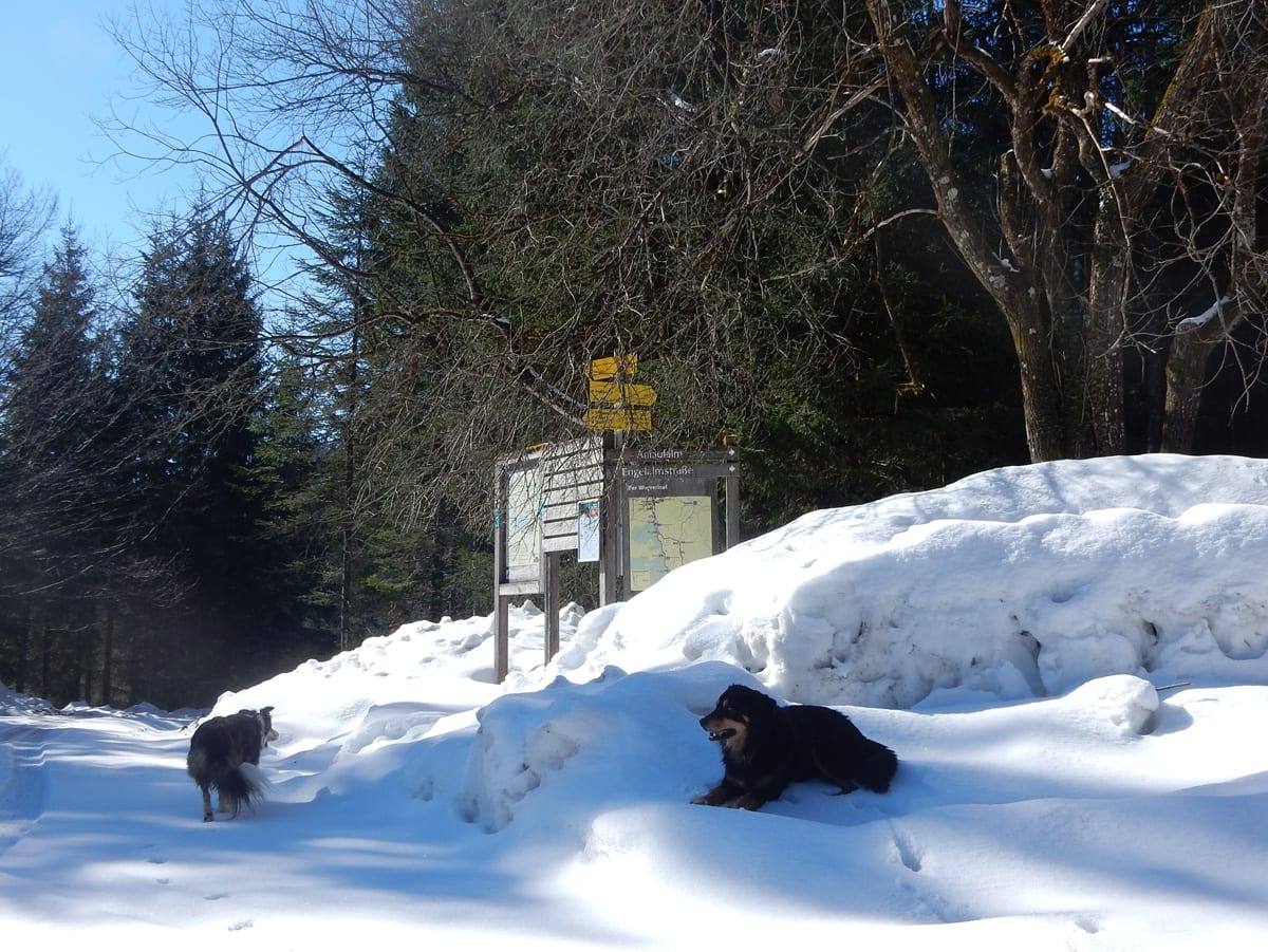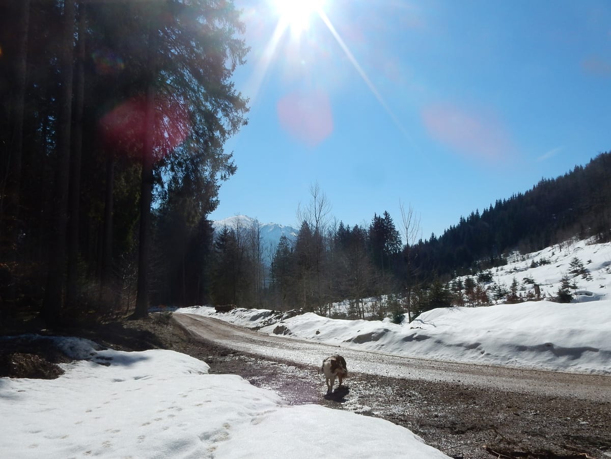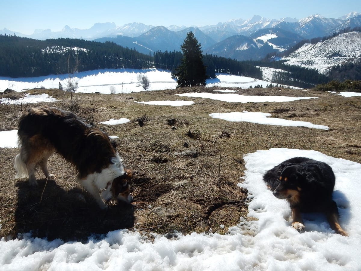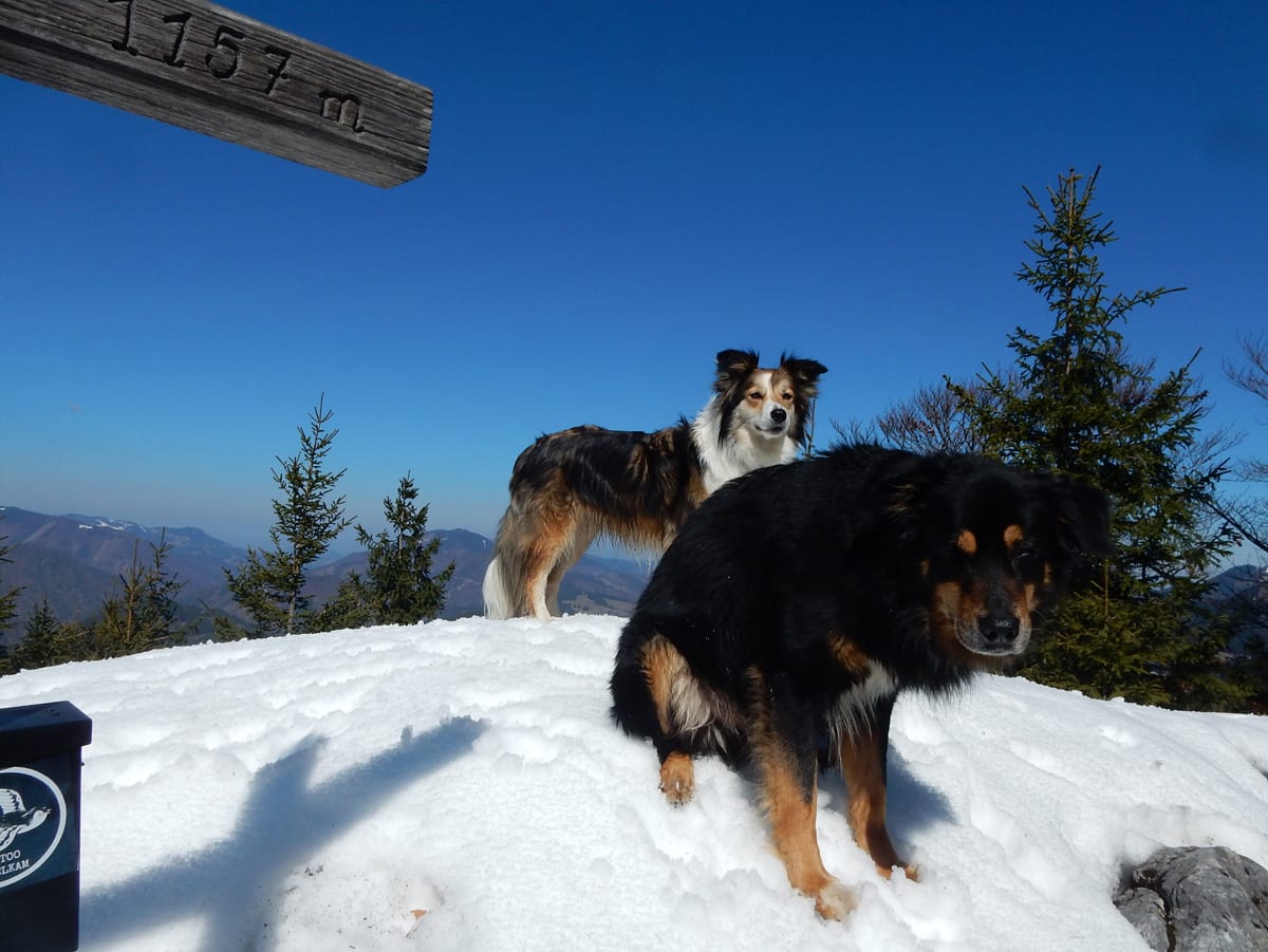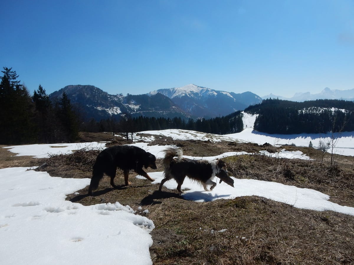 Runter von Hochkogel geht es über die Nordseite. Das bedeutet, wie man sich vorstellen kann, durchgehend Schnee. Nicht allzu tief, aber genug, um den Weg zu verdecken. Und weil nach den diversen Holzmassakern im letzten Herbst auch viele Markierungen fehlen und die Wege oft mit Ästen und Baumstämmen verlegt sind , liegt es an mir, den Weg zu finden. Wenn die mich nicht hätten. Hinter mir rutscht s’Herrl und tastet sich vorsichtig den Berg hinunter; und die Ronja wartet ab und geht dann gemütlich hinterher.