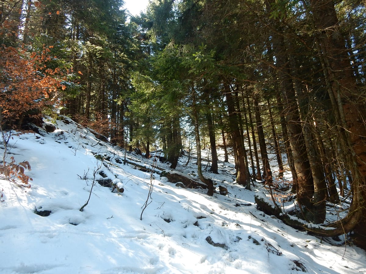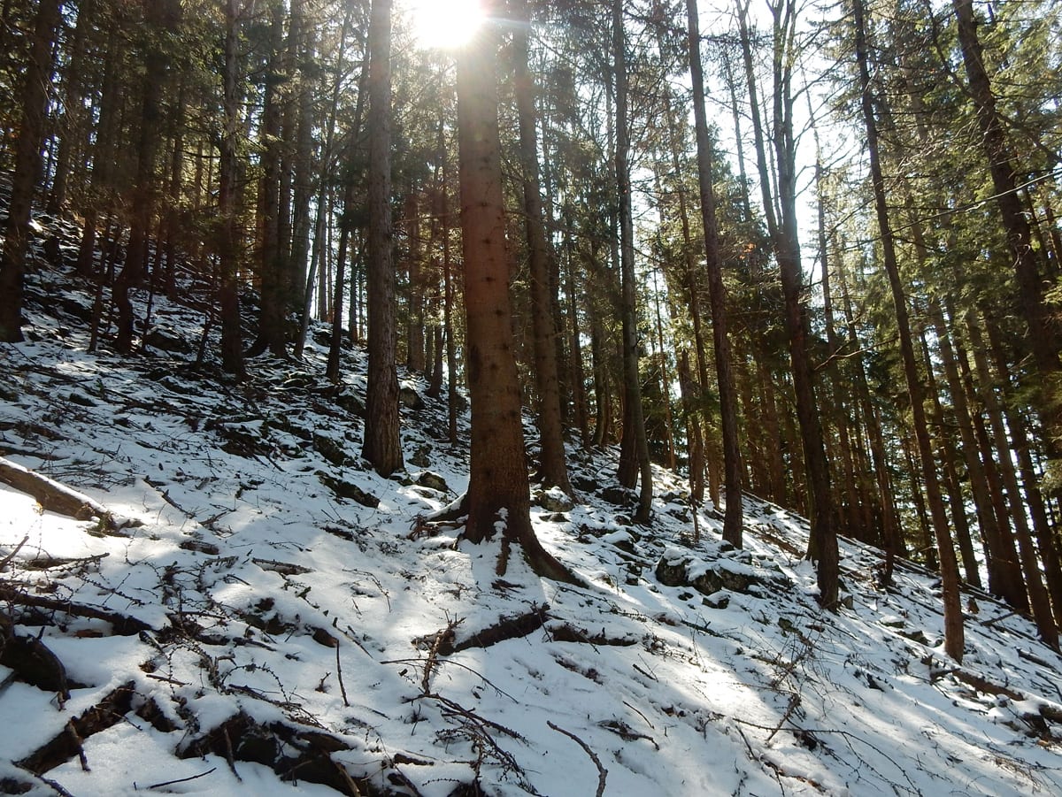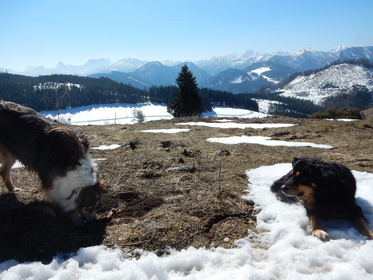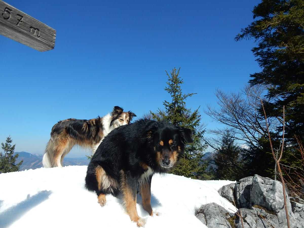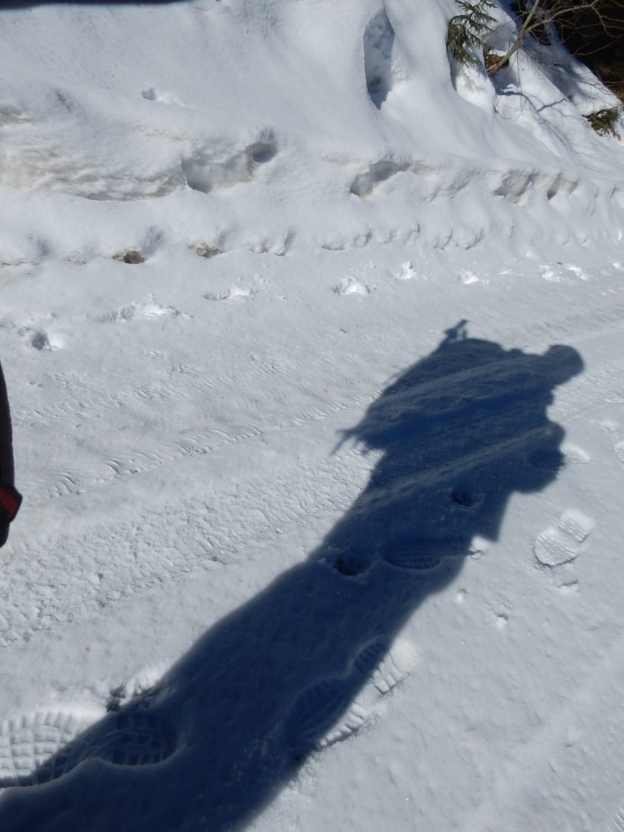 Runter von Hochkogel geht es über die Nordseite. Das bedeutet, wie man sich vorstellen kann, durchgehend Schnee. Nicht allzu tief, aber genug, um den Weg zu verdecken. Und weil nach den diversen Holzmassakern im letzten Herbst auch viele Markierungen fehlen und die Wege oft mit Ästen und Baumstämmen verlegt sind , liegt es an mir, den Weg zu finden. Wenn die mich nicht hätten. Hinter mir rutscht s’Herrl und tastet sich vorsichtig den Berg hinunter; und die Ronja wartet ab und geht dann gemütlich hinterher.