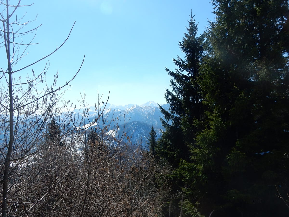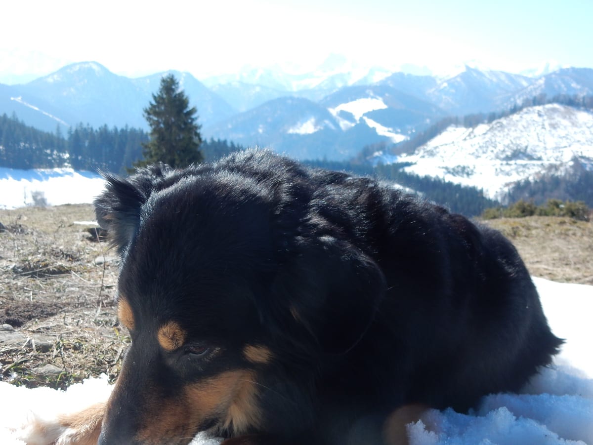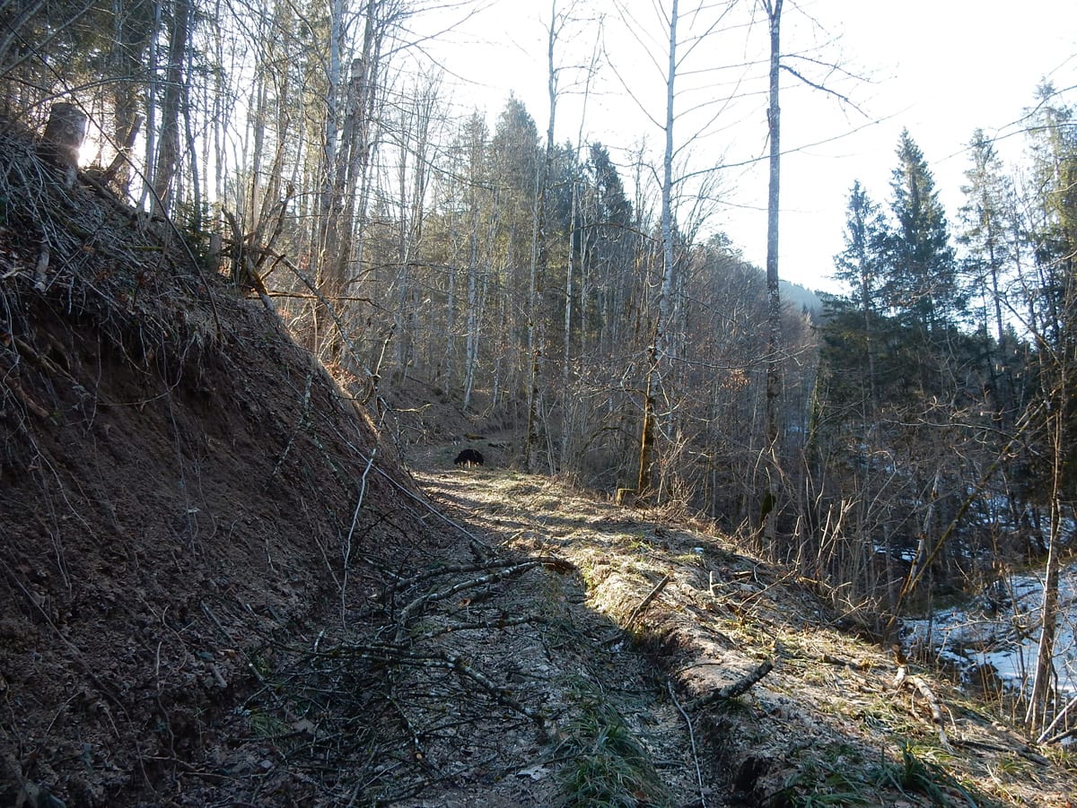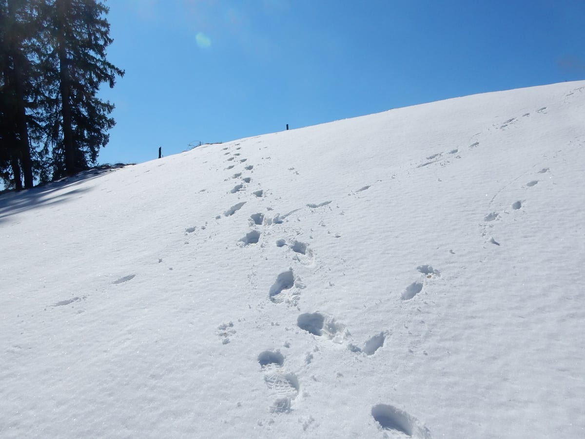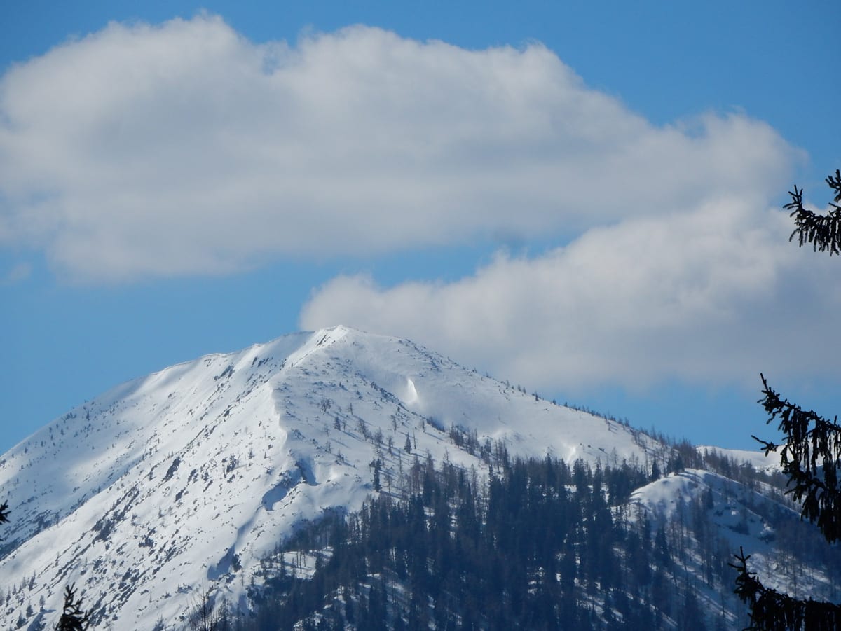 Runter von Hochkogel geht es über die Nordseite. Das bedeutet, wie man sich vorstellen kann, durchgehend Schnee. Nicht allzu tief, aber genug, um den Weg zu verdecken. Und weil nach den diversen Holzmassakern im letzten Herbst auch viele Markierungen fehlen und die Wege oft mit Ästen und Baumstämmen verlegt sind , liegt es an mir, den Weg zu finden. Wenn die mich nicht hätten. Hinter mir rutscht s’Herrl und tastet sich vorsichtig den Berg hinunter; und die Ronja wartet ab und geht dann gemütlich hinterher.