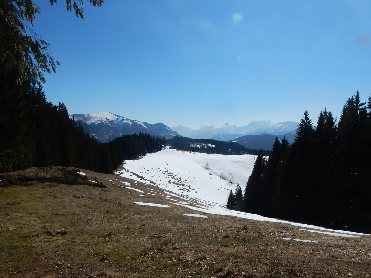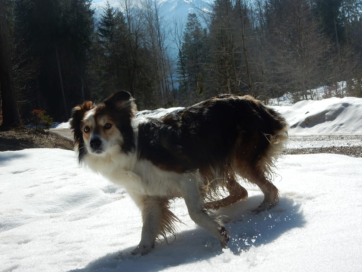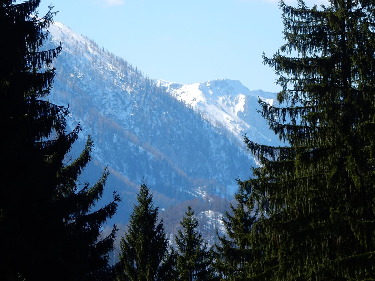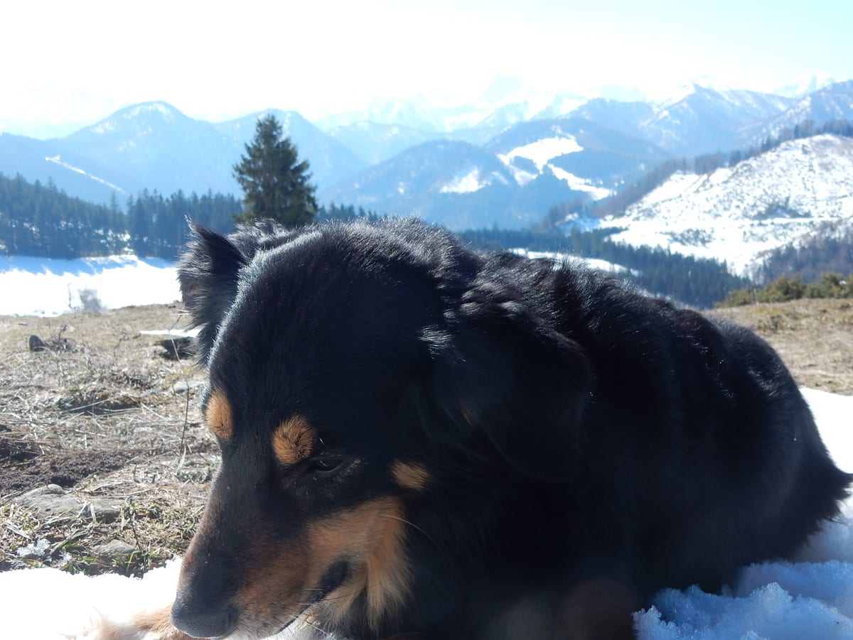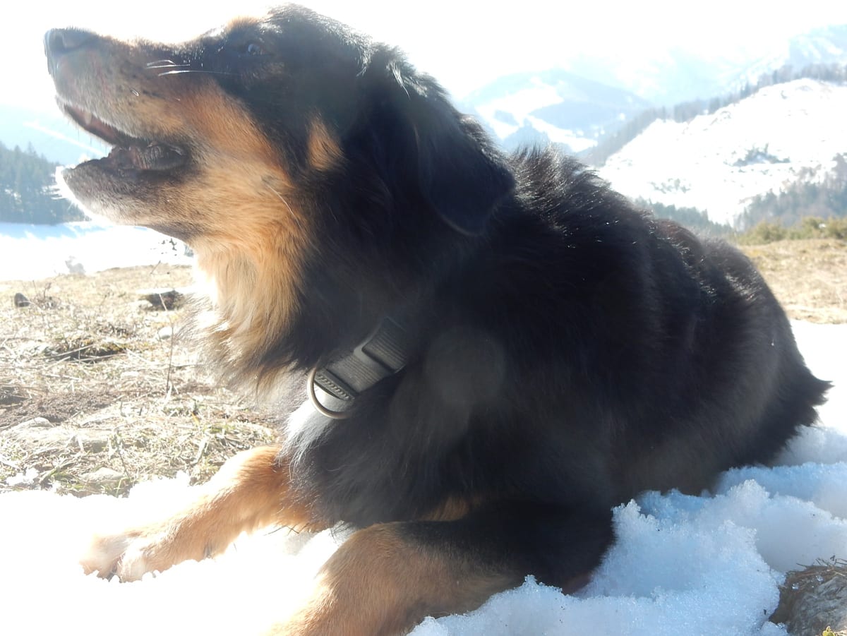 Runter von Hochkogel geht es über die Nordseite. Das bedeutet, wie man sich vorstellen kann, durchgehend Schnee. Nicht allzu tief, aber genug, um den Weg zu verdecken. Und weil nach den diversen Holzmassakern im letzten Herbst auch viele Markierungen fehlen und die Wege oft mit Ästen und Baumstämmen verlegt sind , liegt es an mir, den Weg zu finden. Wenn die mich nicht hätten. Hinter mir rutscht s’Herrl und tastet sich vorsichtig den Berg hinunter; und die Ronja wartet ab und geht dann gemütlich hinterher.