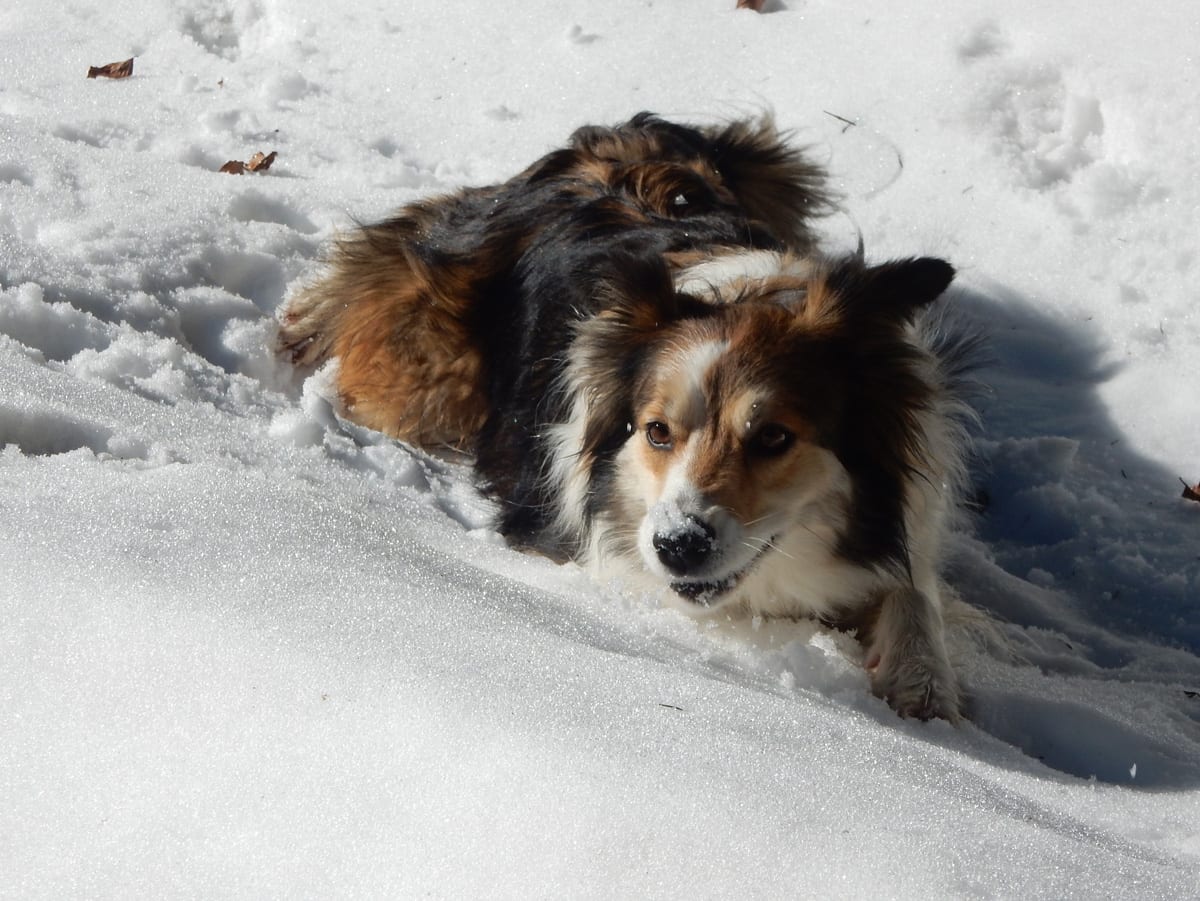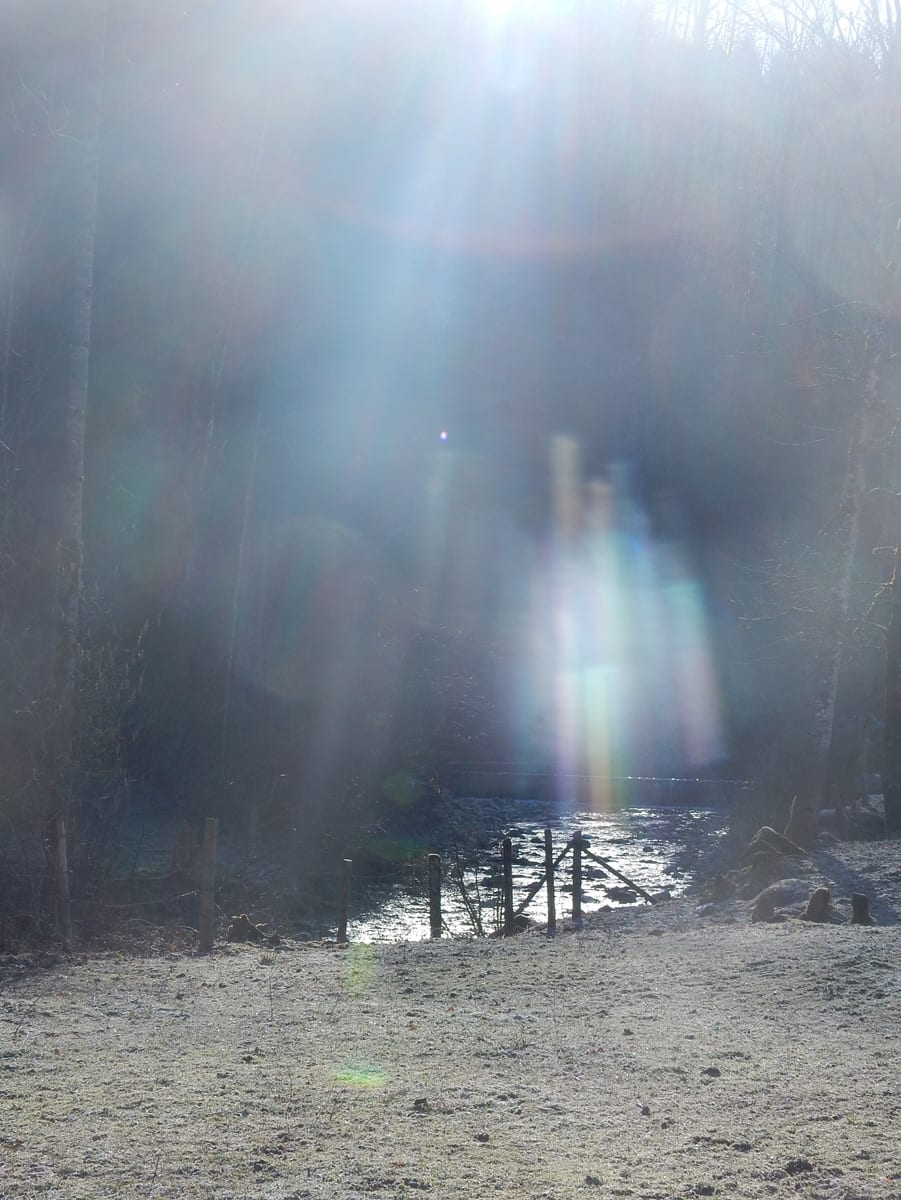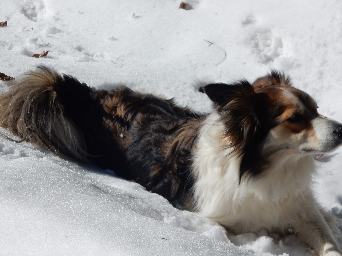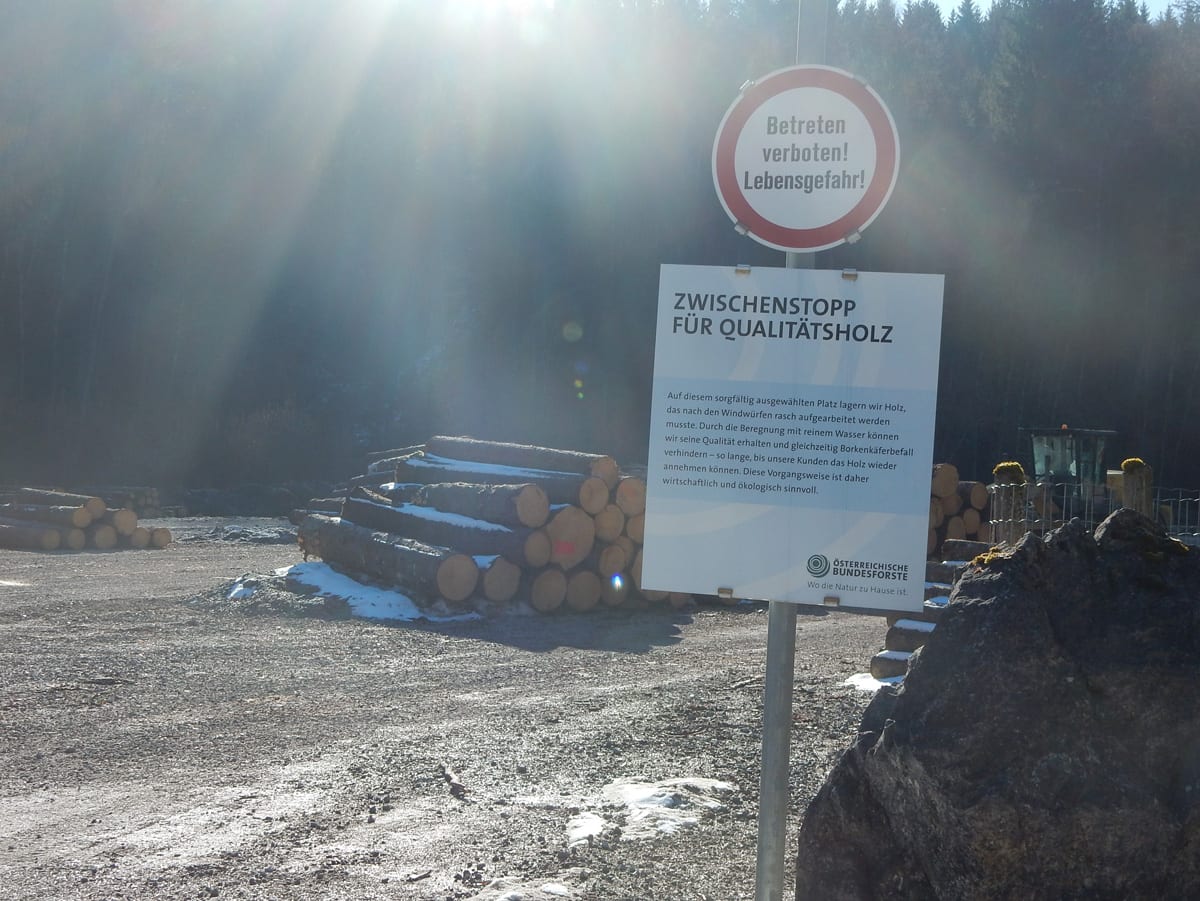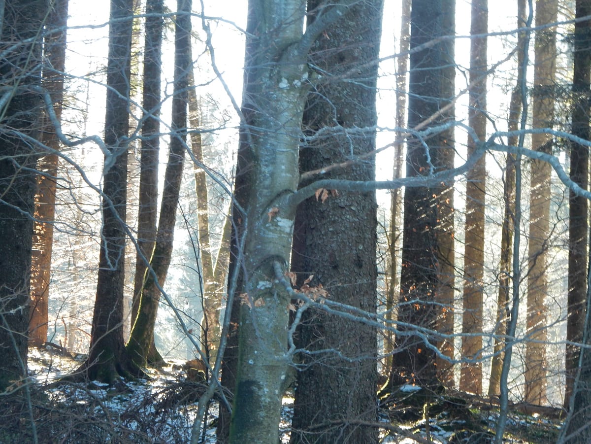 Runter von Hochkogel geht es über die Nordseite. Das bedeutet, wie man sich vorstellen kann, durchgehend Schnee. Nicht allzu tief, aber genug, um den Weg zu verdecken. Und weil nach den diversen Holzmassakern im letzten Herbst auch viele Markierungen fehlen und die Wege oft mit Ästen und Baumstämmen verlegt sind , liegt es an mir, den Weg zu finden. Wenn die mich nicht hätten. Hinter mir rutscht s’Herrl und tastet sich vorsichtig den Berg hinunter; und die Ronja wartet ab und geht dann gemütlich hinterher.