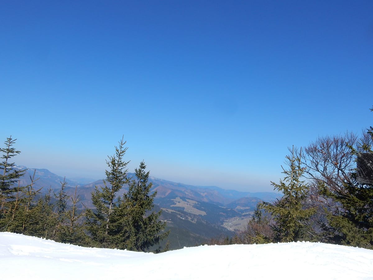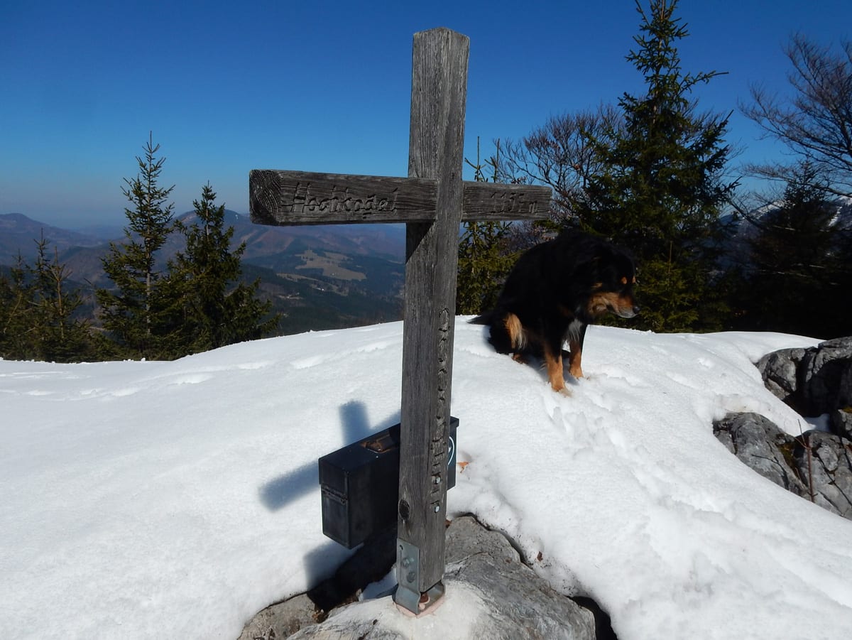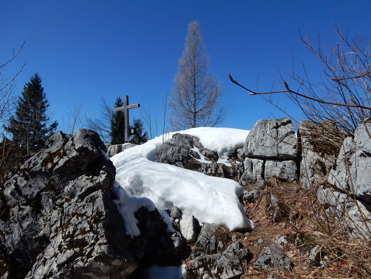 Dann hinauf zum Hochkogel (1157m) , auf dem noch eine ganz dicke Schneehaube liegt. Schon auf dem Weg dorthin sagt uns der Schnee, dass wir die ersten sind, die hier seit längerer Zeit wandern. Das Gipfelbuch sagt uns, dass wir ganz oben zwar nicht die ersten sind, aber in diesem Jahr gibt es erst zwei Einträge vor uns. Und wieder Zeit für eine ausgedehnte Pause mit Sonnenbad.