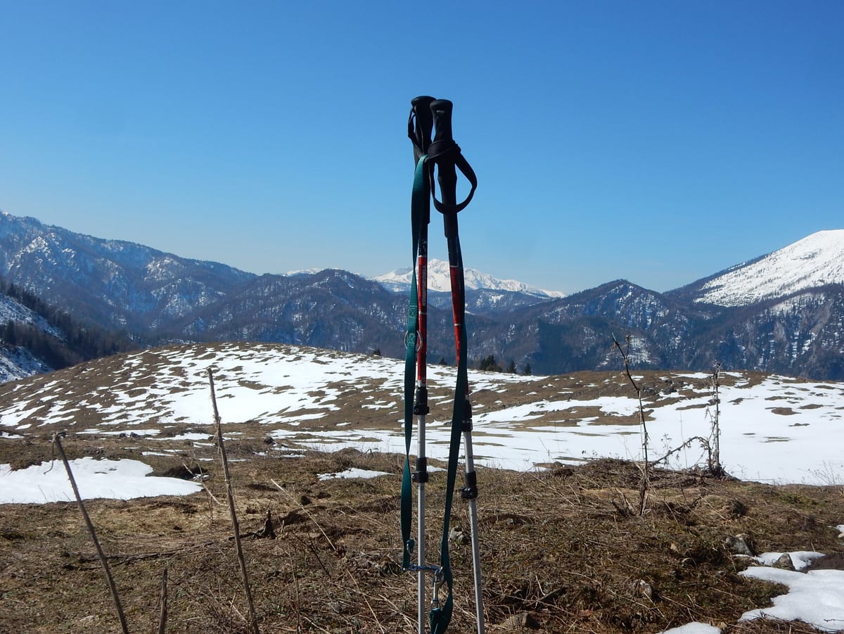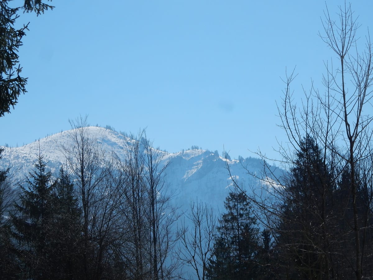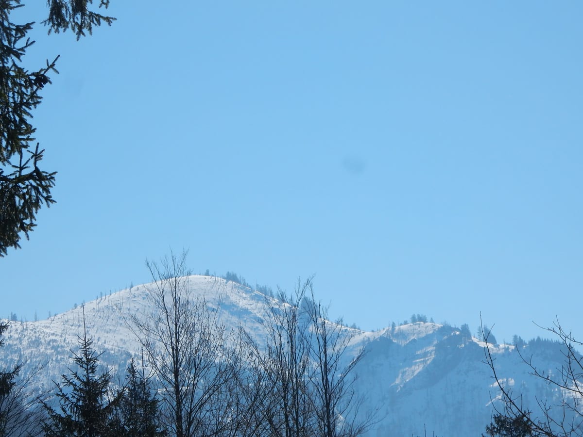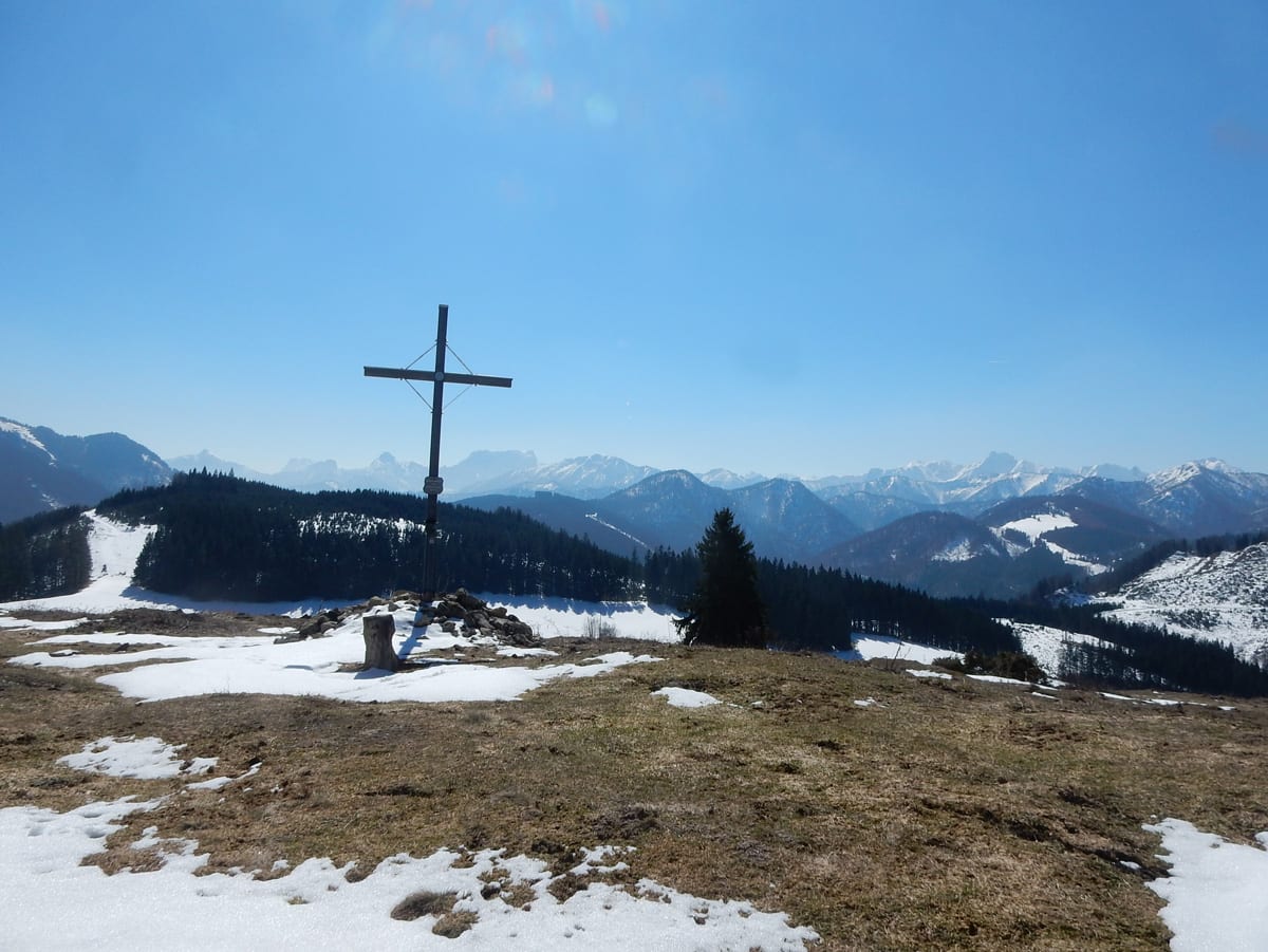 Dann hinauf zum Hochkogel (1157m) , auf dem noch eine ganz dicke Schneehaube liegt. Schon auf dem Weg dorthin sagt uns der Schnee, dass wir die ersten sind, die hier seit längerer Zeit wandern. Das Gipfelbuch sagt uns, dass wir ganz oben zwar nicht die ersten sind, aber in diesem Jahr gibt es erst zwei Einträge vor uns. Und wieder Zeit für eine ausgedehnte Pause mit Sonnenbad.