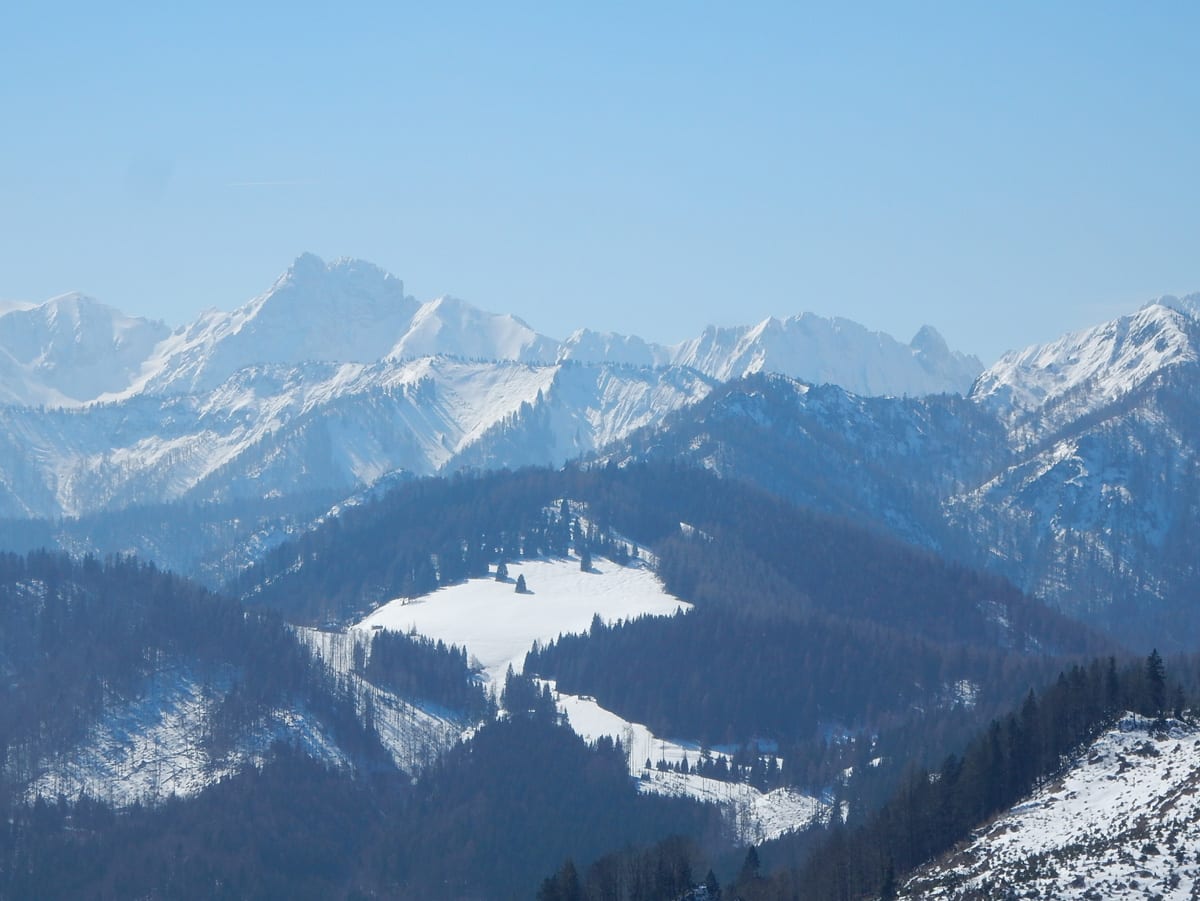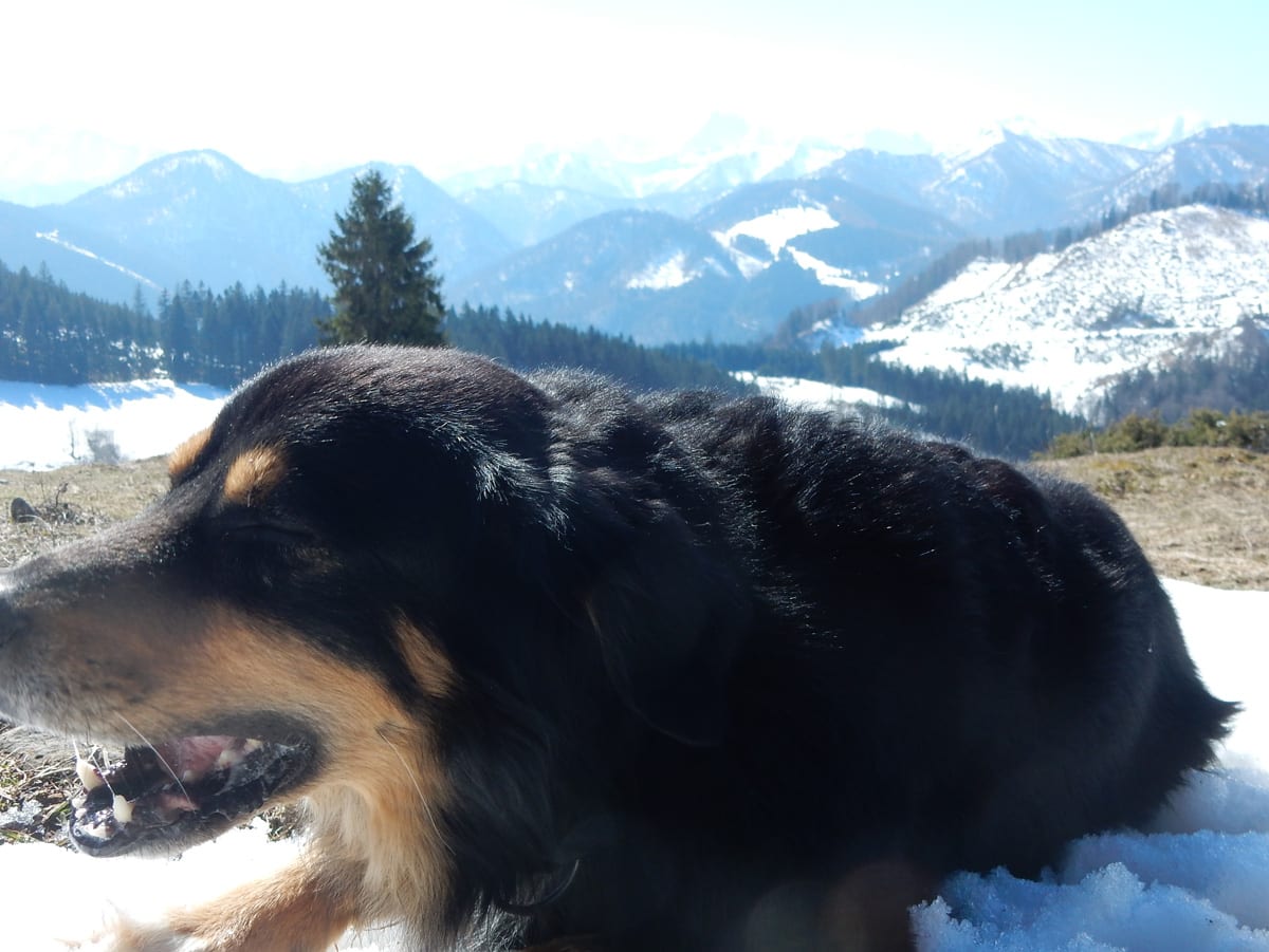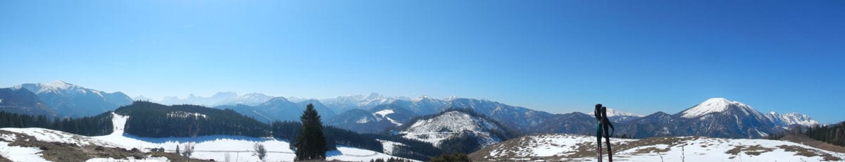 Auf dem Weg von Brunnbach über den Hirschkogelsattel zur Anlaufalm liegt immer mehr Schneee, je höher wir kommen. Weil es am Vormittag noch so kalt ist, trägt uns (auch s’Herrl!) der Schnee und wir müssen uns nicht bei jedem Schritt herauskämpfen. Beim Bauernkreuz auf der Anlaufalm ist alles perfekt zum Genießen: angenehme Temperatur, strahlender Sonnenschein (Sonnencreme-Premiere 2018), blauer Himmel, endloser Ausblick und Jause für alle. Beinahe vergessen wir, weiter zu gehen …
