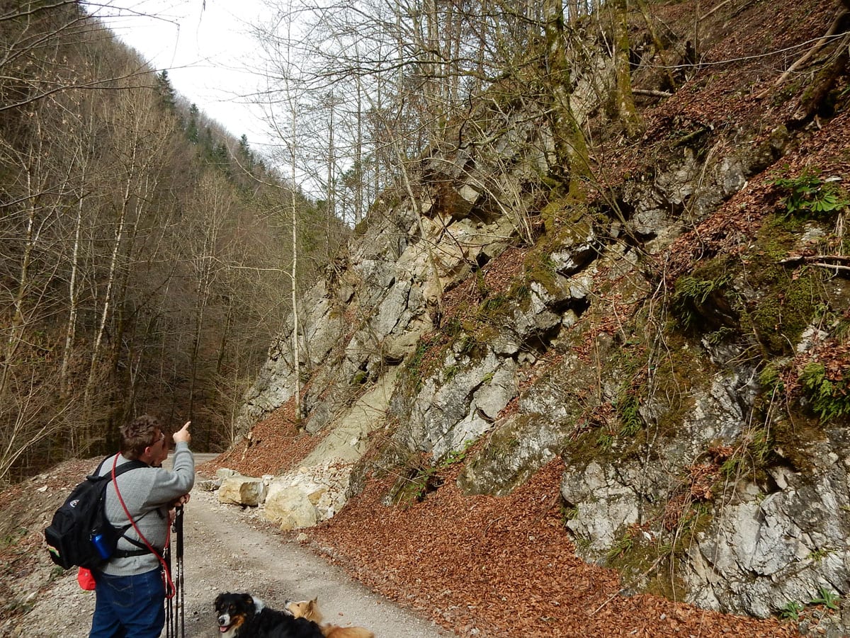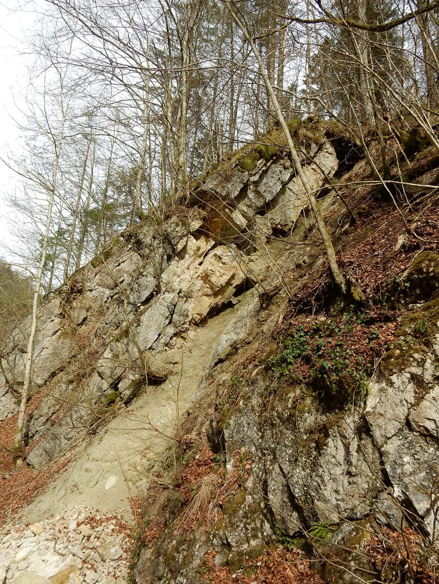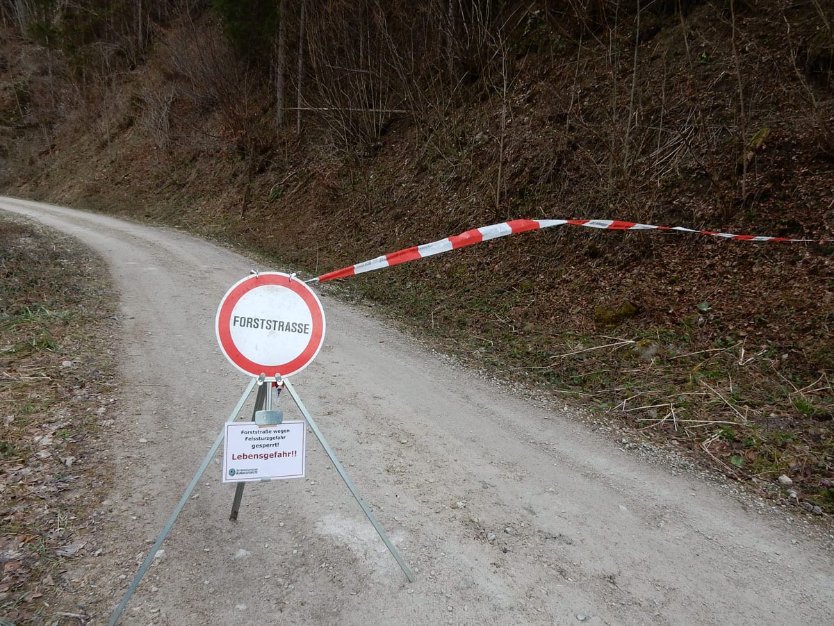 Vom Parkplatz beim Schranken nehmen wir die Standard-Ausweichroute durch den Hanslgraben entlang. Mitten drin stoßen wir dort auf eine Sperre und finden ein paar Meter weiter heraus, warum die da ist: eine ganze Wand schaut so aus, als ob sie nur mehr an ein paar Wurzeln hängt – wird spannend sein zu verfolgen, wie lange die Wand noch oben bleibt.