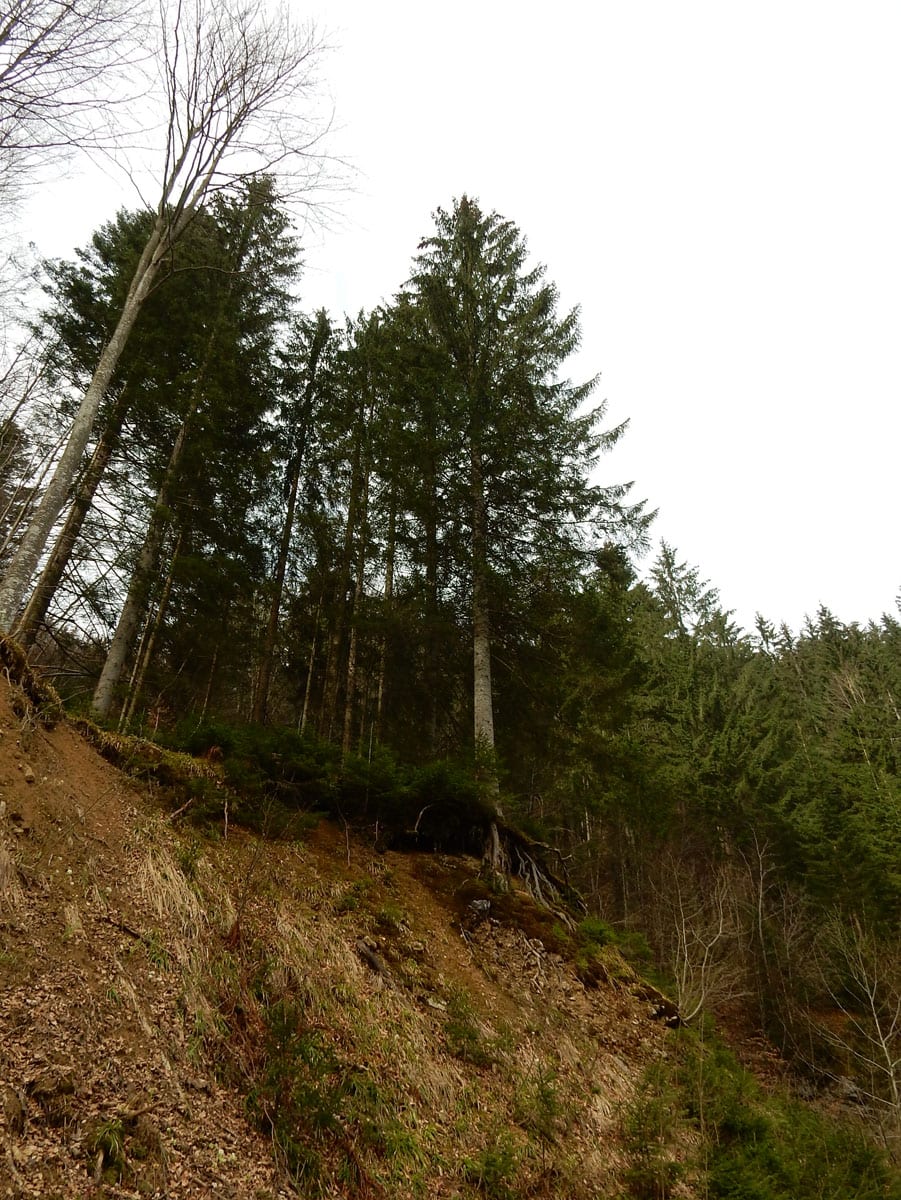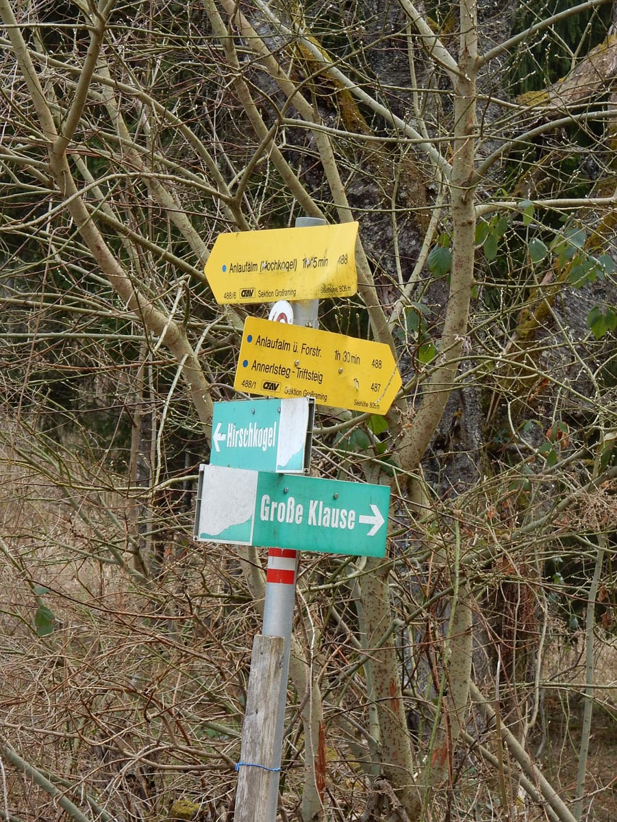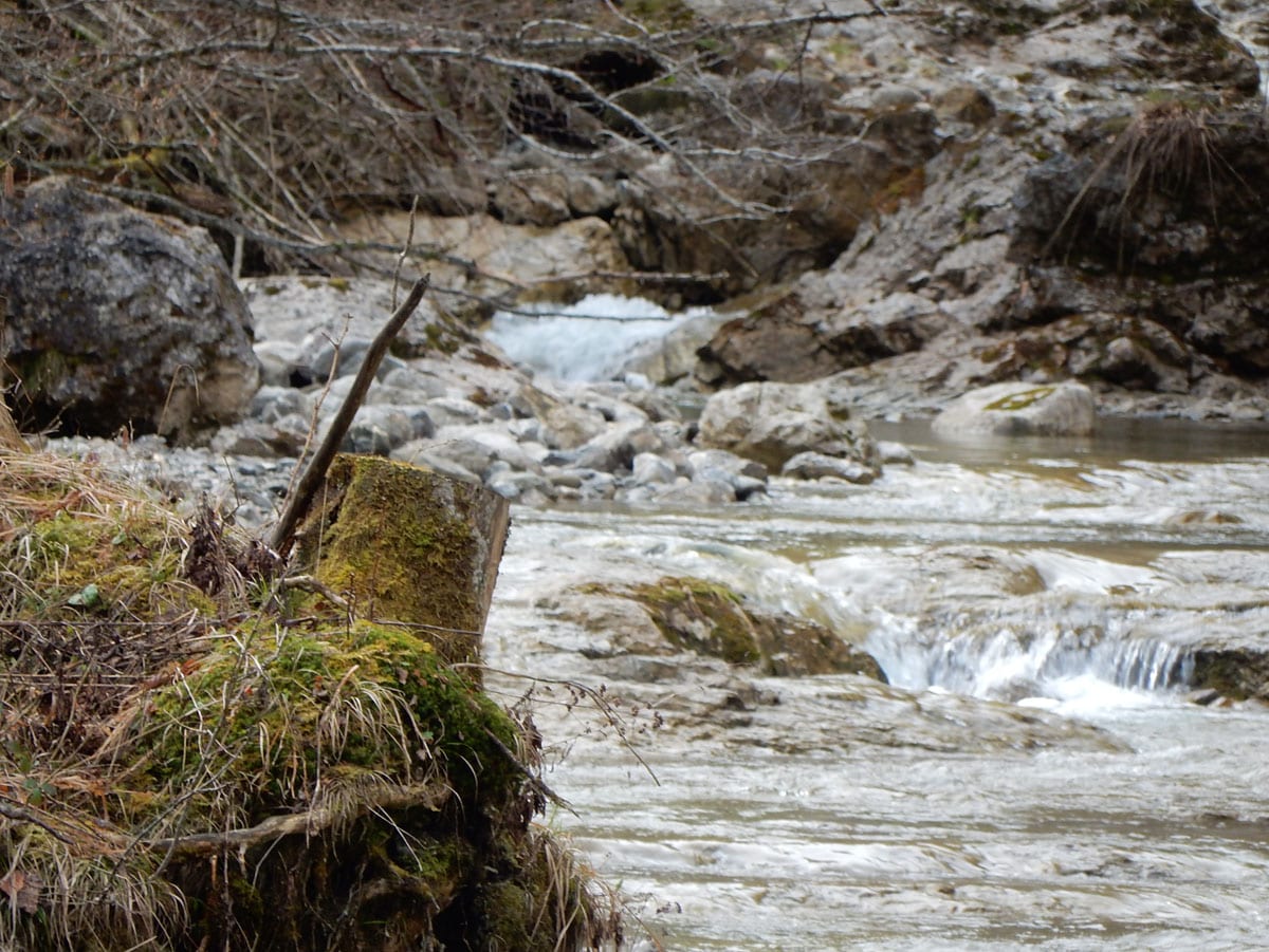 Vom Parkplatz beim Schranken nehmen wir die Standard-Ausweichroute durch den Hanslgraben entlang. Mitten drin stoßen wir dort auf eine Sperre und finden ein paar Meter weiter heraus, warum die da ist: eine ganze Wand schaut so aus, als ob sie nur mehr an ein paar Wurzeln hängt – wird spannend sein zu verfolgen, wie lange die Wand noch oben bleibt.
