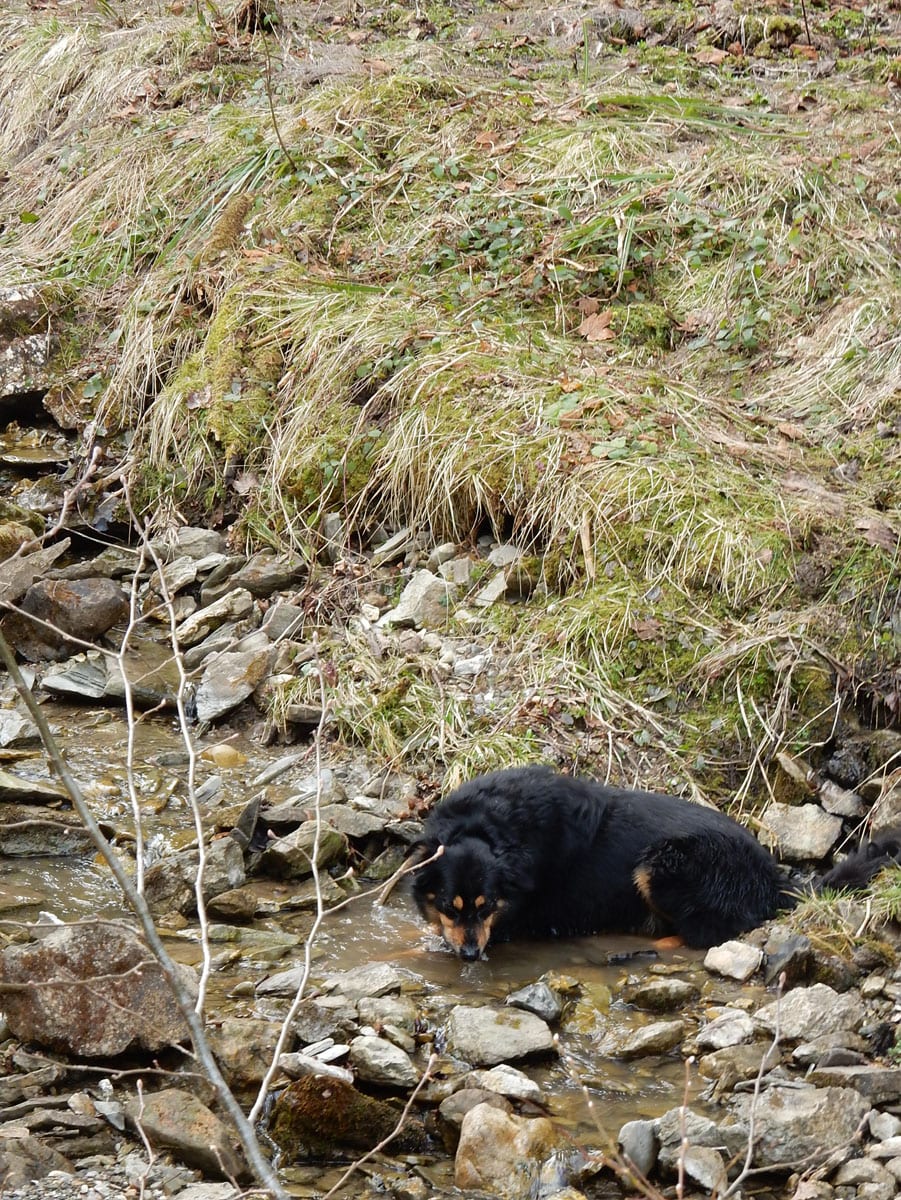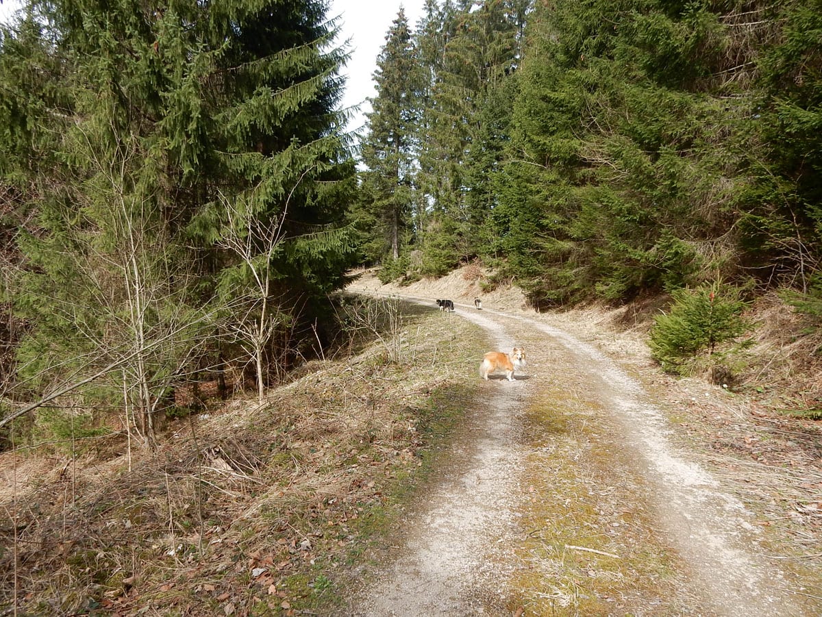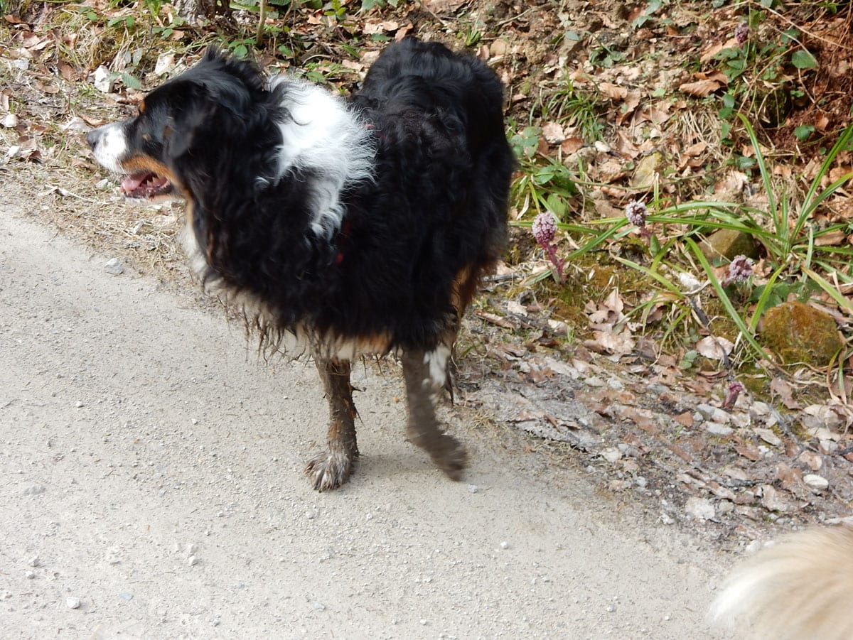 Zurück über die Forststraße über die Ortbaueralm. Wie schon beim Aufstieg zur Anlaufalm finden Kira und Ronja auch hier ein paar Plätze für ein ausgiebiges Schlammbad – na ja, wenns