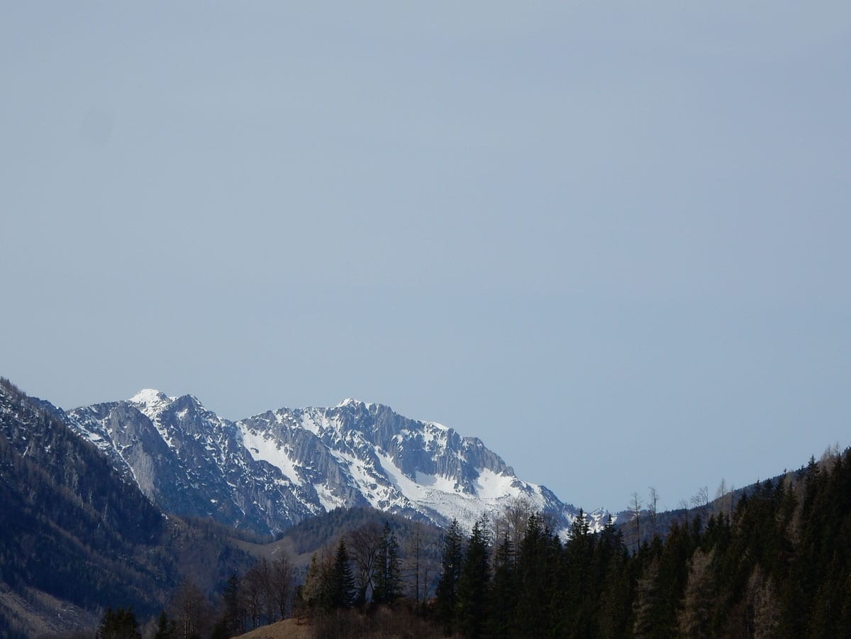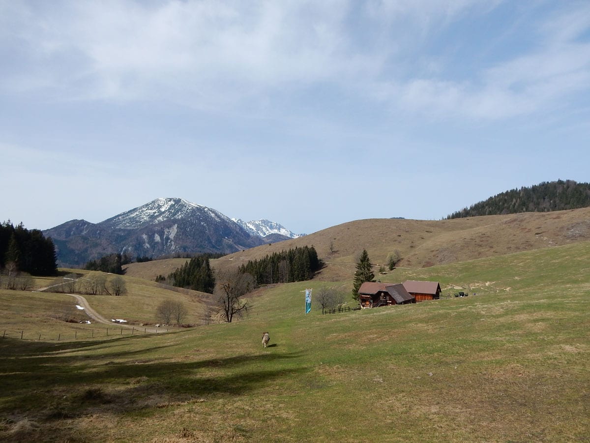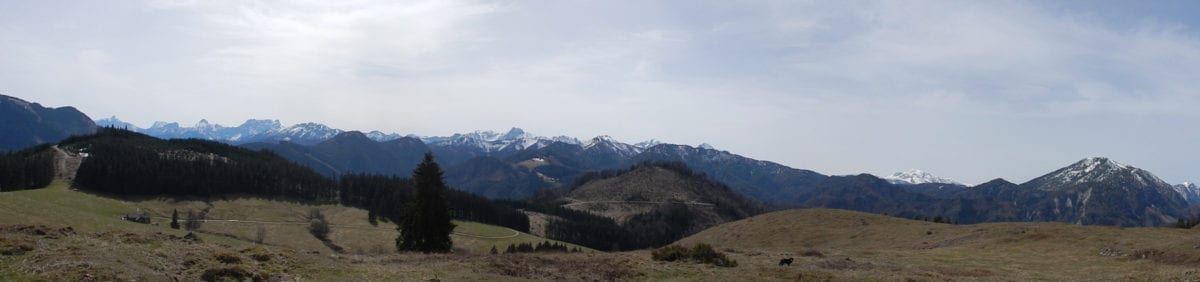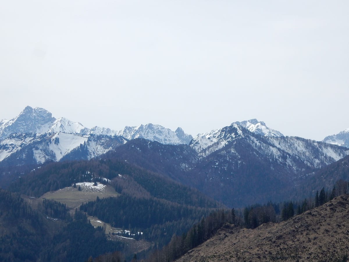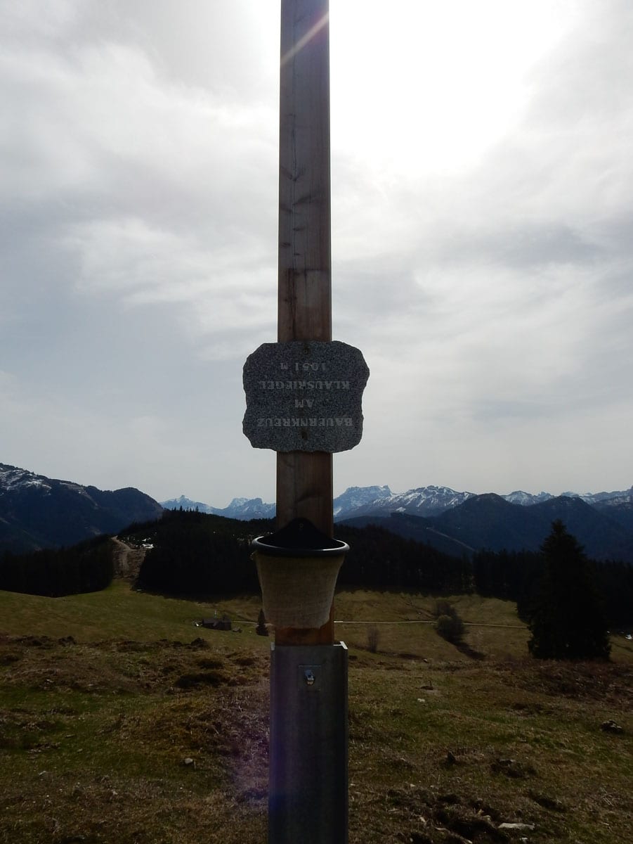 Auf der Anlaufalm herrscht dann paradisische Ruhe: fast keine Menschen, nur bei der Almhütte wird schon heftig gewerkt für die kommende Saison. Wir weichen daher zum Bauernkreuz (1063m) aus und genießen dort eine lange Pause bei Frühlingswetter und mit einem perfekten Ausblick auf die schneebedecken Berge.