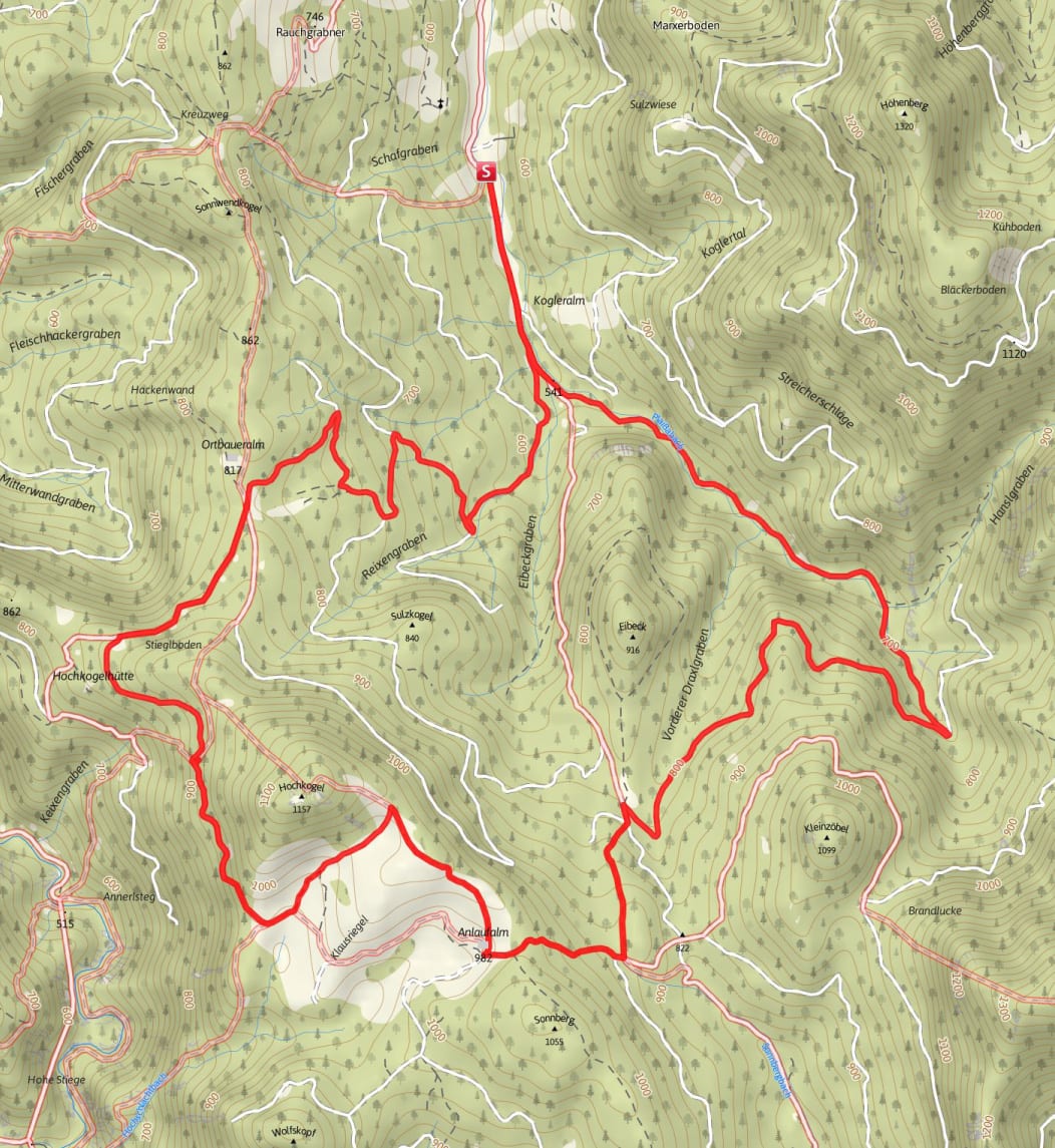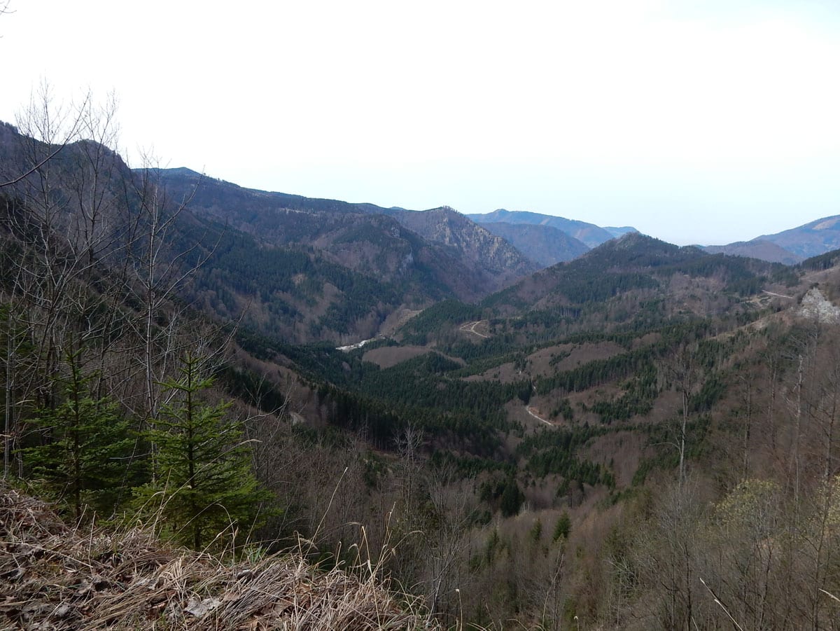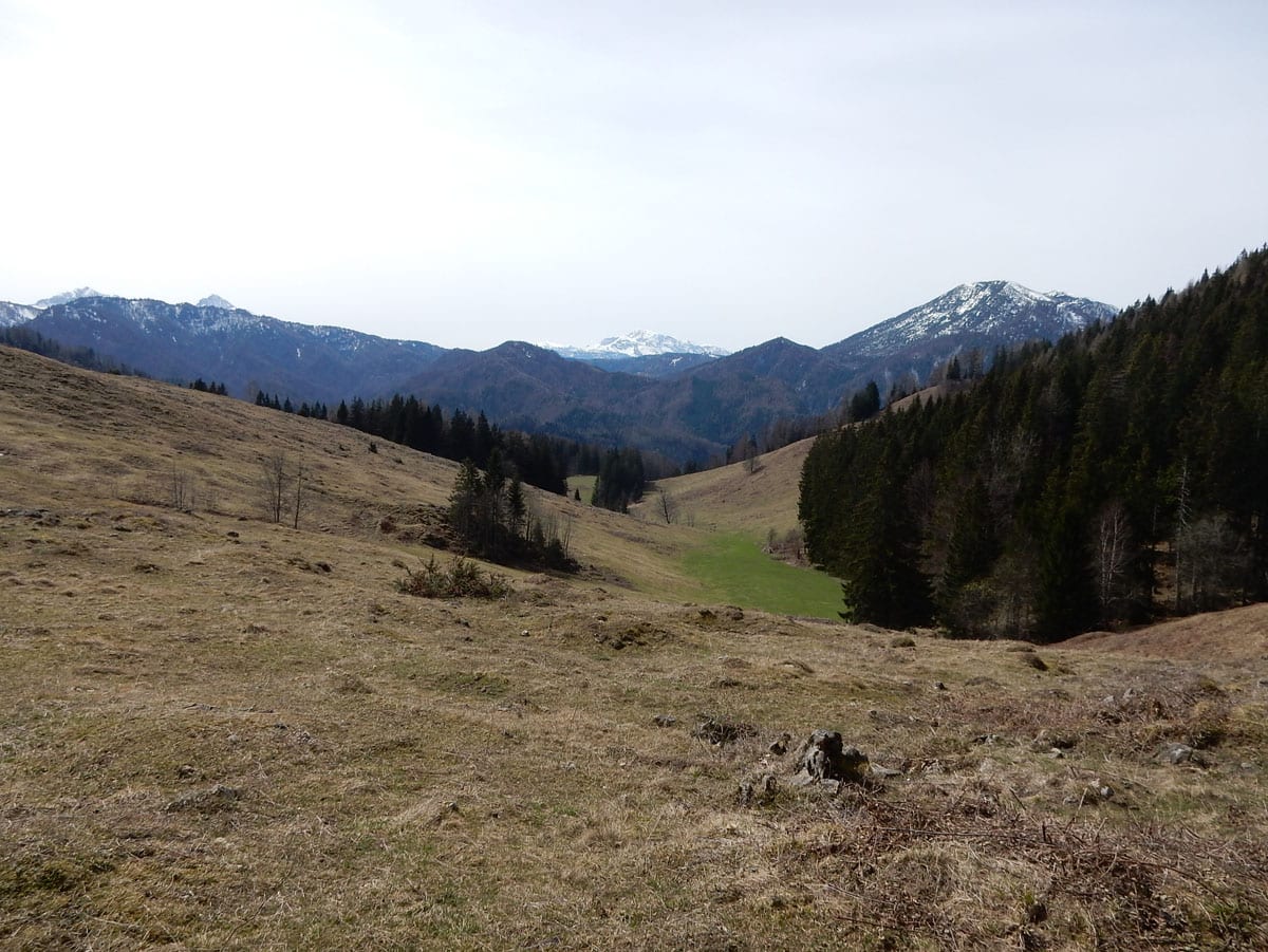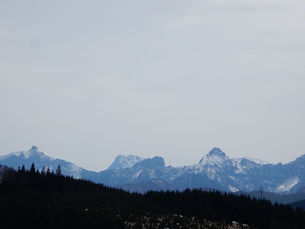 Auf der Anlaufalm herrscht dann paradisische Ruhe: fast keine Menschen, nur bei der Almhütte wird schon heftig gewerkt für die kommende Saison. Wir weichen daher zum Bauernkreuz (1063m) aus und genießen dort eine lange Pause bei Frühlingswetter und mit einem perfekten Ausblick auf die schneebedecken Berge.