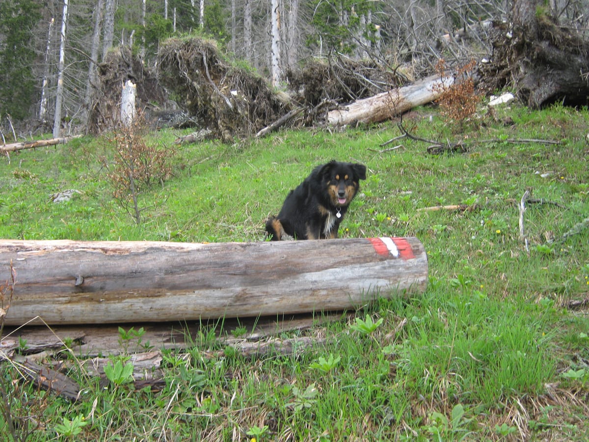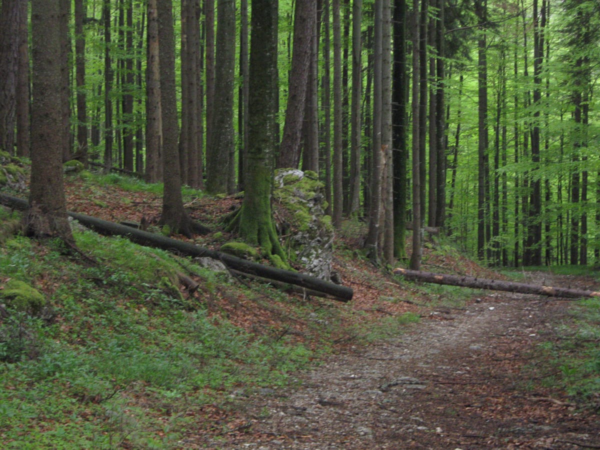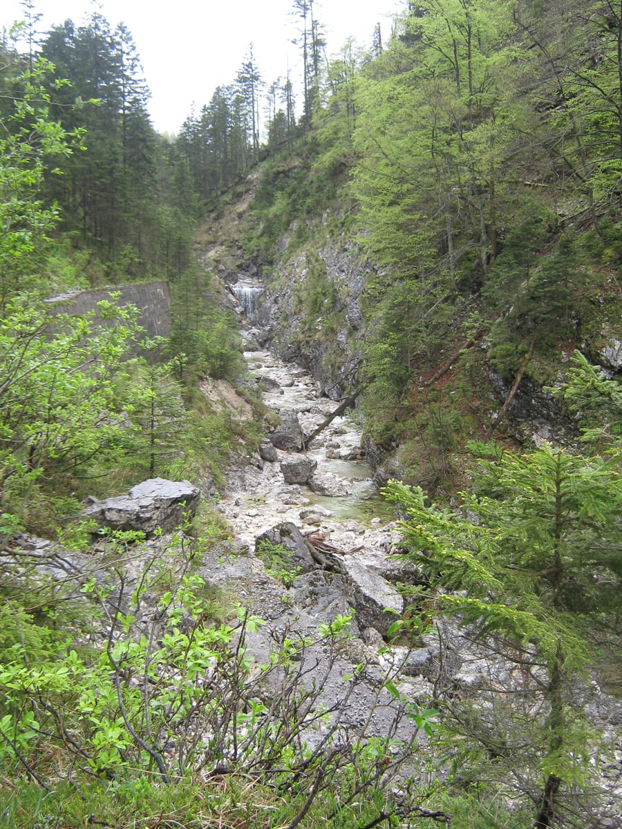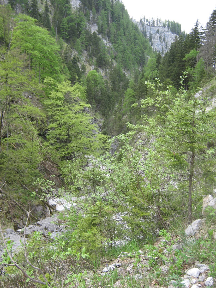 Na, egal; jedenfalls sind wir hier im Nationalpark Kalkalpen und das bedeutet: hier wird kein Baum weggeräumt,. alles bleibt liegen, wo es hinfällt. Das wiederum bedeutet, dass man oft einen anderen Weg suchen muß, weil der markierte versperrt ist.