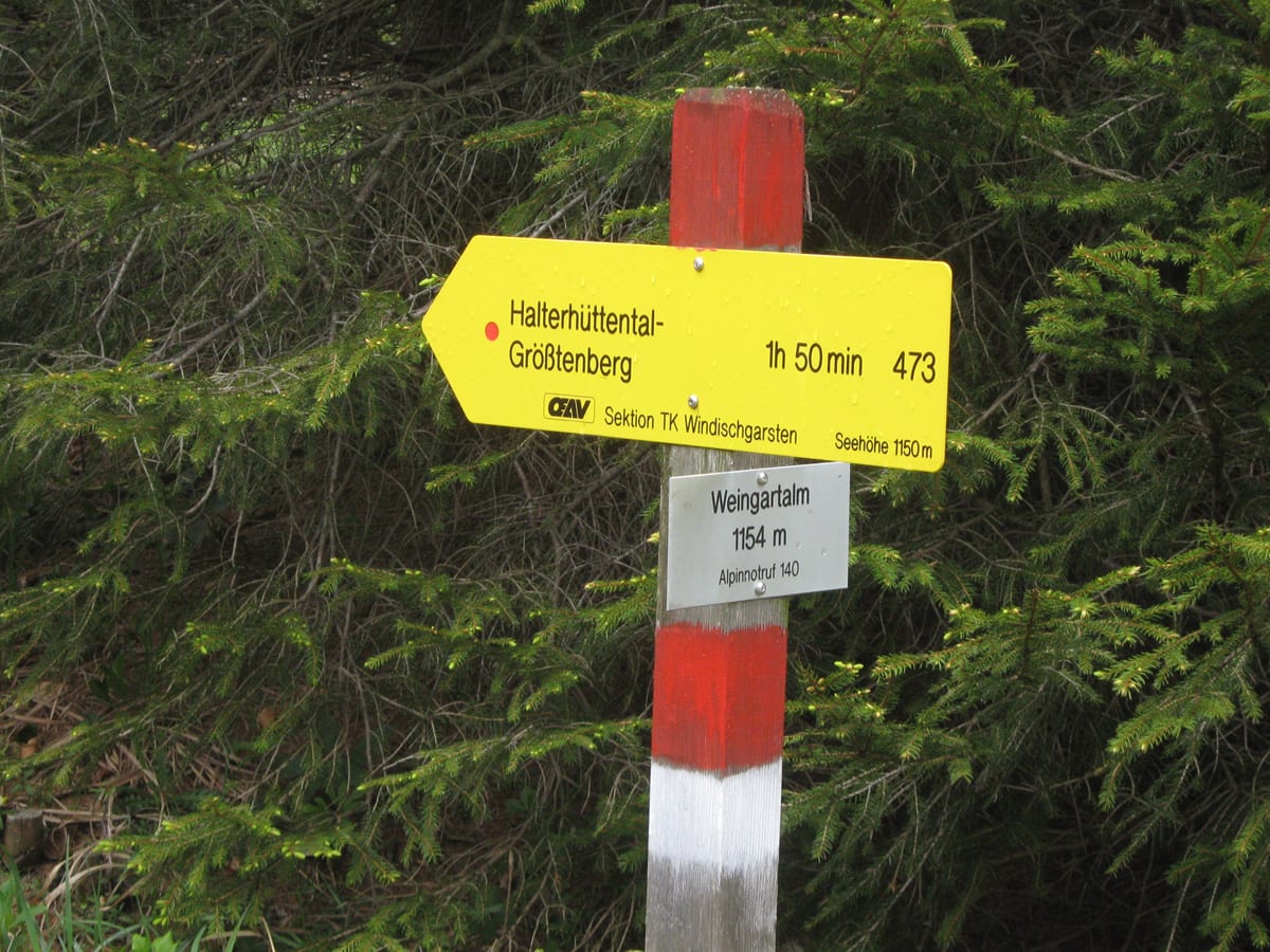 Also sind wir vom Bodinggraben Richtung Süden marschiert, entlang der Krummen Steyrling (der Weg führt manchmal weit oben über dem Bach, manchmal direkt daneben). Bei Steyrsteg (941m) kommt die Abzweigung zum Großen Größenberg. Zuerst eine Forststrasse bis zur Weingartalm (1154m), von dort geradewegs über einen Pfad bis zum Gipfel.
