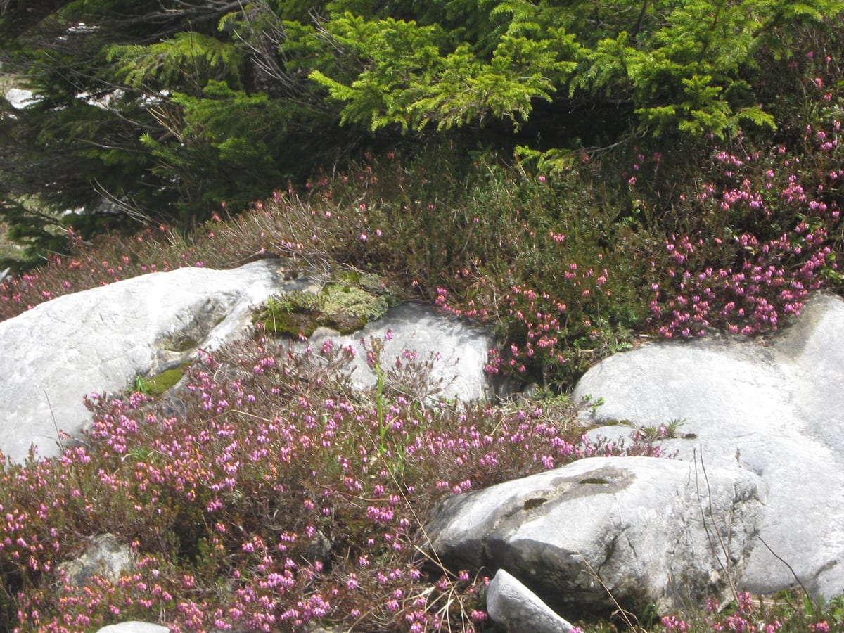 Nach ein paar 100 Höhenmetern dann das: Schneefelder! (dazu später eine Geschichte) und eine flach mit Sträuchern bewachsene Landschaft (auf den Fotos sieht man es, aber s’Herrl hat natürlich keine Ahnung, welche Pflanzen das sind).
