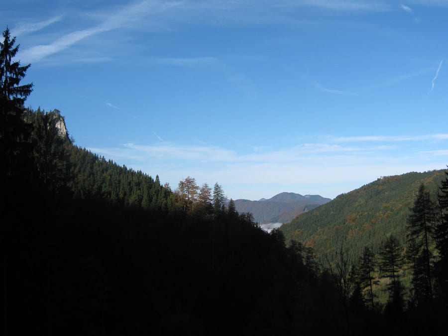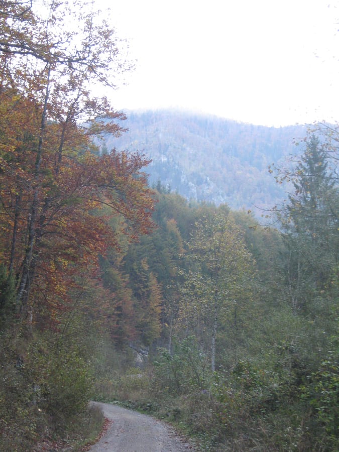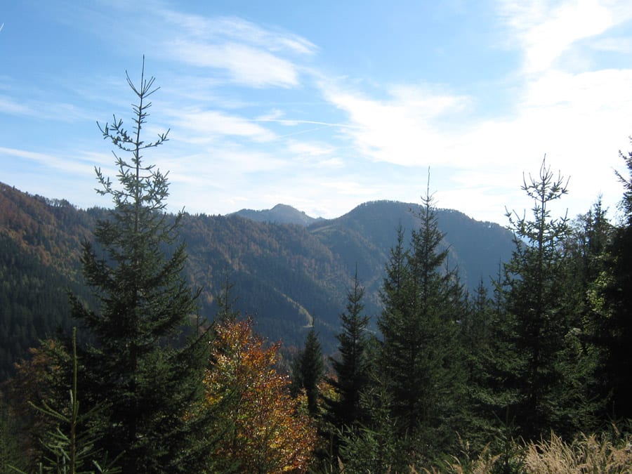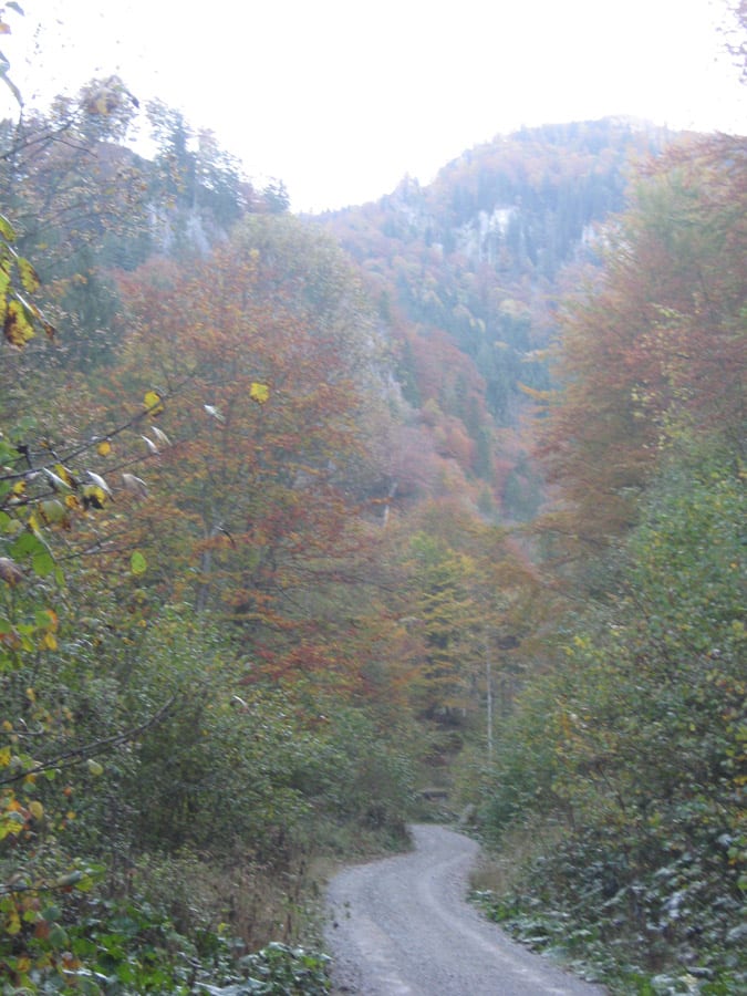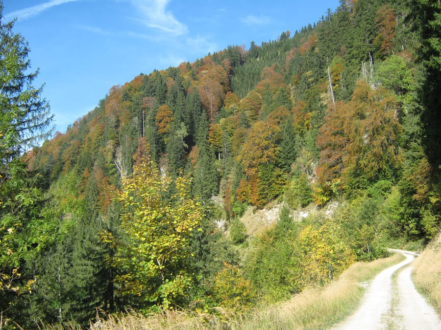 Der Reihe nach: vom noch nebligen Brunnbach aus (Parkplatz Brunnbachschule)  über die Forststraße Richtung Gschwendalm.  Dabei lassen wir zuerst die Abzweigung zur Gwendalm links liegen und ein paar Meter weiter die Abzweigung zur Kogler Alm (das ist die Mountainbike-Strecke) rechts liegen. Und aber hier war für den Rest des Tages nur mehr Sonne.