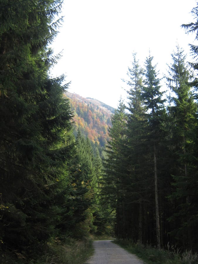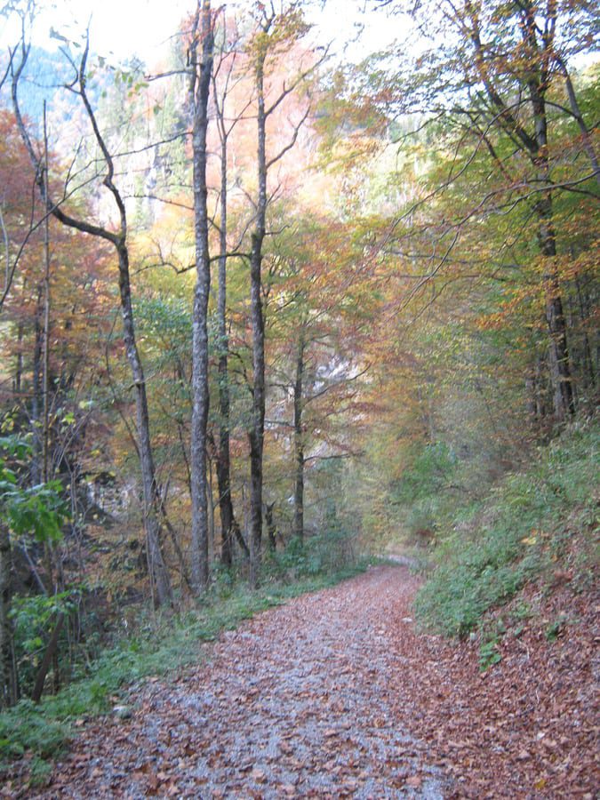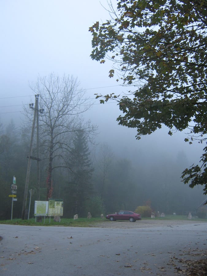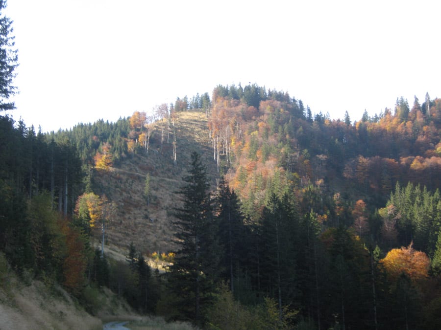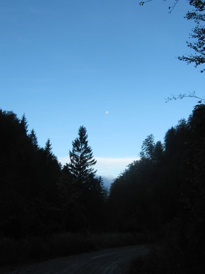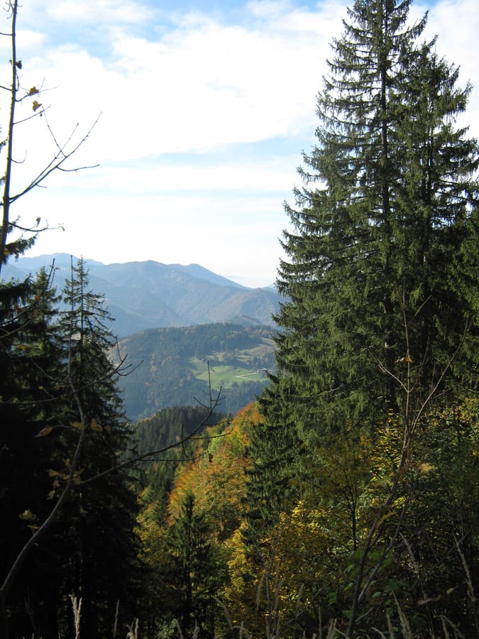 Der Reihe nach: vom noch nebligen Brunnbach aus (Parkplatz Brunnbachschule)  über die Forststraße Richtung Gschwendalm.  Dabei lassen wir zuerst die Abzweigung zur Gwendalm links liegen und ein paar Meter weiter die Abzweigung zur Kogler Alm (das ist die Mountainbike-Strecke) rechts liegen. Und aber hier war für den Rest des Tages nur mehr Sonne.