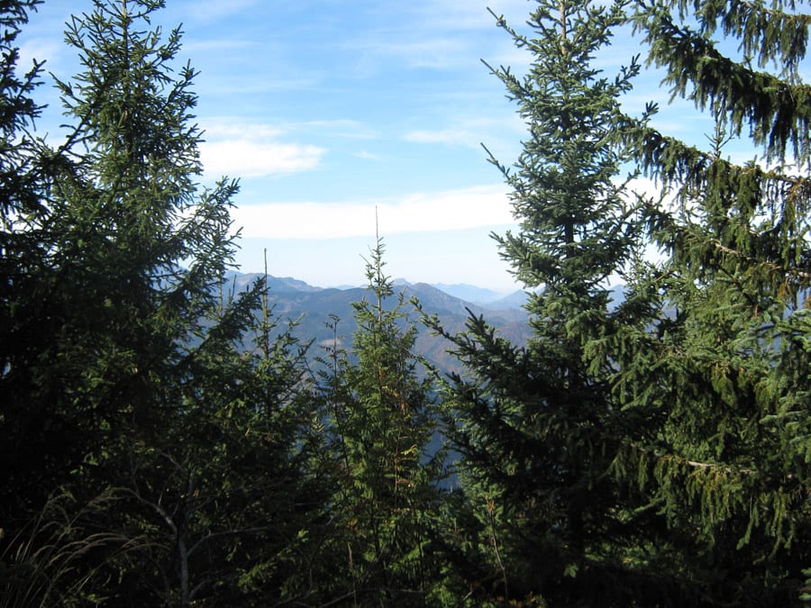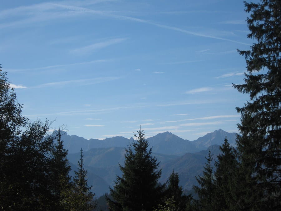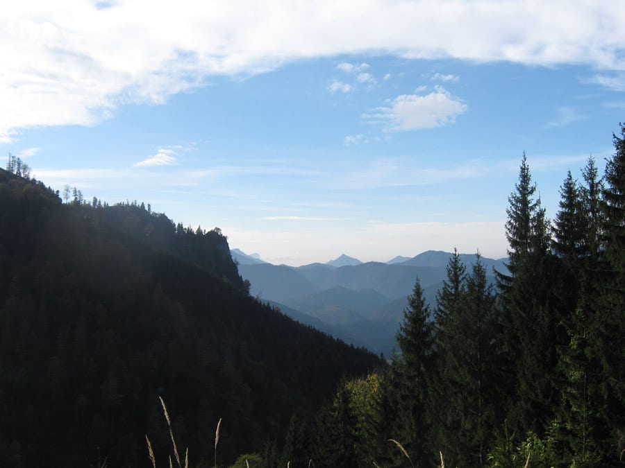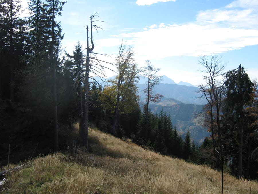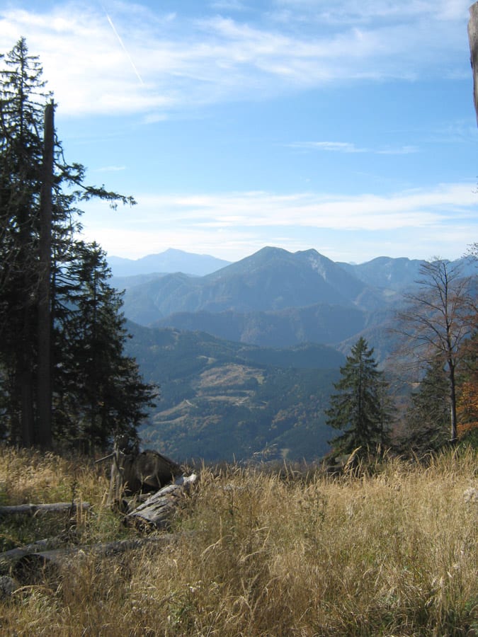 Oben angekommen ist man aber noch nicht beim Gipfel. Noch muss man über einen Kamm ein bisserl auf und ab bis zum Höhenberg (1.320m). Und auf dem Weg merkt man, dass sich die Wegsuche 100%ig ausgezahlt hat. Die Aussicht nach Westen übers Hintergebirge und das Sengsengebirge und nach Süden zu den Haller Mauern und zum Gesäuse ist wirklich super. Der Gipfel ist dann bewaldet, da kann man gut pausieren.