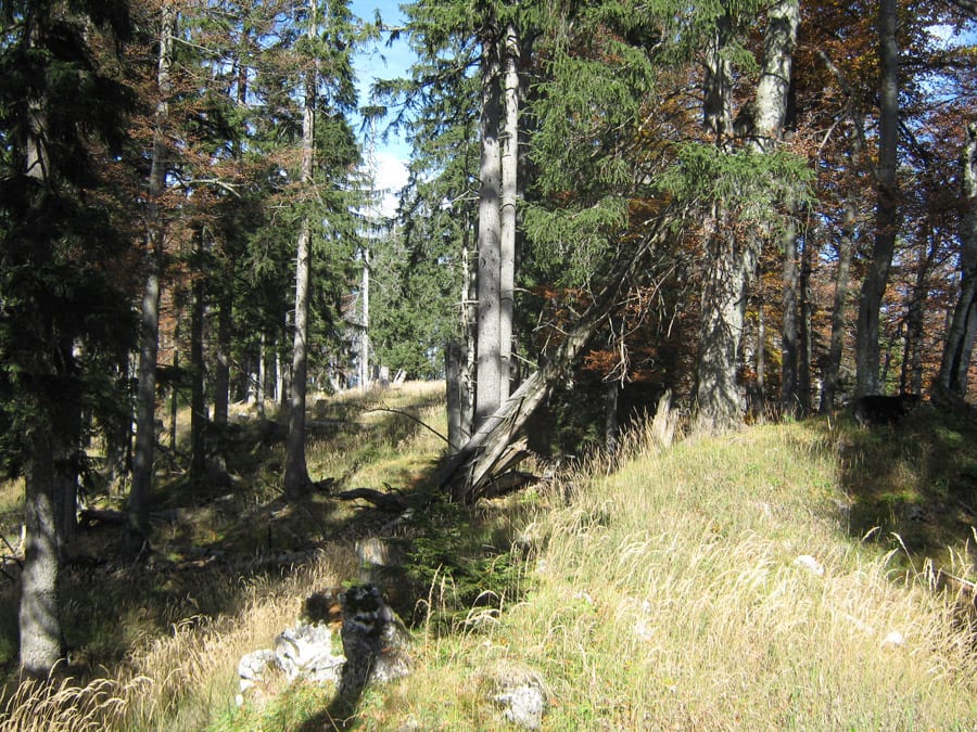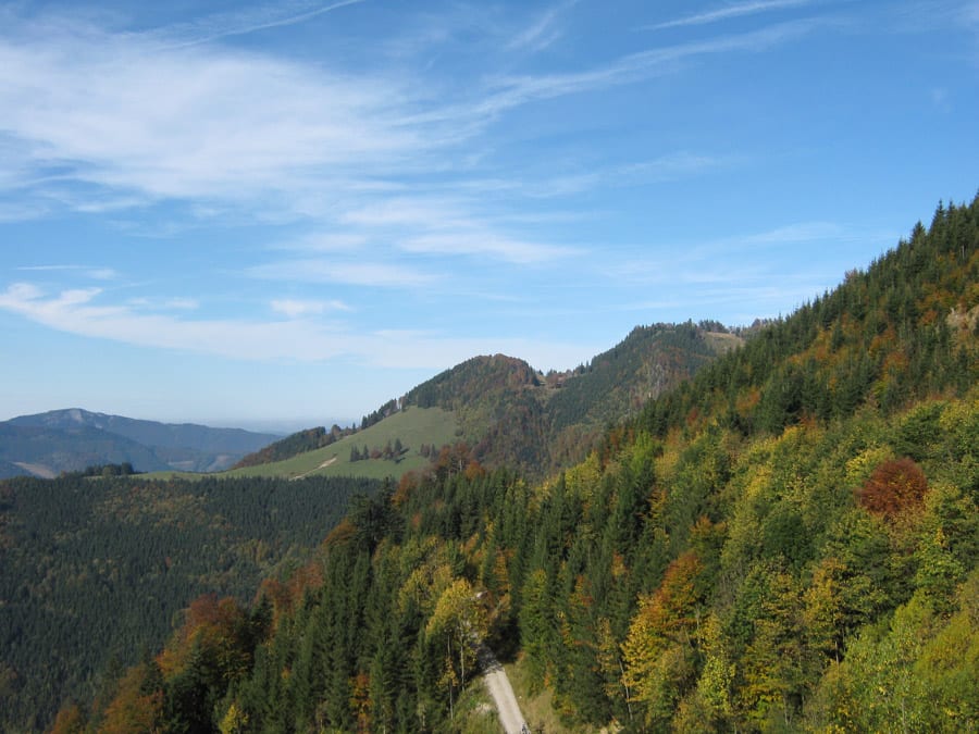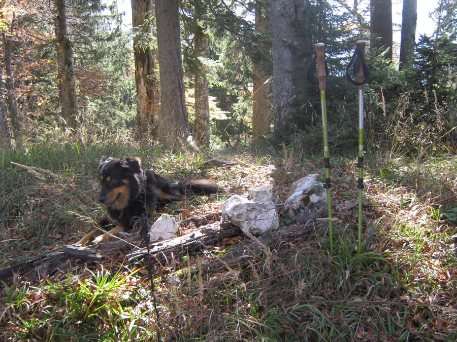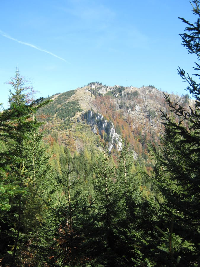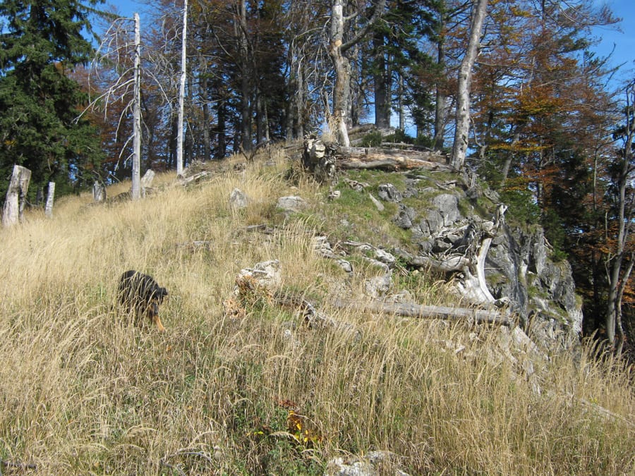 Und jetzt erklär ich die Sache mit dem abweisenden Kerl. Bis ca. 1.100hm kommt man über die Forstraßen (und Abkürzungen) recht einfach hinauf. Dann aber hat der Höhenberg rundherum entweder fast senkrechte Felsen oder derart steile Hänge, dass nicht einmal ich raufkommen würde … ihr könnt euch vorstellen, wie es dem Herr dabei erginge 🙂