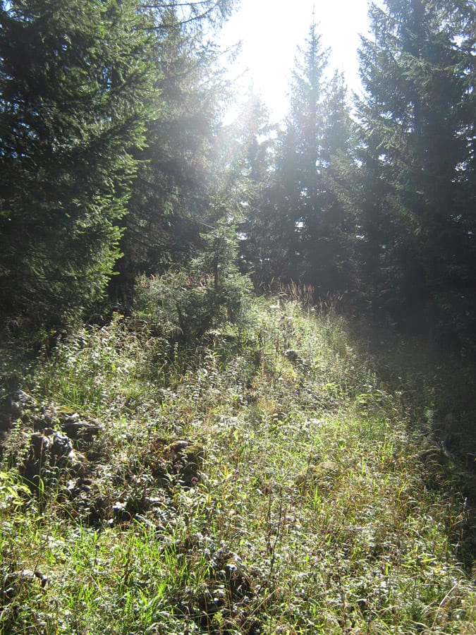 Wir wollen ja direkt hinauf zum Höhenberg. Das geht noch ein ganzes Stückerl über die Forststraße, bis wir eine Abkürzung durch Wald und Wiese nehmen.
