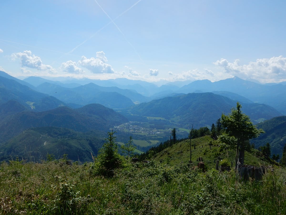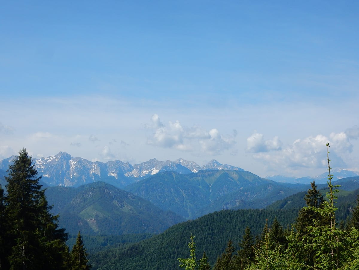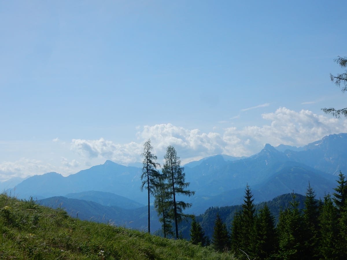 Also gibt es Rundum-Fotos (beinahe ganz rundherum – der Ausblick von hier ist wirklich toll) aber die Jause dann ein paar Meter weiter unten in einem kleinen Waldstück mit Schatten.