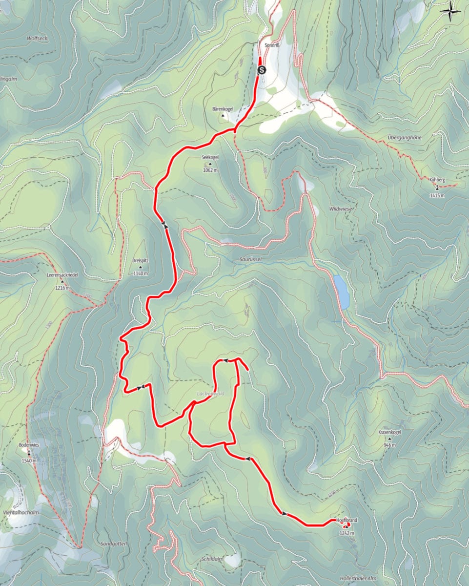 Heute ist es ganz anders: Sonne und recht warm vom Start weg. Trotz des perfektem Wanderwetter sind wir wieder einmal ganz einsam in der Landschaft (erst auf dem Rückweg begegnen uns ein paar Menschen). Der Weg zum Hochbrand ist nicht aufregend, immer recht gemächlich bergauf und heute sind sogar die Kühe auf der Niglalm auf den vom Weg entfernten Teil der Alm gesperrt. Also nicht einmal hier Aufregung!