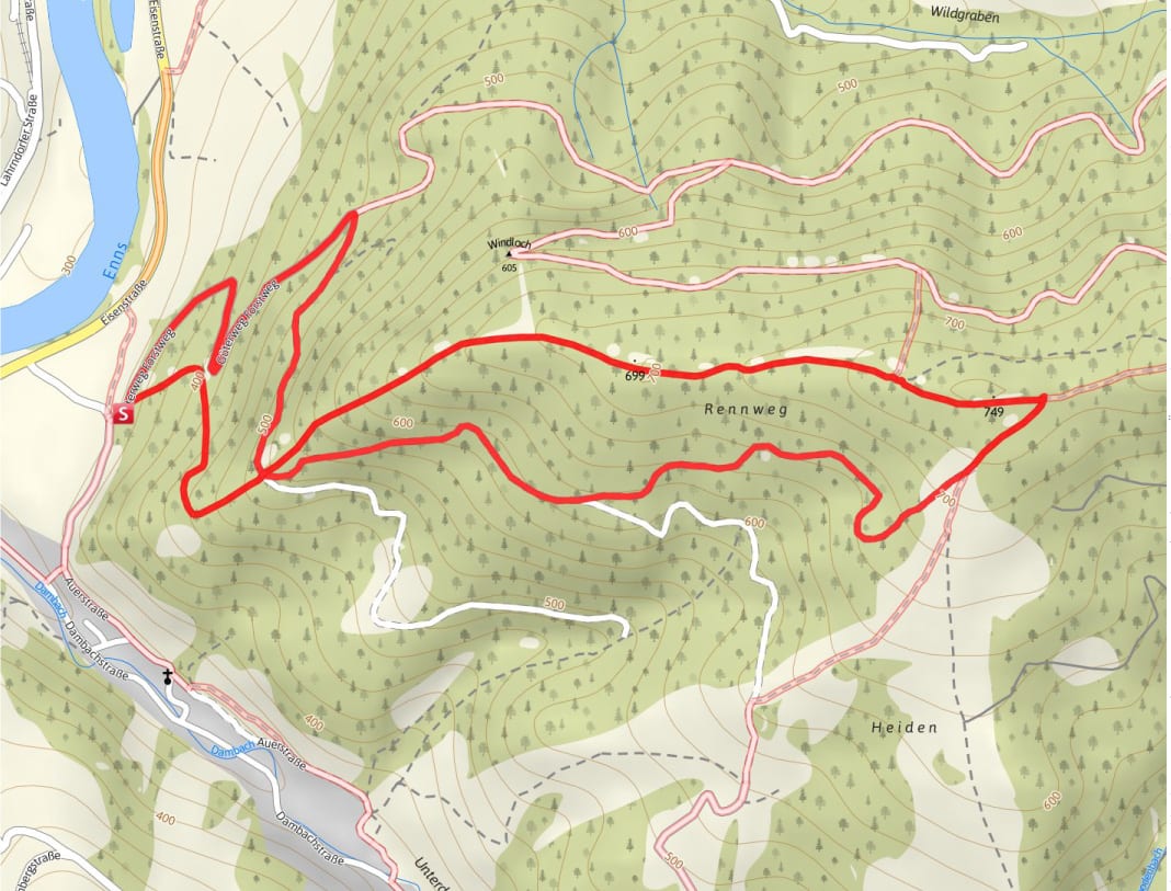 Start ist St. Ulrich und dann zuerst über die Forststraße bis zum Pfad über die Nase bis hinauf zum Windloch. Das ist der steile Abschnitt, ab dem Windloch wird es flacher. Dann führt der Pfad ein bisserl auf und ab bis hinüber zum Damberg.