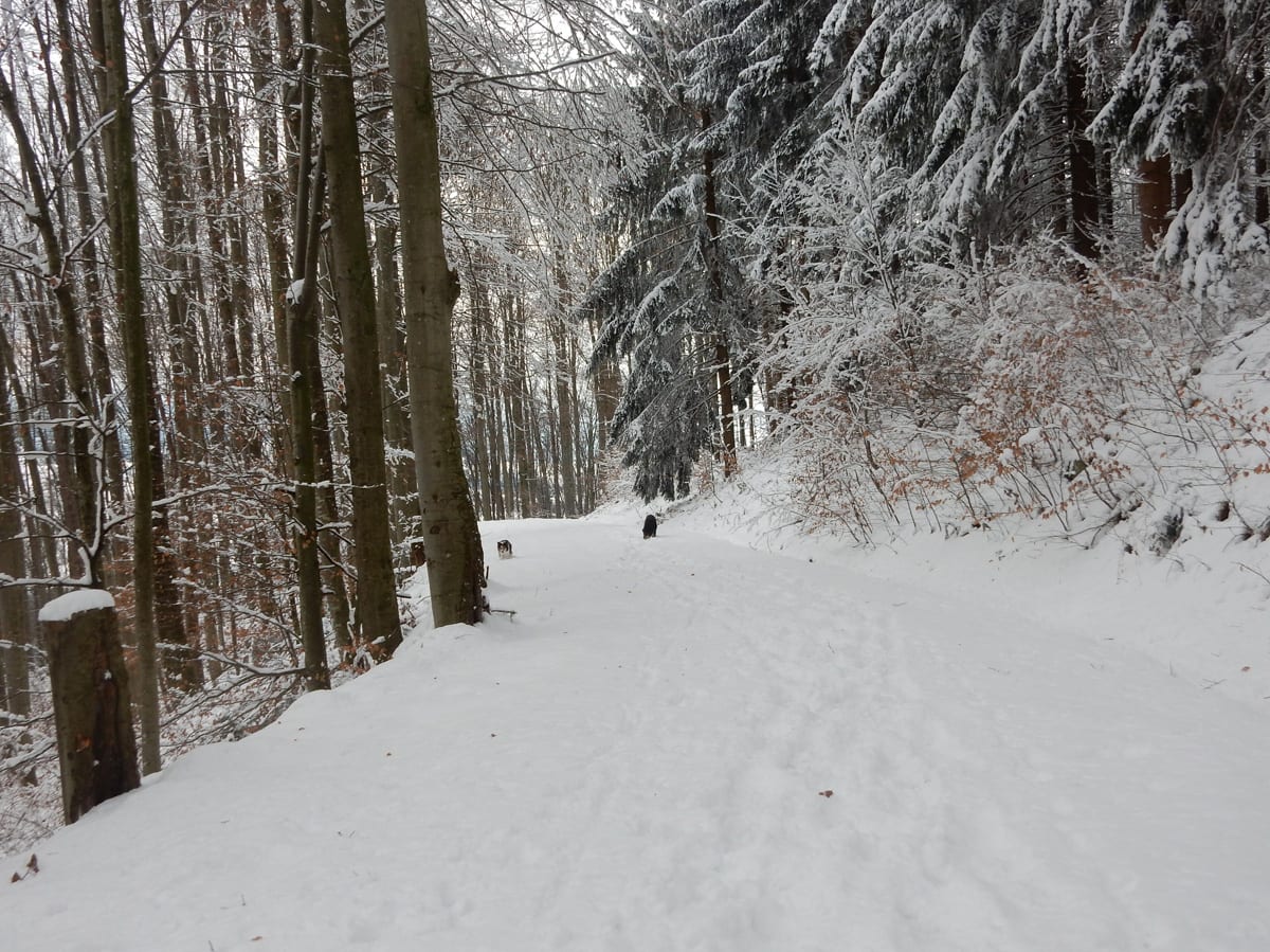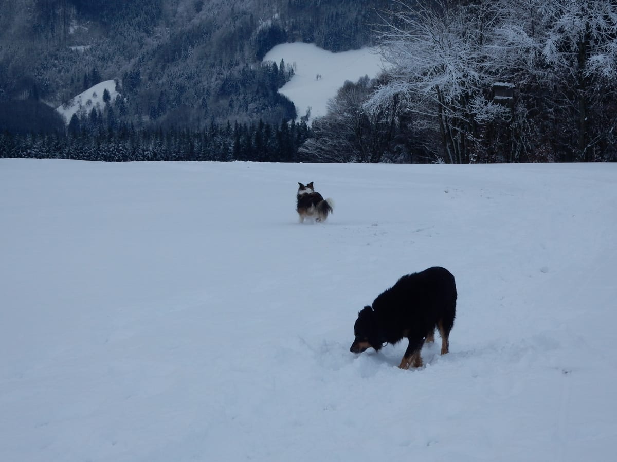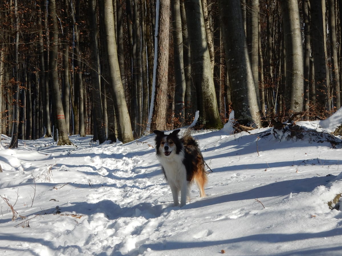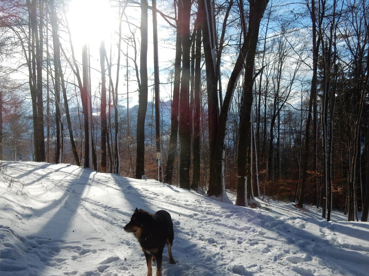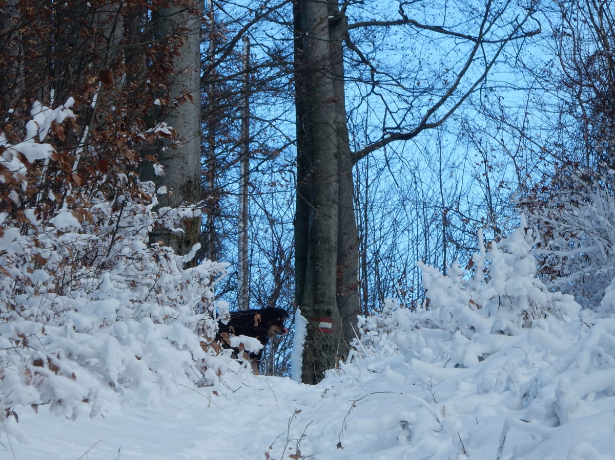 Weiter oben liegt viel mehr Schnee als vor ein paar Tagen. Begonnen haben wir unten mit 5cm, am höchsten Punkt bei ca. 750m sind es mehr als 20cm. Das ist dann zwar anstrengend, aber bei der Kälte (-10°) macht es gar nichts, wenn man ein bisserl schwitzt.