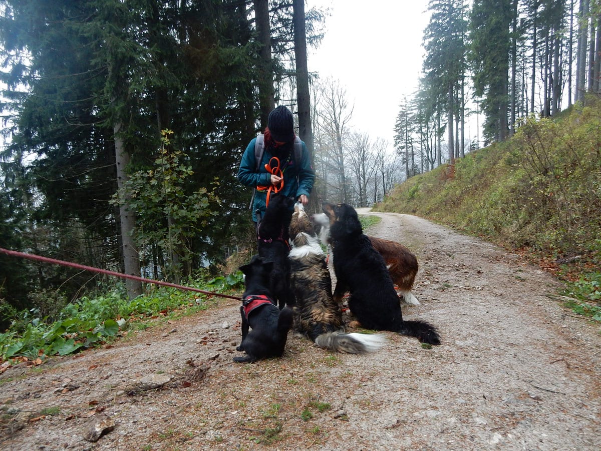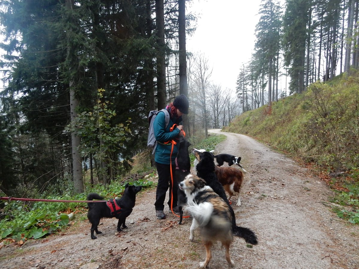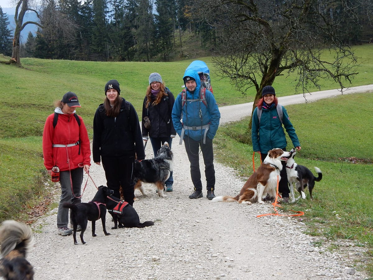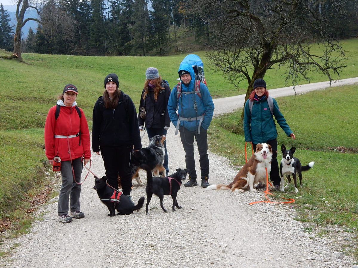 Heute ist auch der zweite Henry mit dabei und damit sind wir (Vierbeiner) mit 8 ganz knapp in der Überzahl (weils nur 7 Menschen sind): Nera & Nellie mit Regina und Melanie, Gem & Henry mit Lisa, Emily & Luna mit Sandra, Marie und Leo. Ja genau: und die Ronja, s’Herrl und ich.