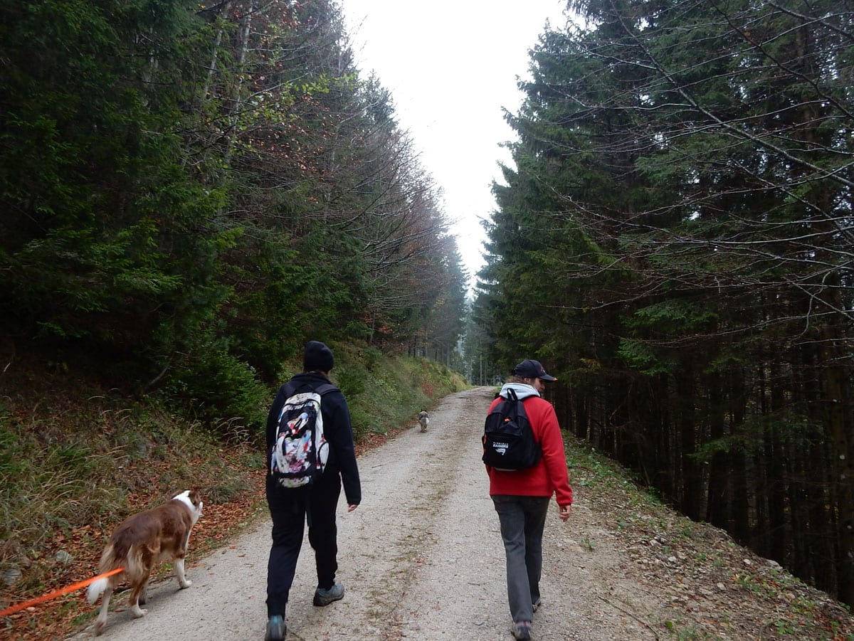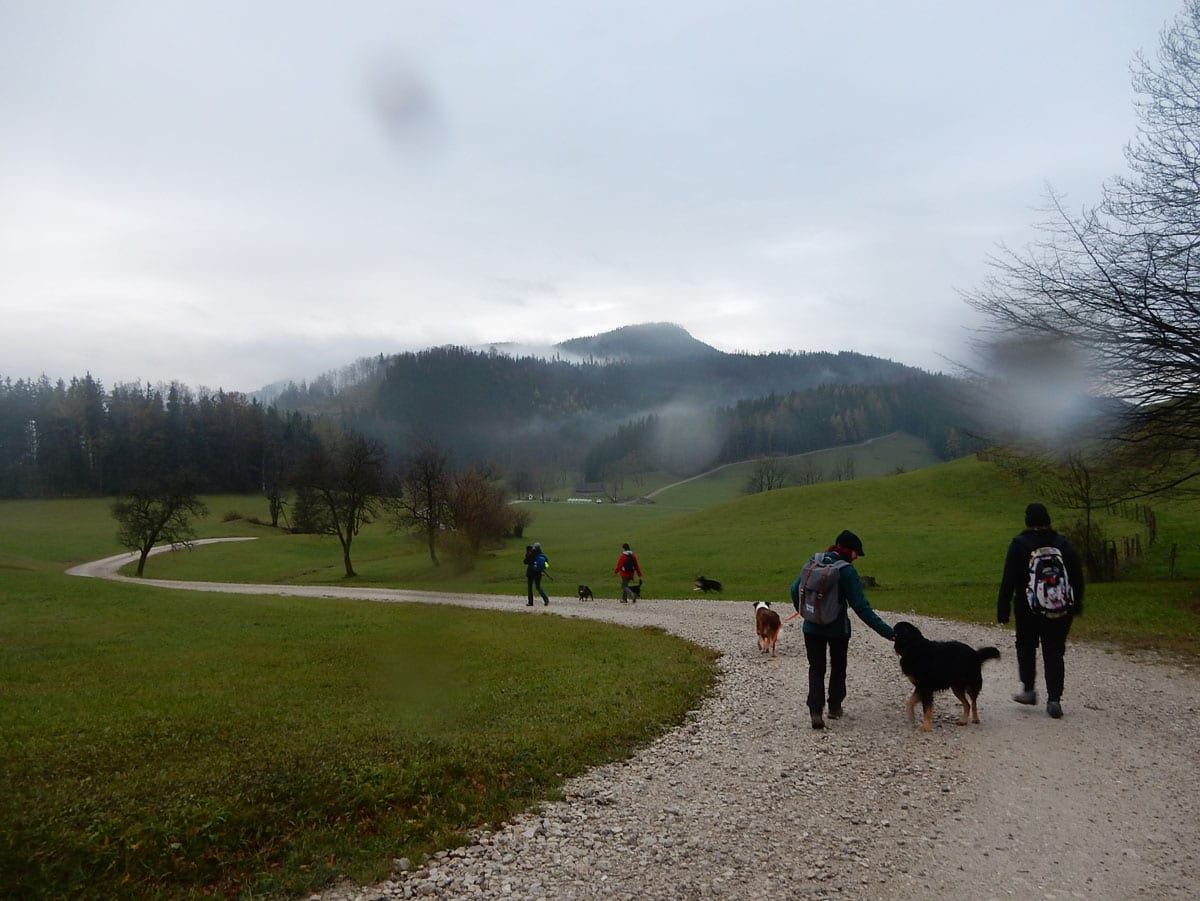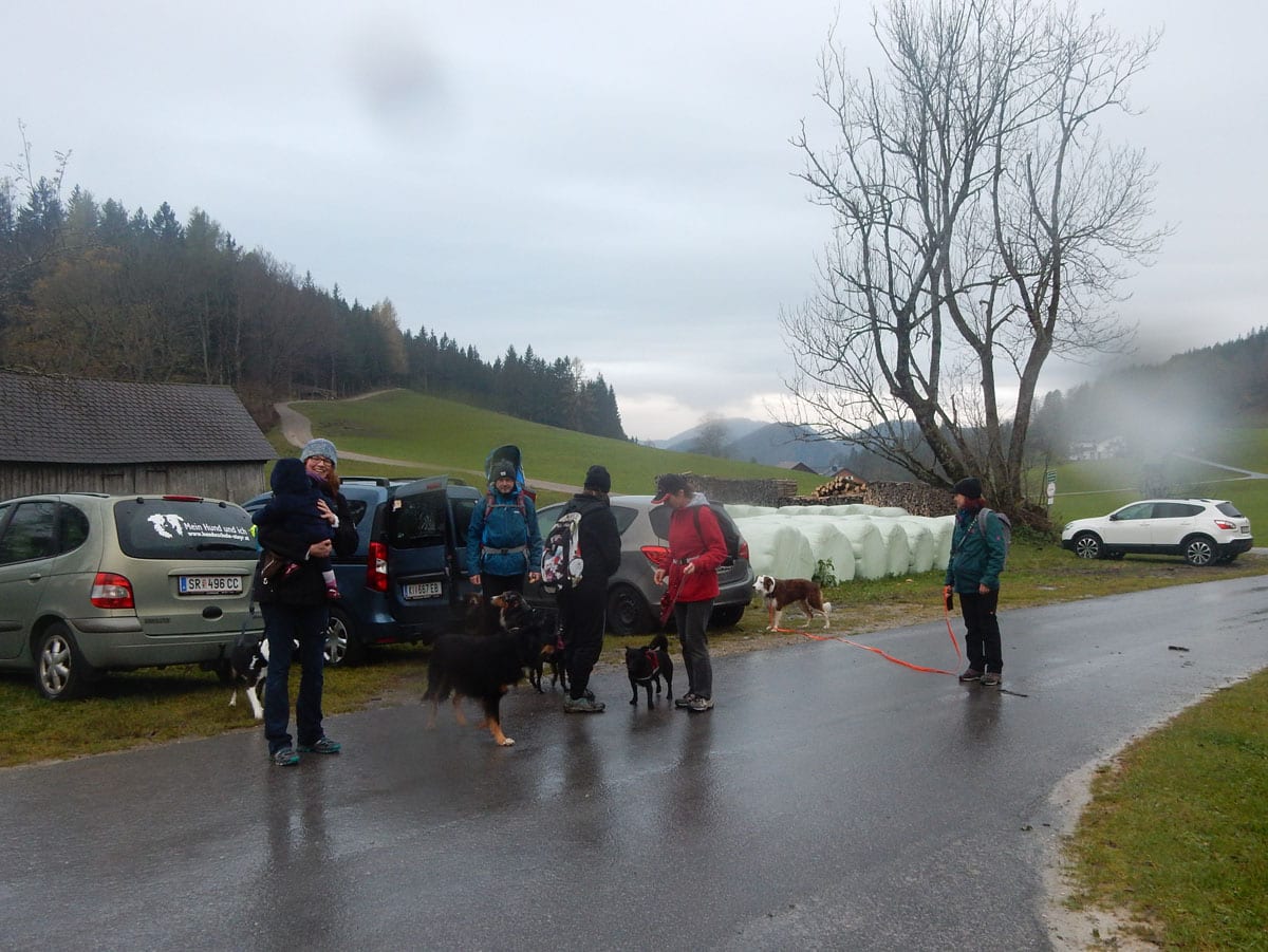 Bei Allerheiligenwetter (regnerisch, ein bisserl Wind, Nebel und Wolken) steht schon der zweite Hunde-Wandertag innerhalb von 3 Wochen auf dem Programm. Die Lindaumauer ist deshalb das Ziel, weil man von dort entweder (bei schönem Wetter – also ein anderes Mal) einen tollen Ausblick hat, oder über die Forstwege auch bei schlechterem Wetter gut hinauf kommt.