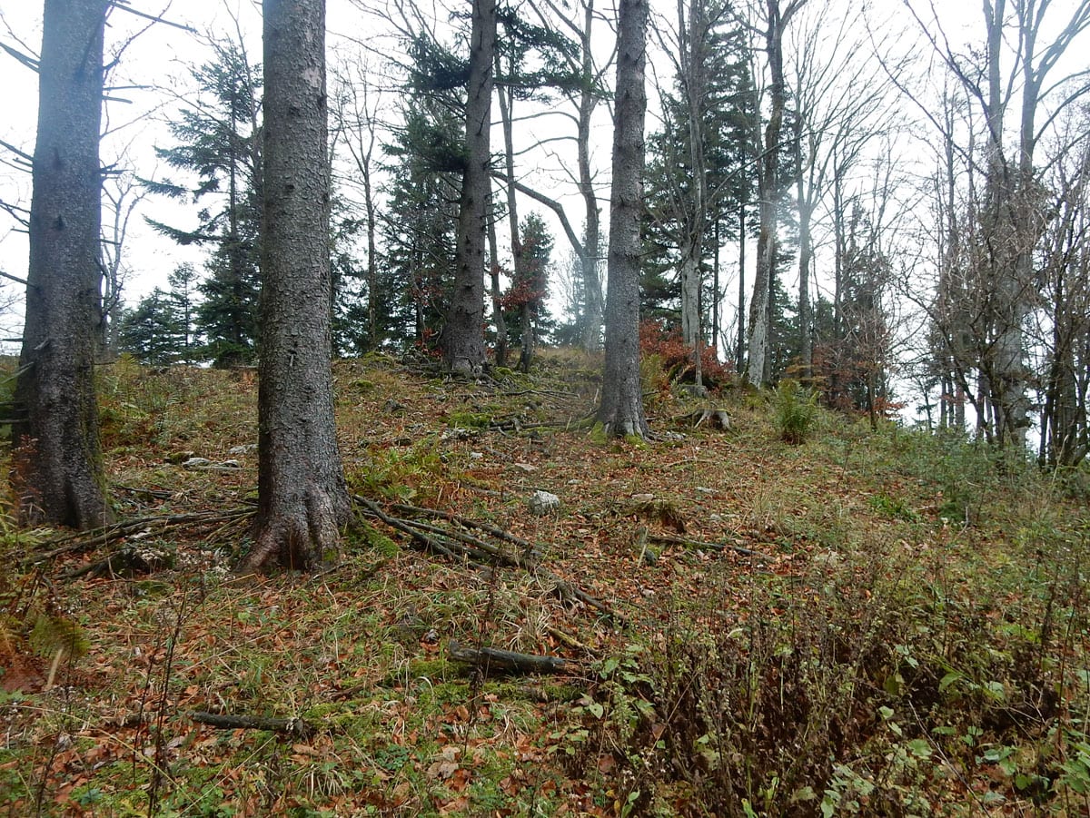So kommen wir bequem und beinahe ganz ohne auf andere Lebewesen zu treffen über die Forststraße bis zum Gipfel. Dort ist es für uns alle zusammen etwas eng und rutschig; und außerdem wegen des Windes auch gar nicht so gemütlich und deshalb machen wir Pause auf der Lichtung ein Stück unterhalb.
