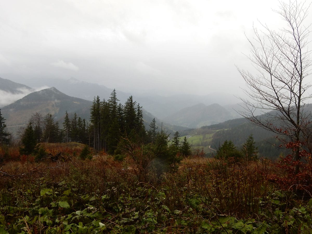 Zurück nehmen wir dann auch wieder die Forststraße, denn über den Wanderweg wäre es viel zu rutschig. So bleiben wir bis zum Schluß recht sauber und nur ein bisserl nass. Zurück bei den Autos auf der Lurnwiese hat des dann nur 3°(!) aber so ganz ohne Wind fällt das nicht wirklich auf; und „dank“ der Winterzeit (auch wenn die gar nicht so heisst) beginnt es um 16:45 Uhr schon zu dämmern.