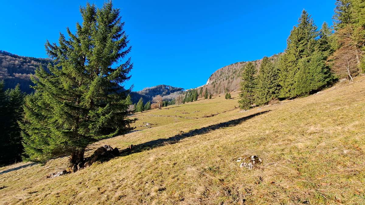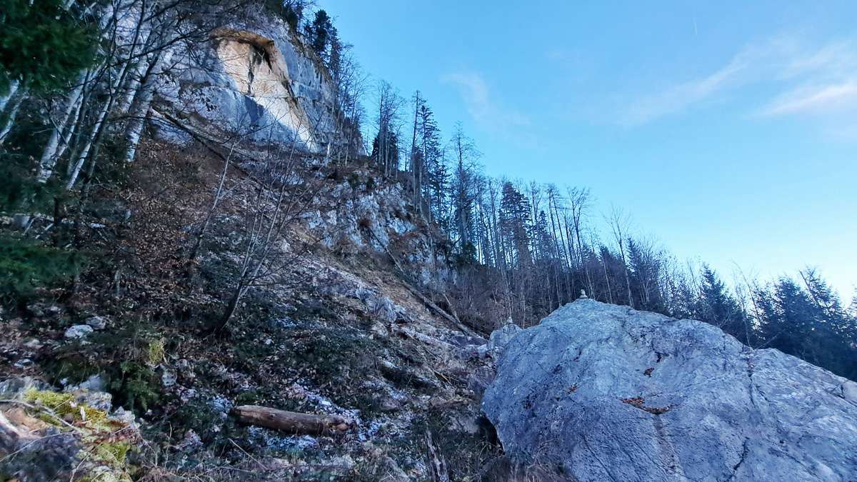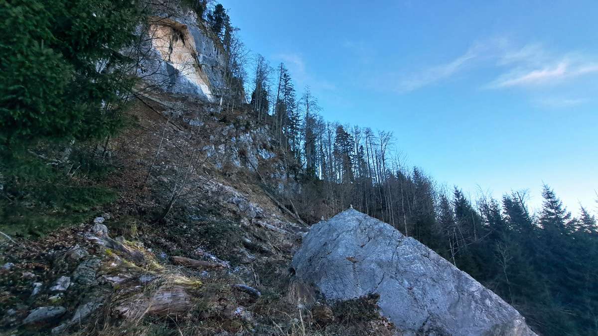 Rundherum wandern wir ein bisserl durch die Gegend und kommen dabei zu einem riesigen Felssturz unterhalb der Ackermäuer – nur sieht man auf den Fotos leider nicht wie groß der Felsen wirklich ist, der da heruntergekommen ist. S’Herrl schätzt den Brocken auf 15x5x10 Meter – ziemlich schwer, so ein Ding – der oben im Ganzen aus der Feldwand herausgebrochen ist.