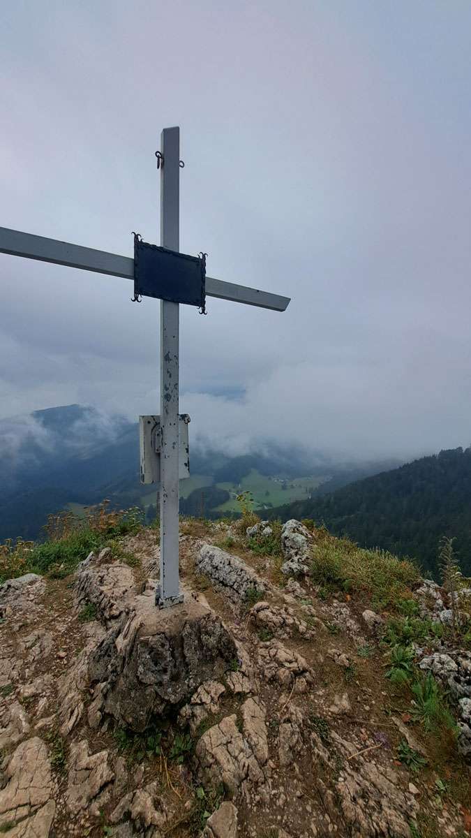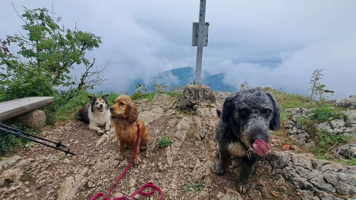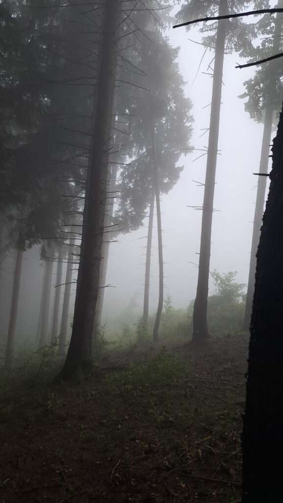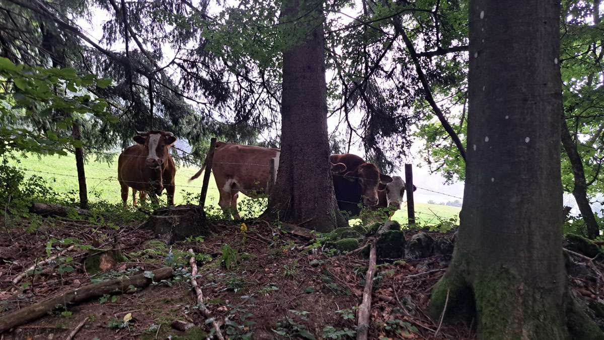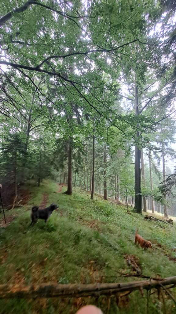 Bei einer kleinen Kapelle führt ein Weg recht gemütlich bergauf und mündet in die Forststraße, die wir schon von der alten Route kennen. Nur sind wir jetzt sehr nahe beim Aufstieg zum Hiebberg (1.018m) und deshalb auch sehr schnell oben. Schneller wäre es gegangen, hätte uns nicht mitten drin ein ordentlicher Regenguss erwischt – Regenjacken auspacken und anziehen dauert immer so lange bei den Menschen …