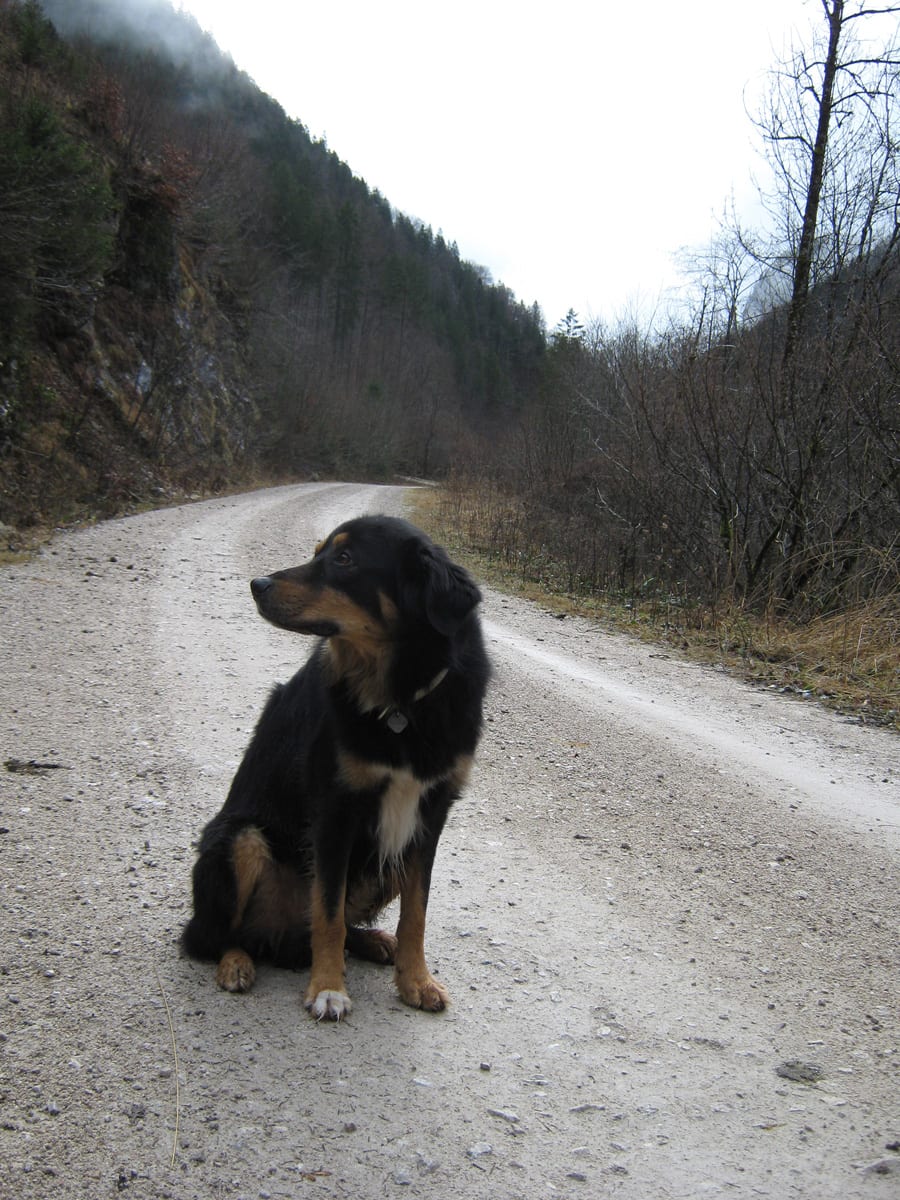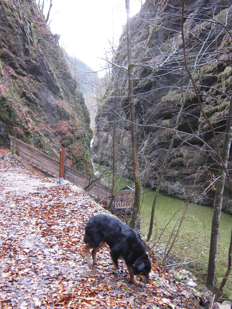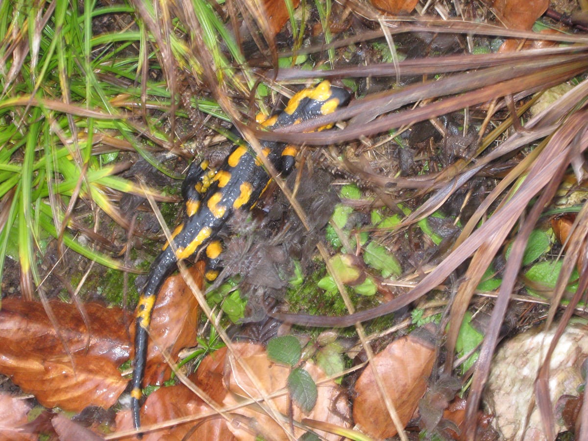 Bei der Großen Klause konnte s’Herrl gerade so ausweichen … nicht einem Felsen sondern einem Feuersalamander, der dort im einzigen Sonnenstrahl gelegen ist.