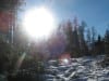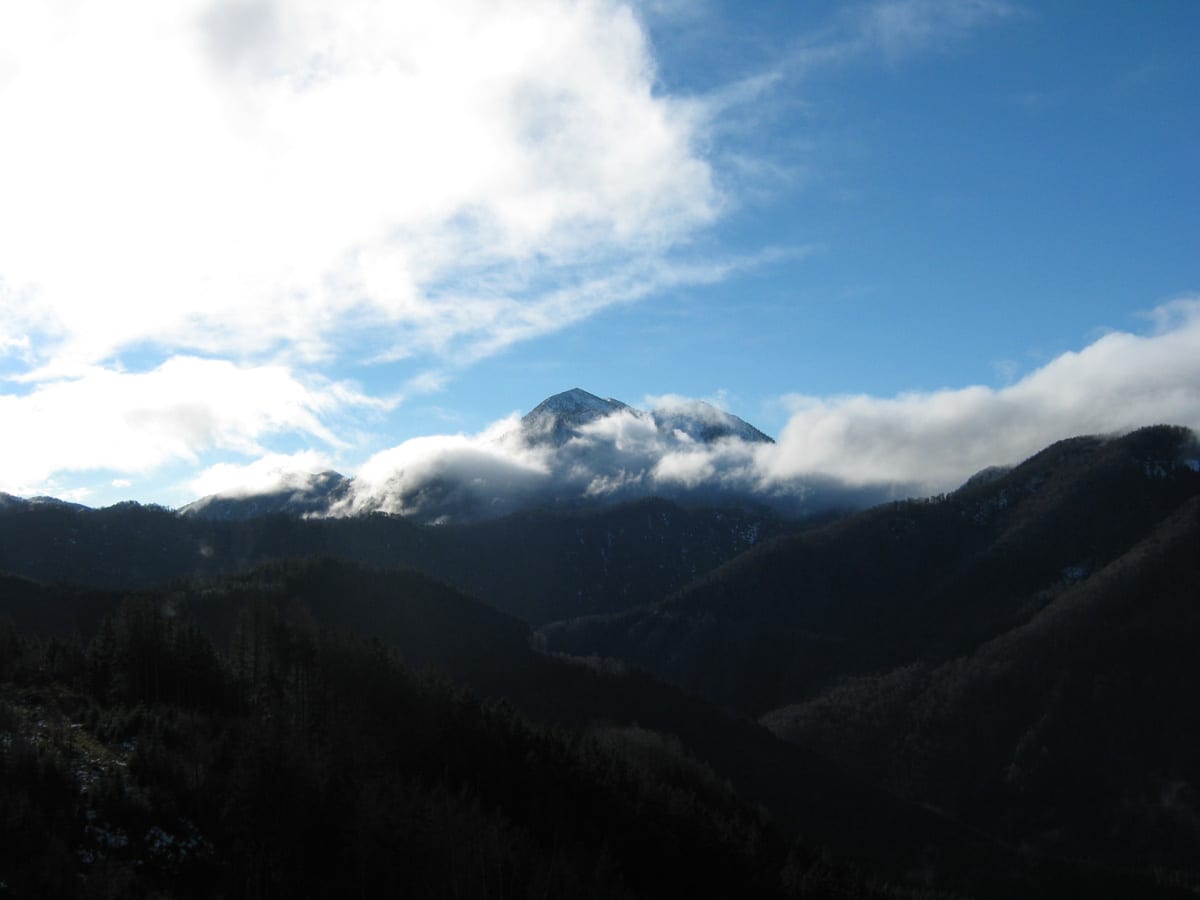 Nach 3 1/2 Stunden war es dann soweit: Sonne und ganz weit weg in der Ferne der frisch überzuckerte Gipfel des Almkogel.