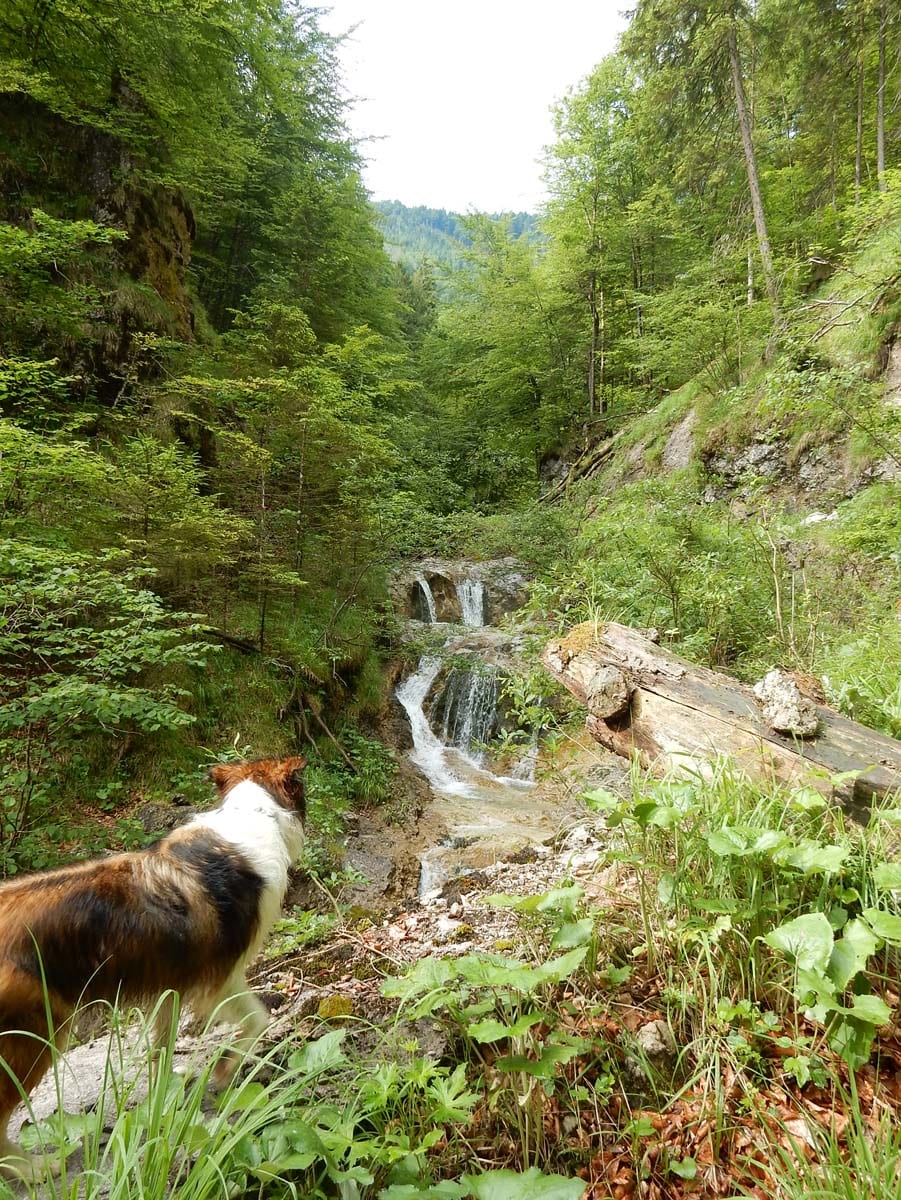 Also mit einem Satz: eine ausgesprochen hundegerechte Tour. Eine ausgediente Forststraße, die langsam zuwächst und über die sich immer mehr umgefallene Bäume und Felsbrocken stapeln führt rund um den Berg hinauf. Dabei gibt es Ausblicke in beinahe alle Himmelsrichtungen und wir sind mitten drinnen in unglaublich viel Grün.